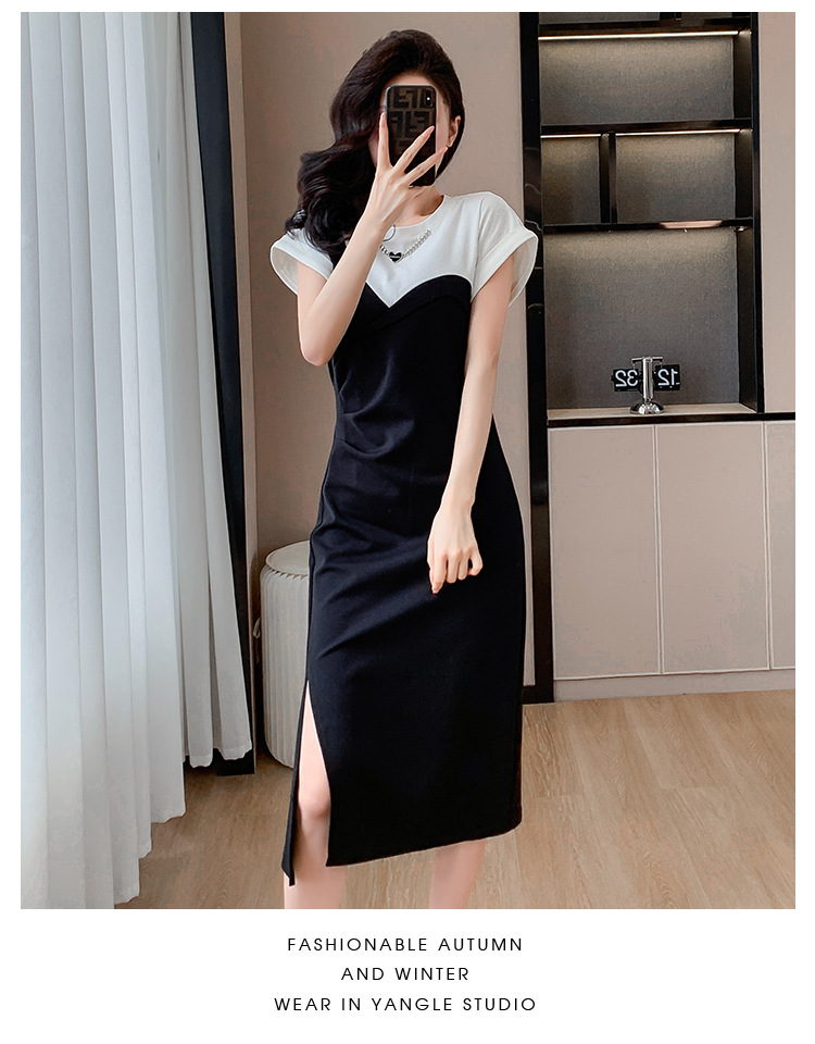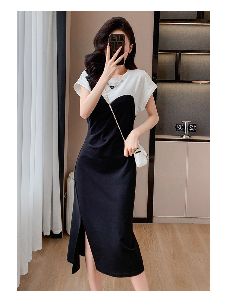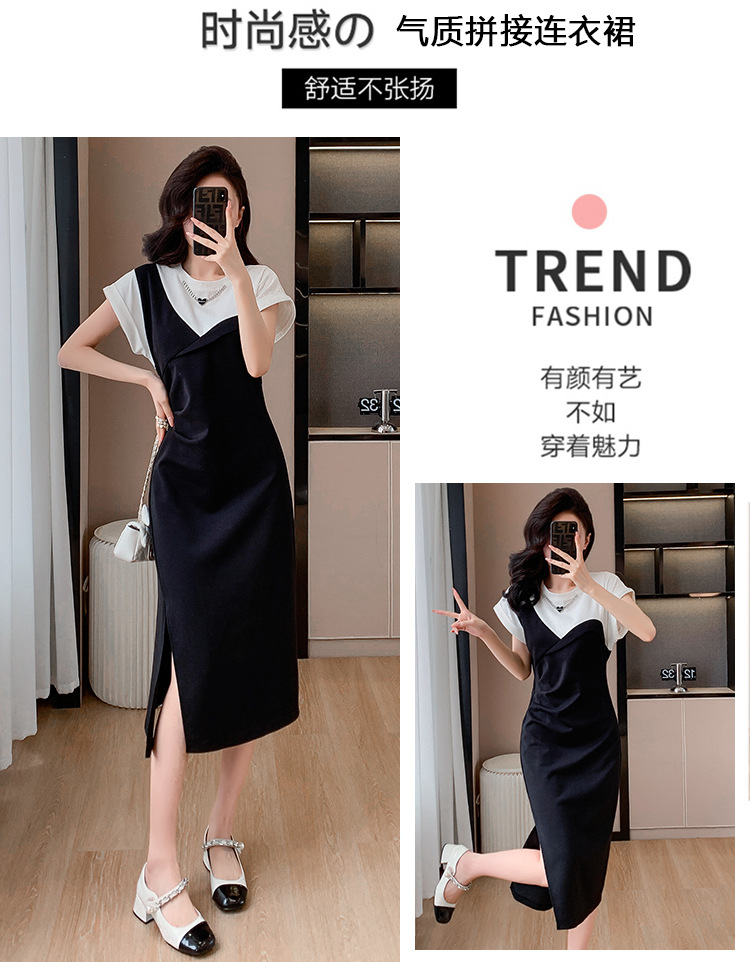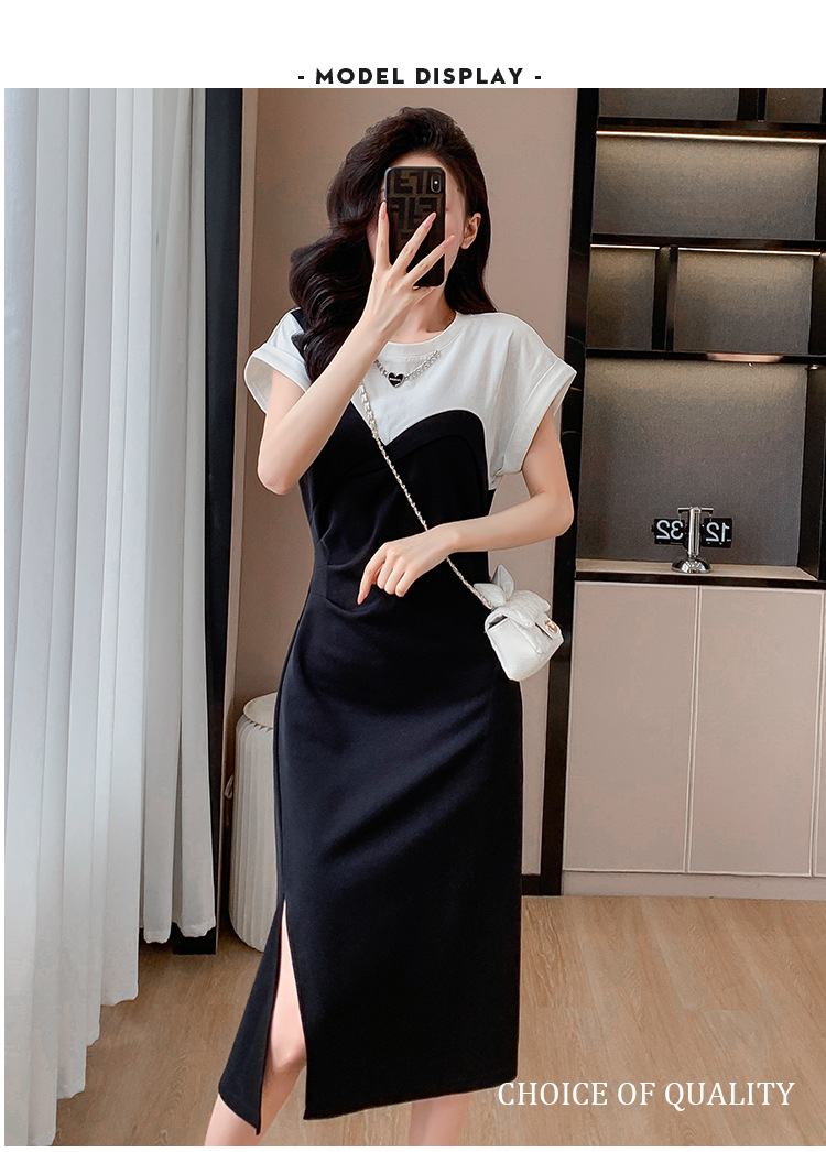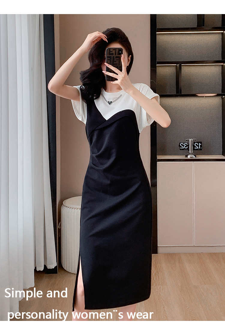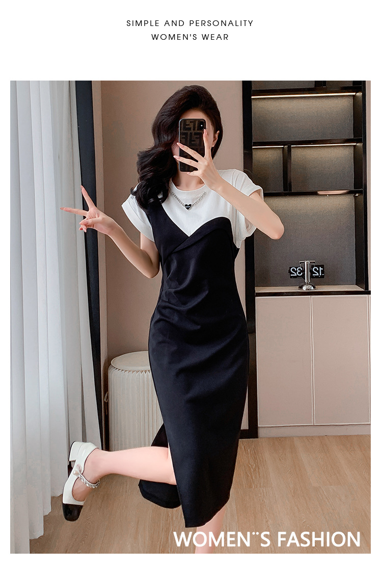 고급 스티칭 원피스 여성 2024 년 여름 새로운 불규칙한 통풍구 대비 반팔 A 라인 허리 스커트스토어 가기