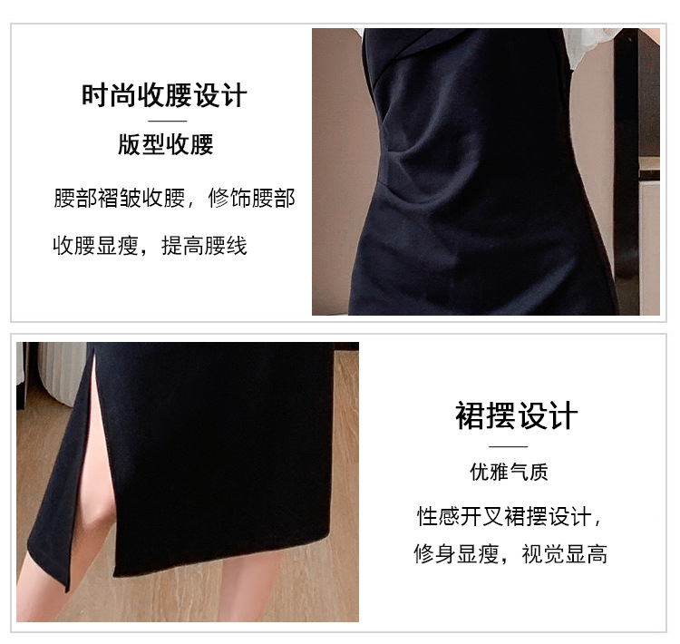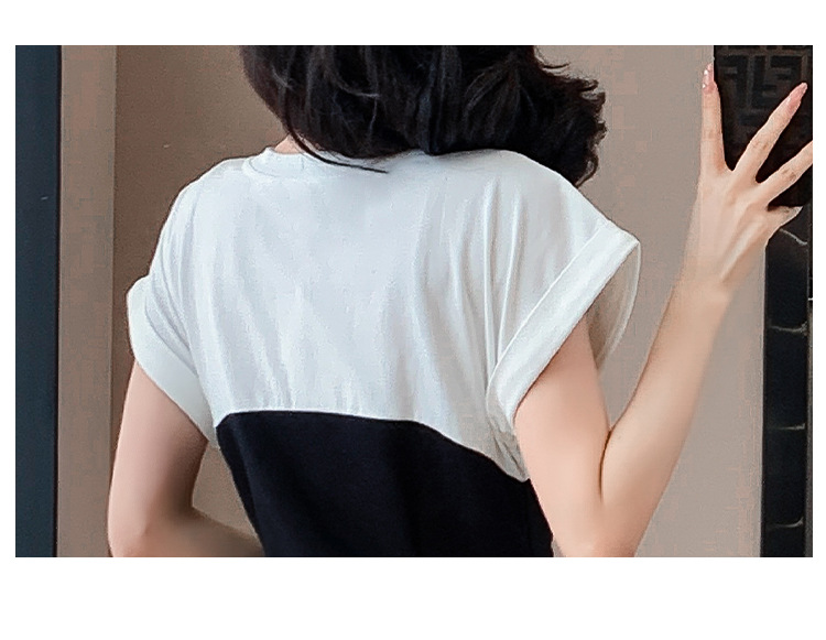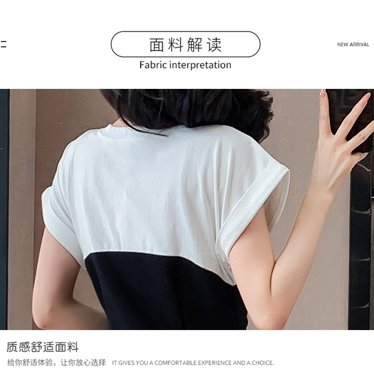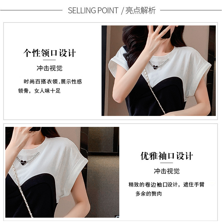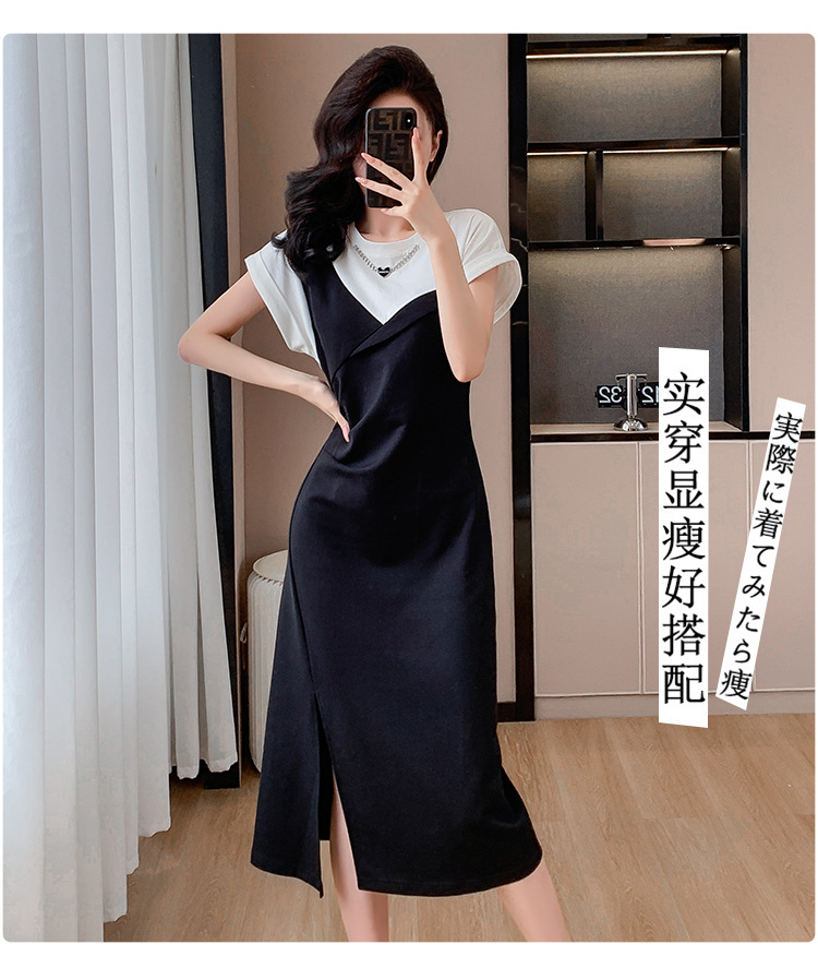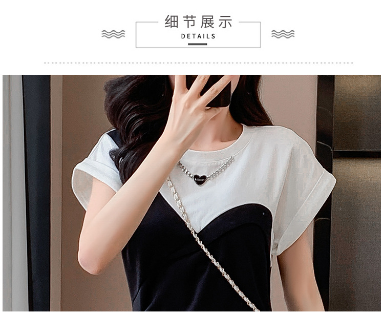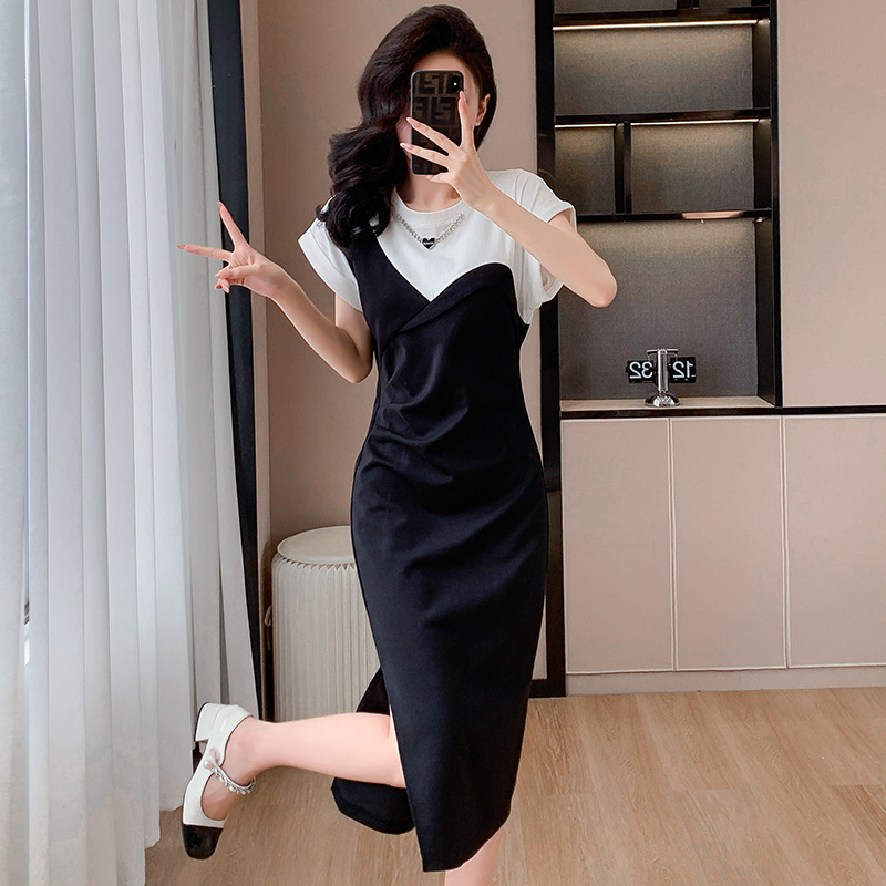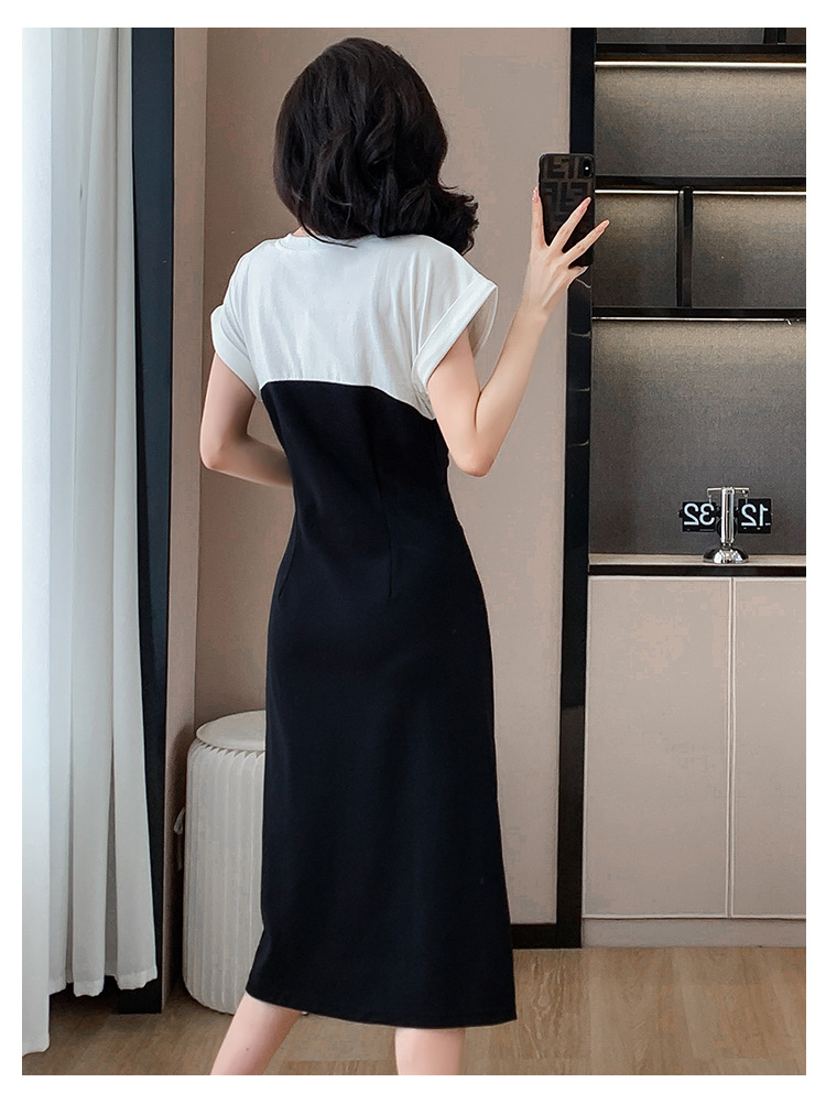 고급 스티칭 원피스 여성 2024 년 여름 새로운 불규칙한 통풍구 대비 반팔 A 라인 허리 스커트스토어 가기