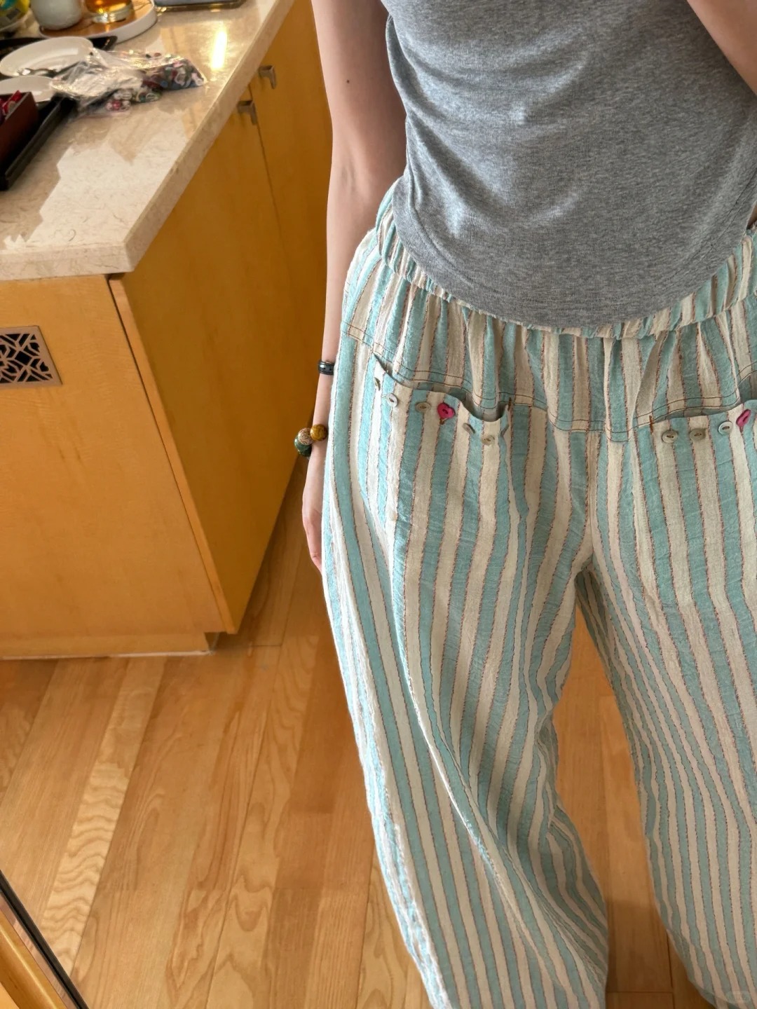 민트 맘보 그린 코튼 및 리넨 스트라이프 높은 허리 캐주얼 바지 여성의 여름 느슨한 더미 짧은 스트레이트 와이드 레그 바지스토어 가기