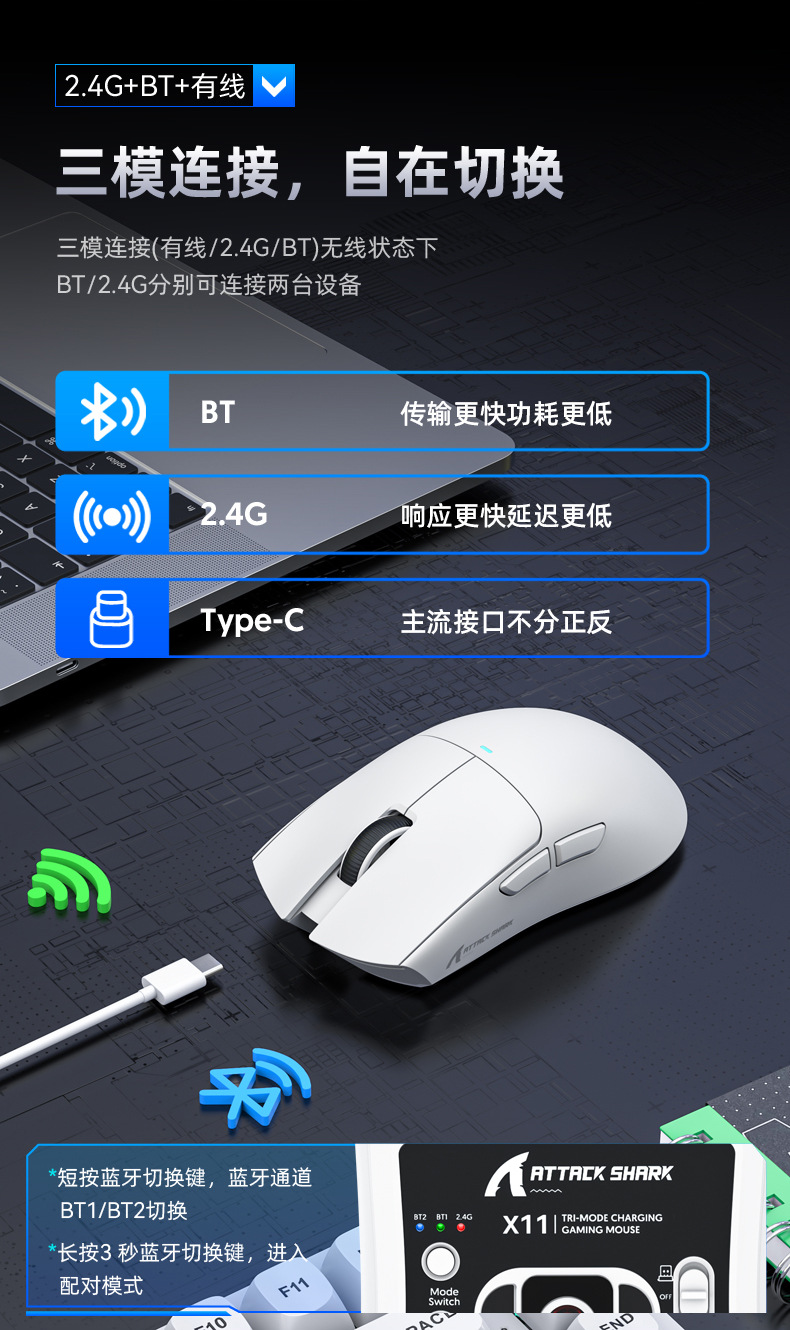 连接方式:2.4G无线+蓝牙5.0+TYPE-C有线