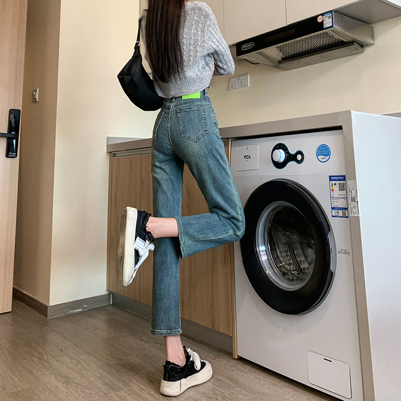 높은 허리 다리 모양의 스트레이트 배 디자인 녹색 가죽 라벨 청바지 여성용 스트레치 자른 연기 파이프 슬림 핏 빈티지 스트레이트 바지스토어 가기