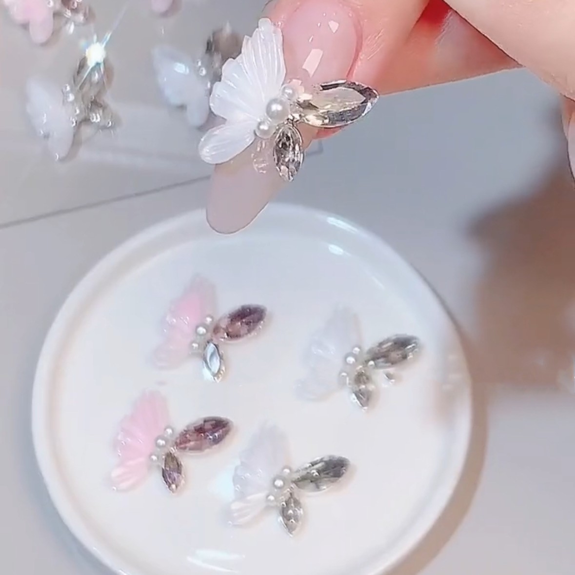 수제 완성 된 아이스 크리스탈 나비 일본 아이스 크리스탈 절묘한 다이아몬드 나비 다이아몬드 플래시 매니큐어 다이아몬드스토어 가기
