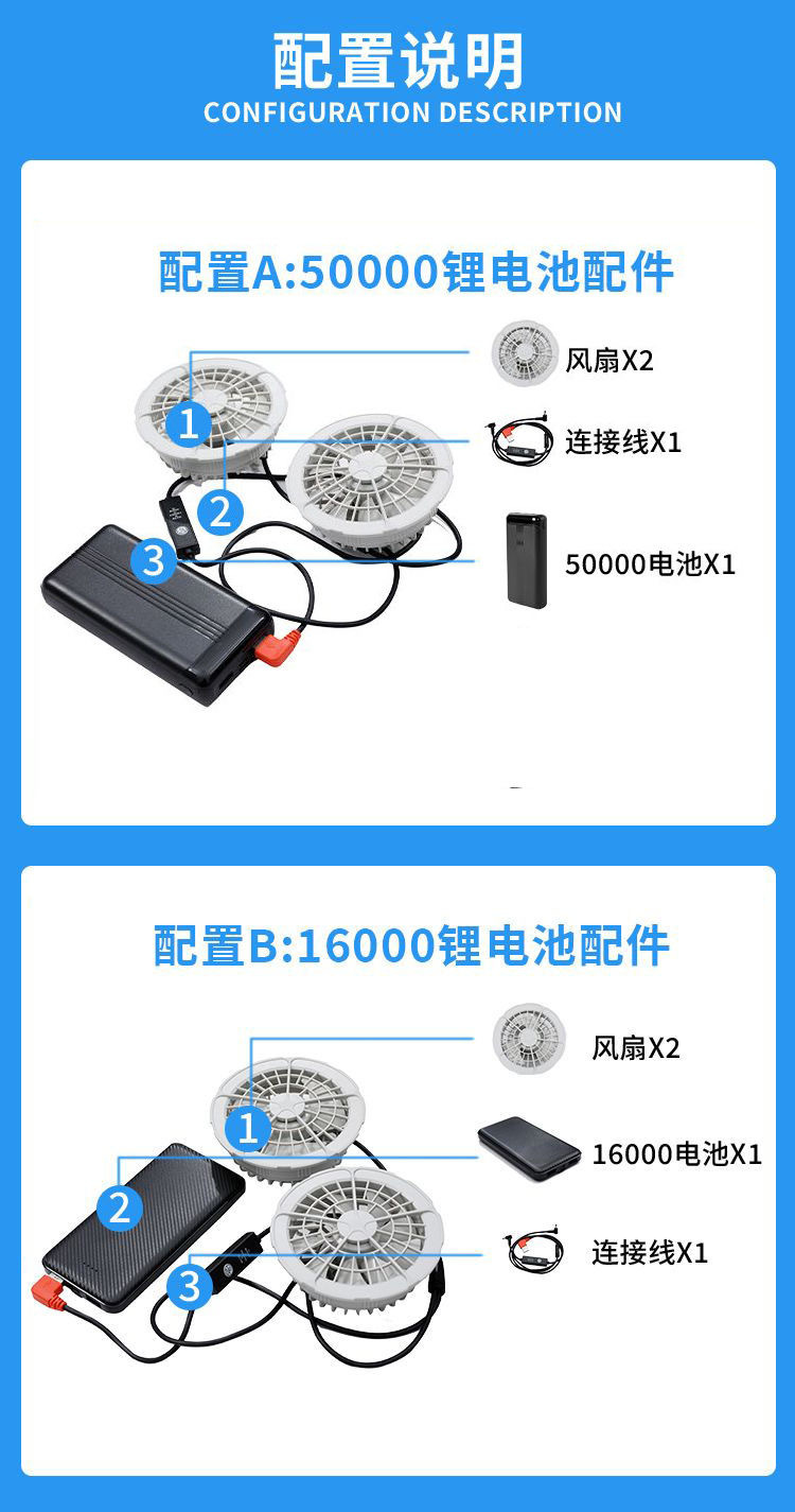 • 남자의 파란색 싱글 옷 발 20000 배터리 팬 1 쌍의 케이블