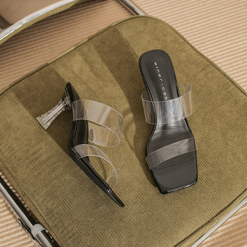 7316 여성용 여름 슬리퍼 2025년 여름 신상 투명 크리스탈 힐 샌들 스퀘어 토 슬림 하이힐