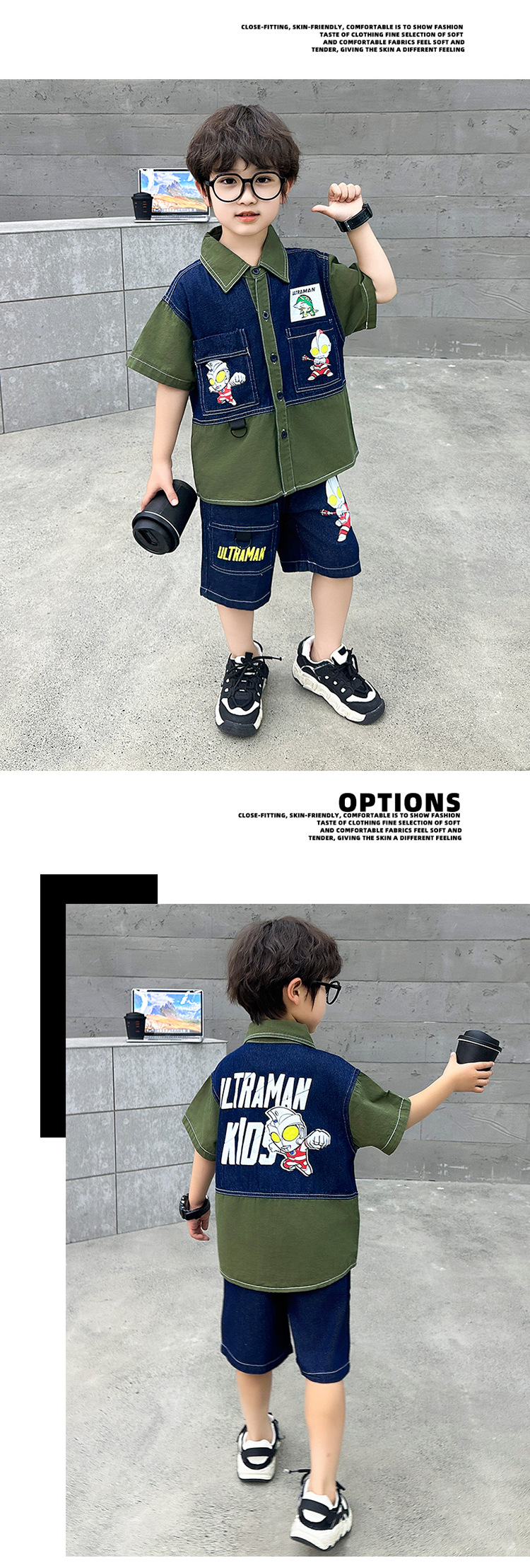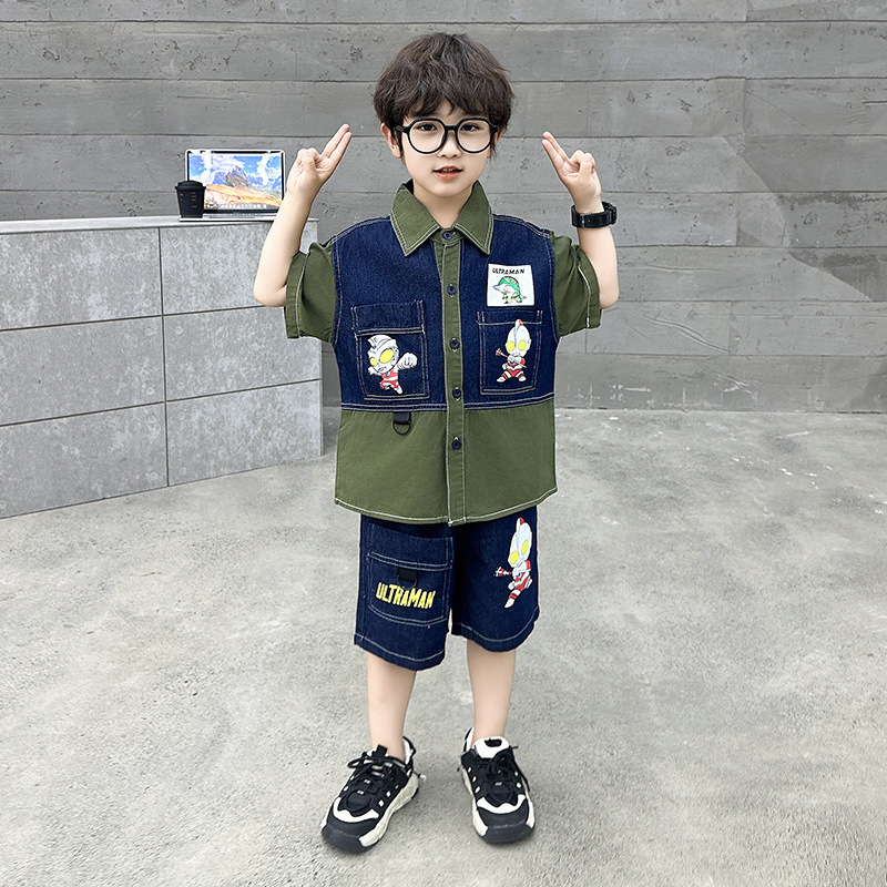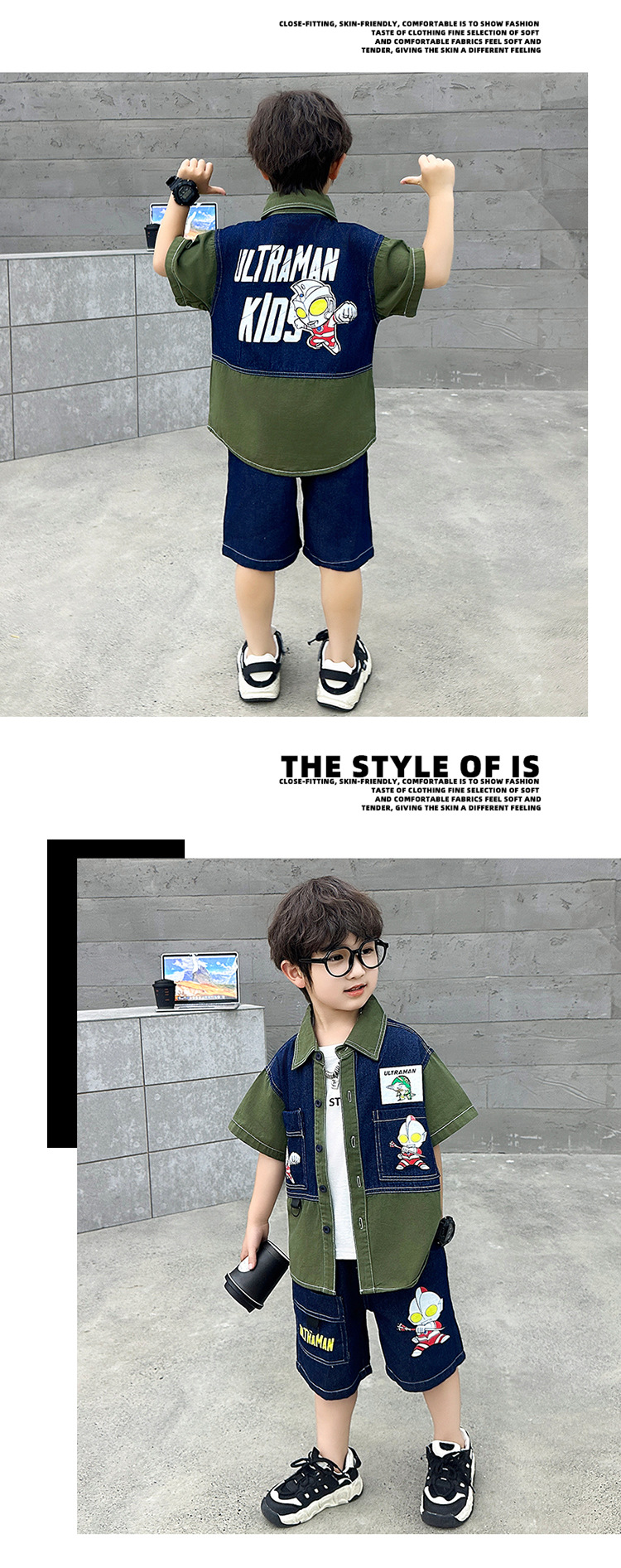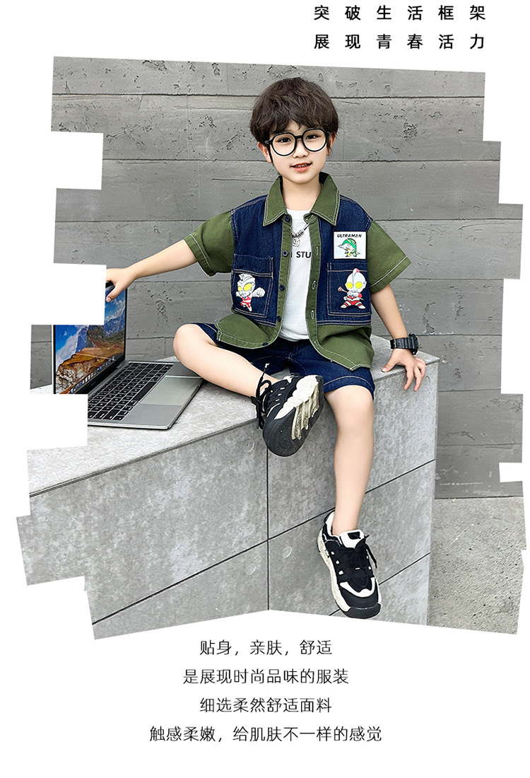 소년 여름 데님 바느질 Altman 짧은 소매 세트 2024 여름 새로운 어린이 셔츠 투피스 패션스토어 가기