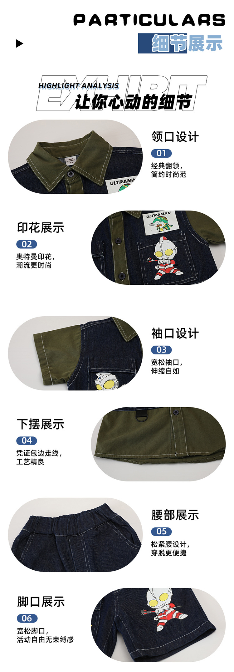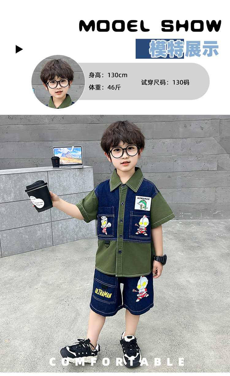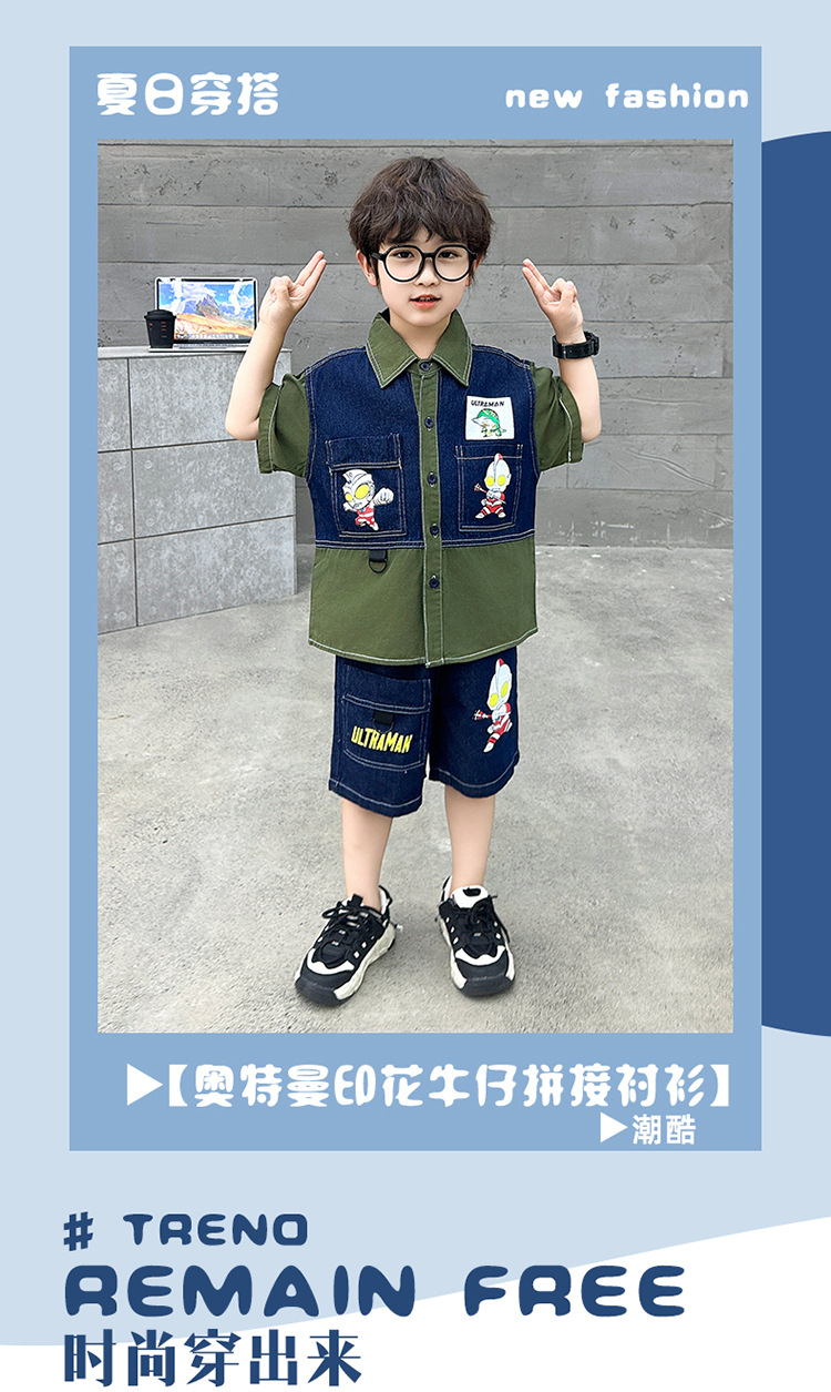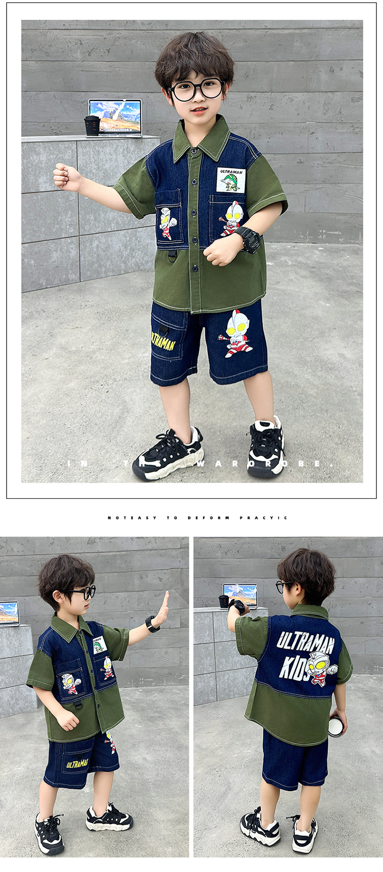 소년 여름 데님 바느질 Altman 짧은 소매 세트 2024 여름 새로운 어린이 셔츠 투피스 패션스토어 가기
