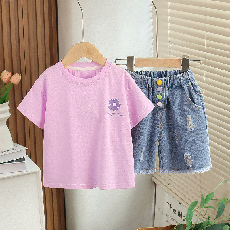 여자 여름 세트 2024 새로운 스타일 어린이 스포츠 반바지 여름 소녀 반팔 티셔츠 투피스 세트스토어 가기