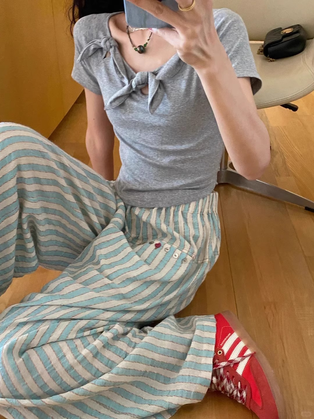 녹색 격자 무늬 줄무늬 면 린넨 캐주얼 바지 여성 여름 2024 새로운 높은 허리 슬림 작은 게으른 넓은 다리 바지