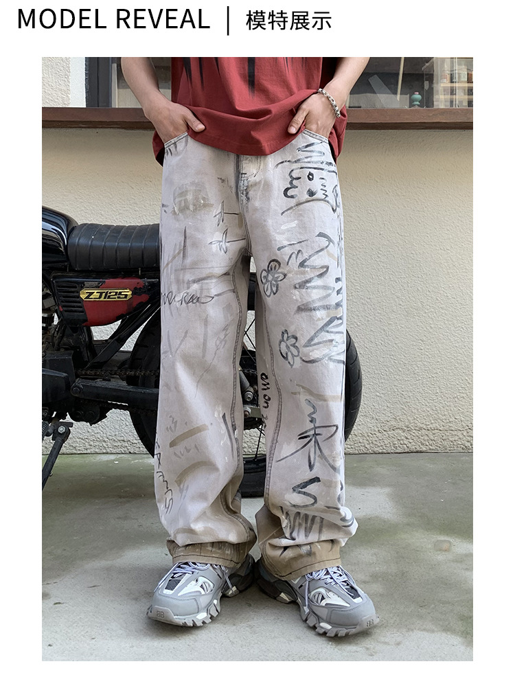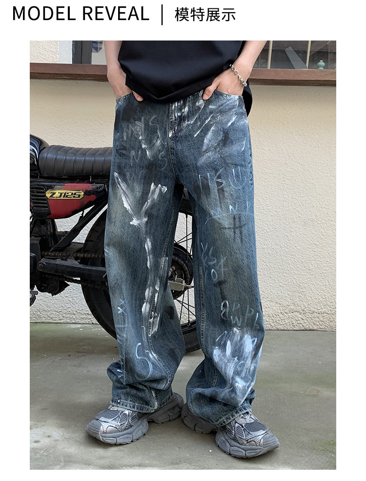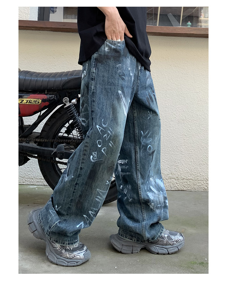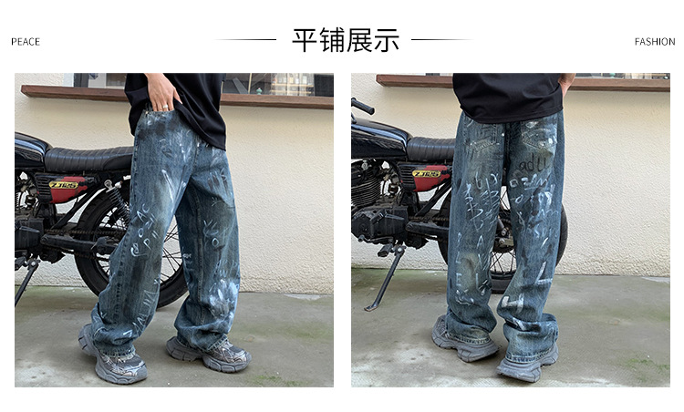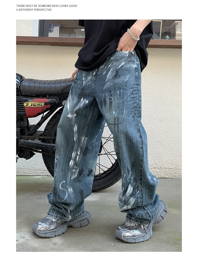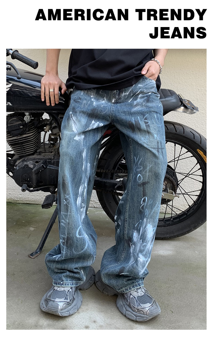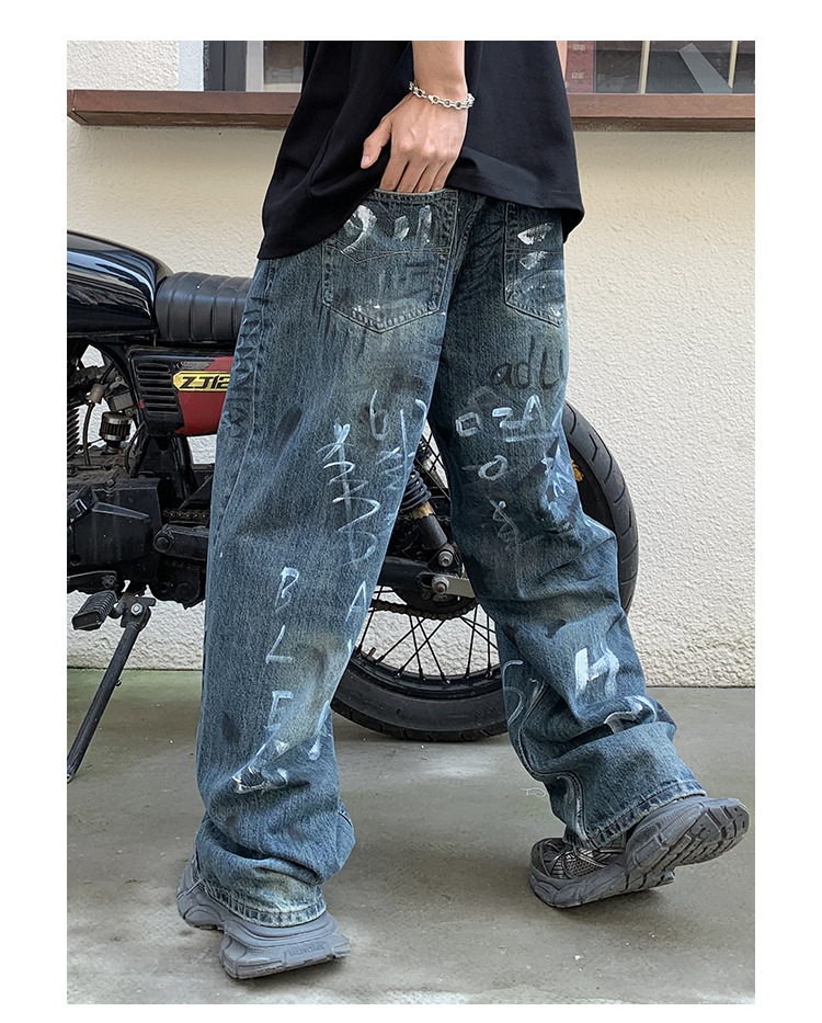 2024 봄 축제 미국 스타일 패션 브랜드 와이드 레그 올 매치 청바지 남성 스트리트 러피언 핸디솜 그래피티 레트로 캐주얼 바지스토어 가기
