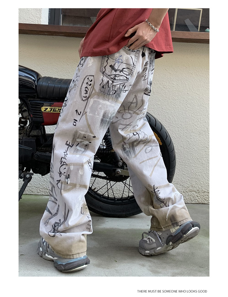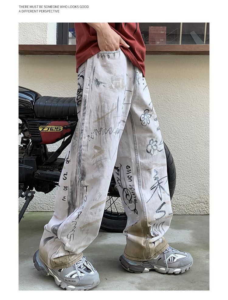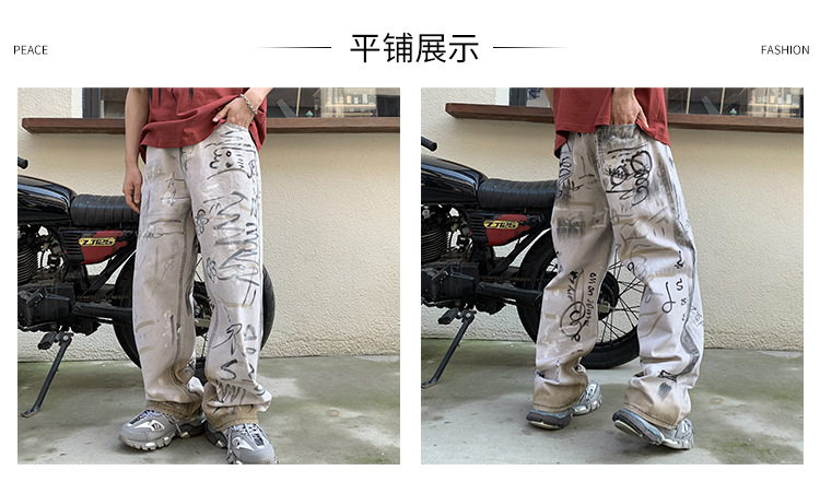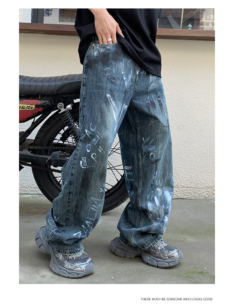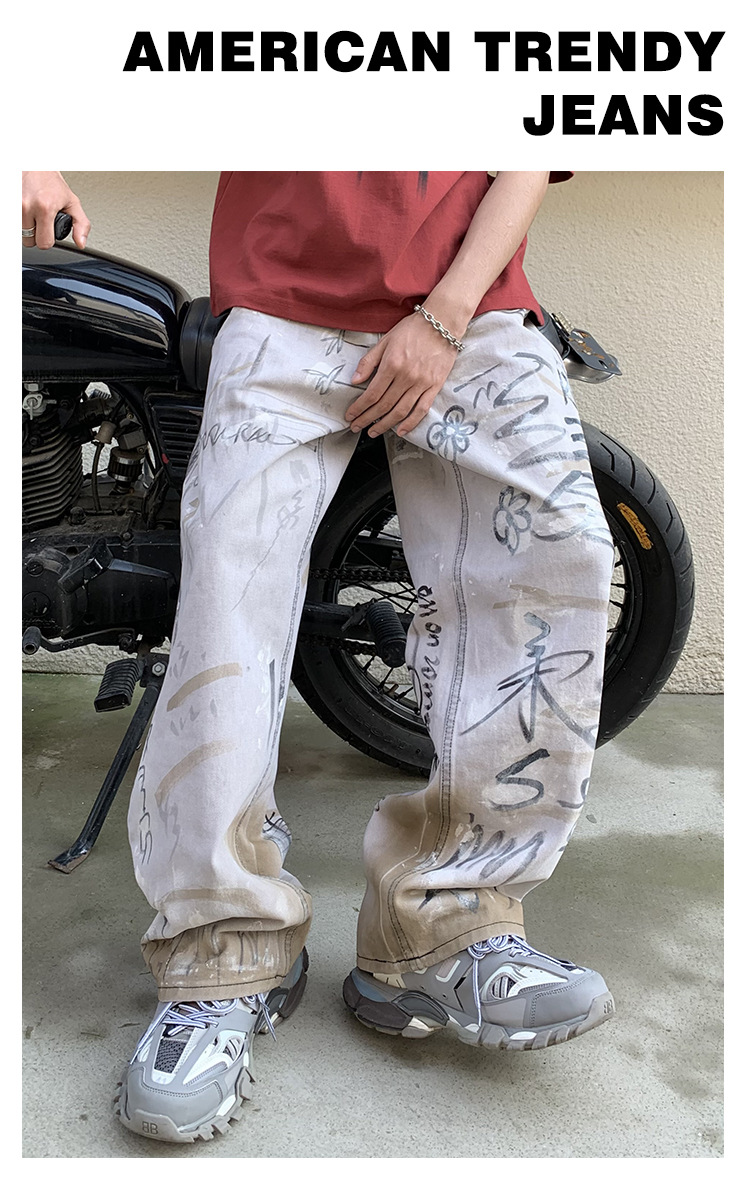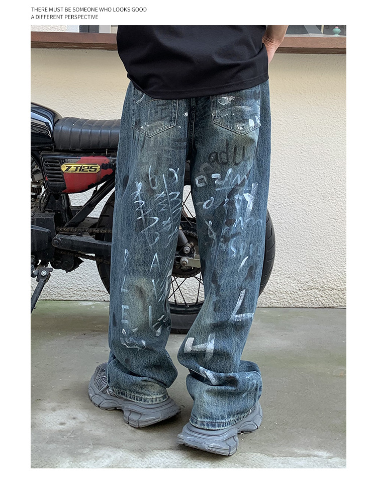 2024 봄 축제 미국 스타일 패션 브랜드 와이드 레그 올 매치 청바지 남성 스트리트 러피언 핸디솜 그래피티 레트로 캐주얼 바지스토어 가기
