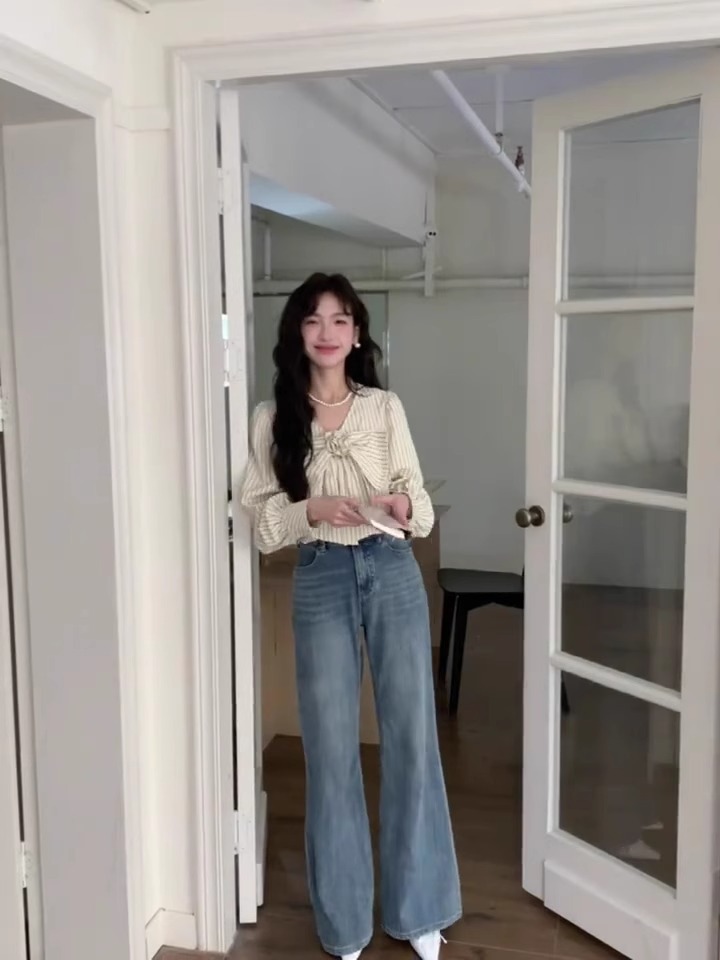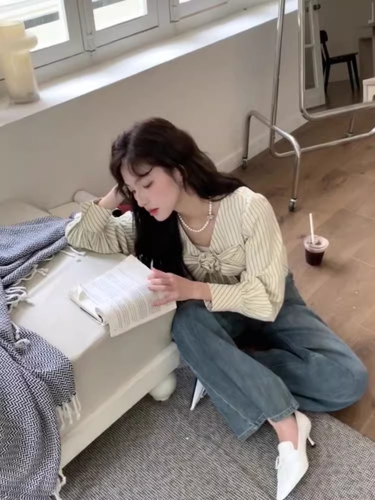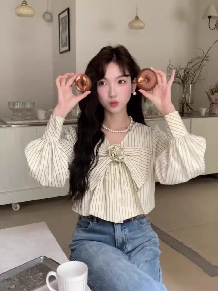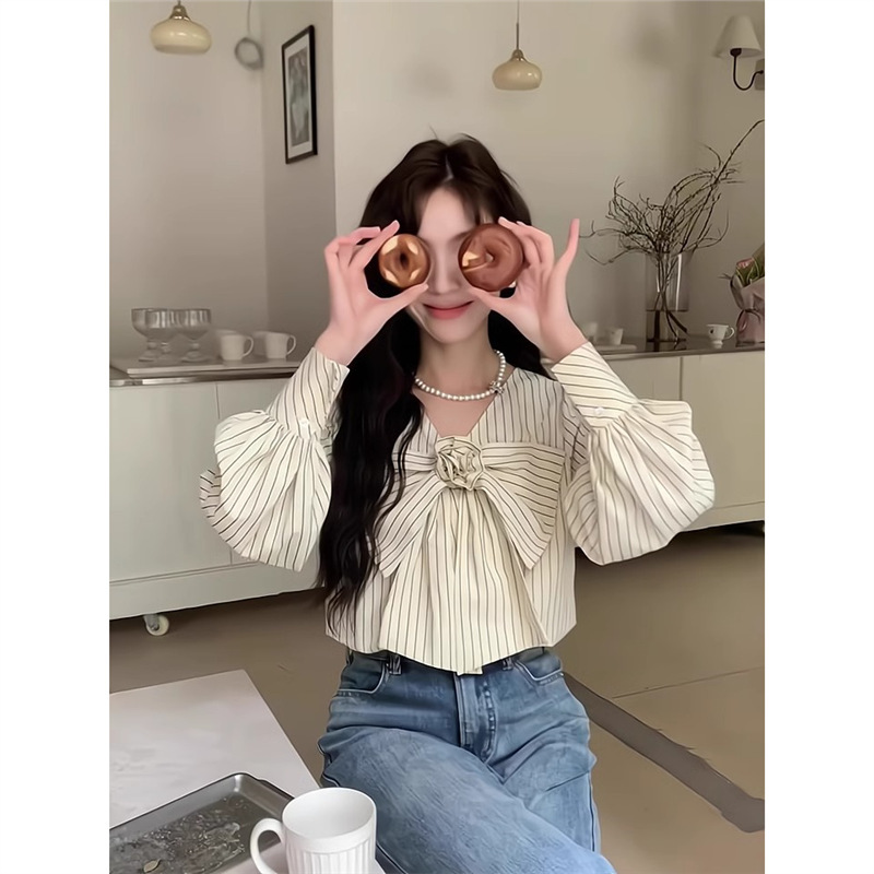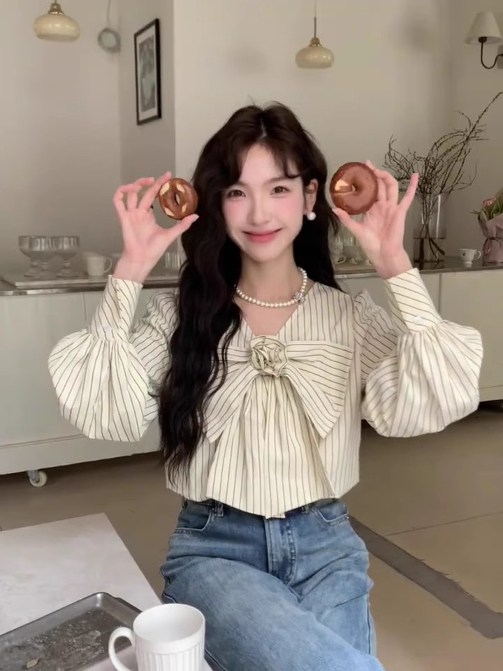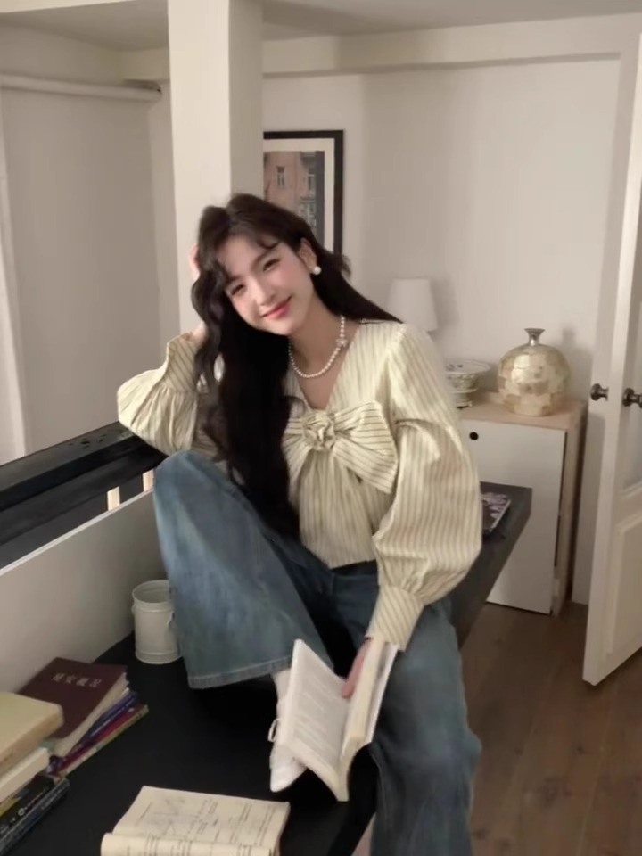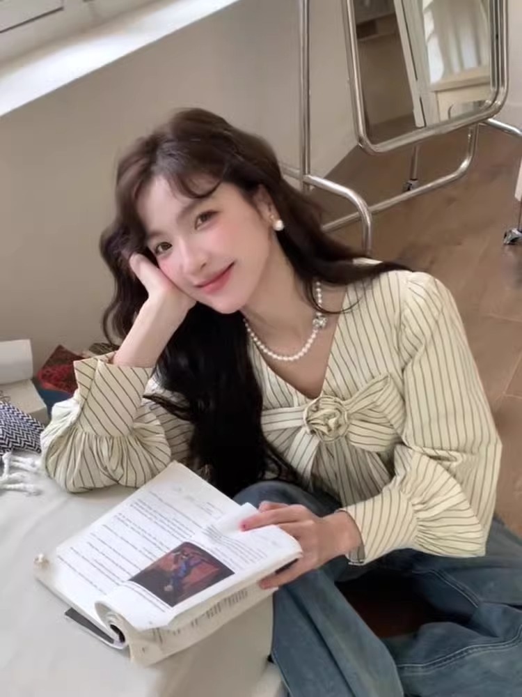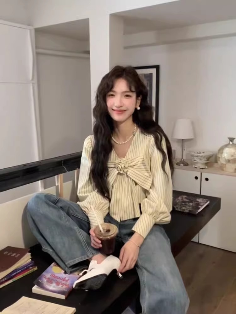 우유 노란색 줄무늬 V 넥 활 긴팔 쉬폰 셔츠 여성의 여름 셔츠 디자인 틈새스토어 가기