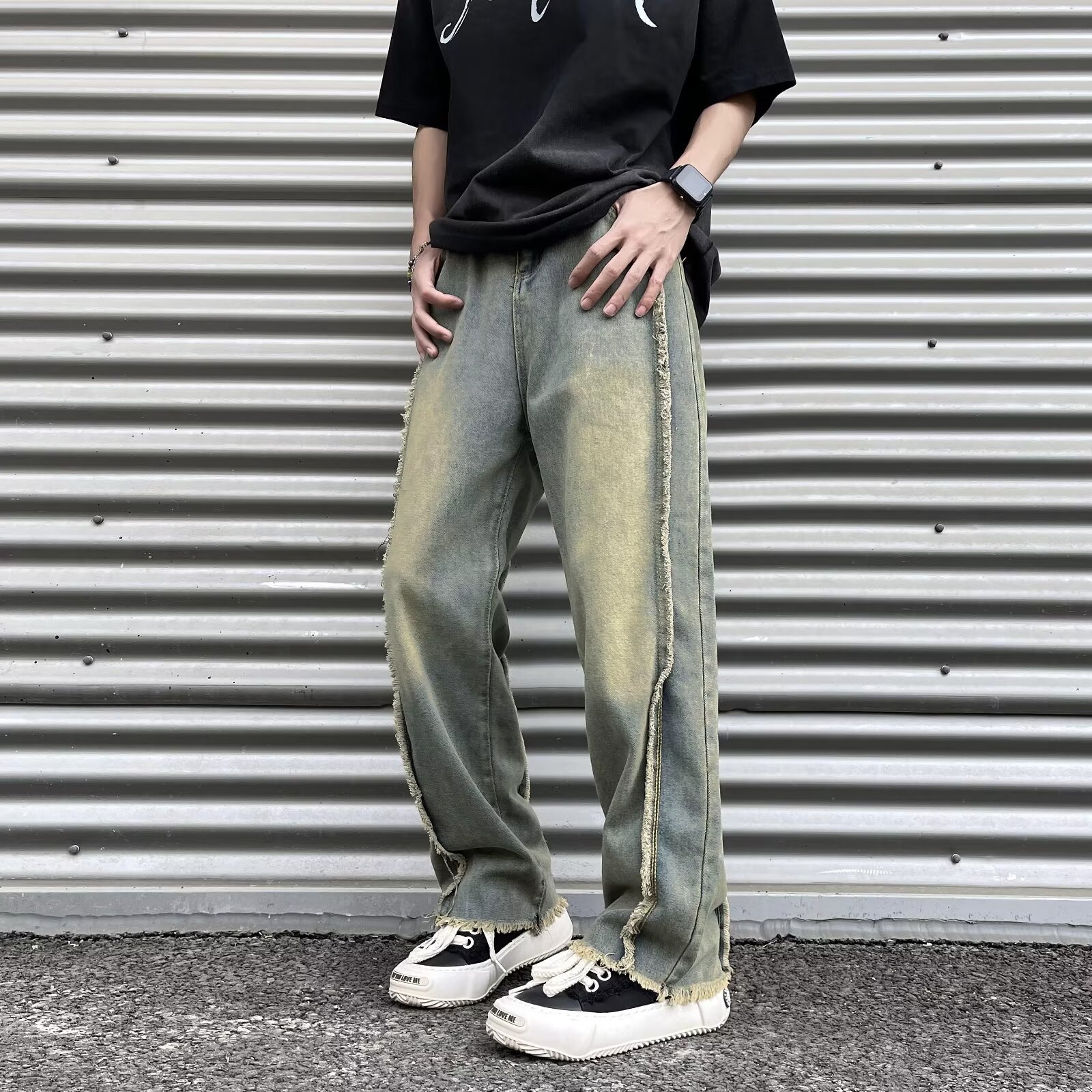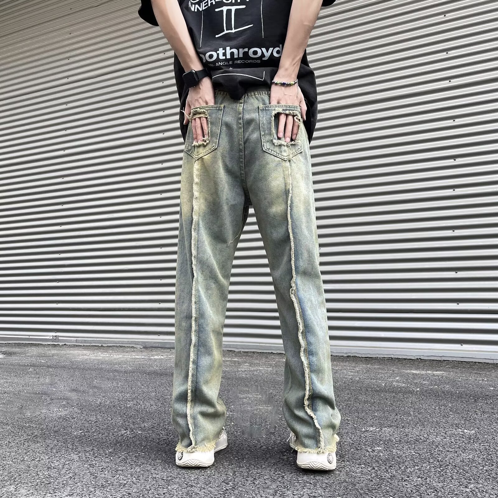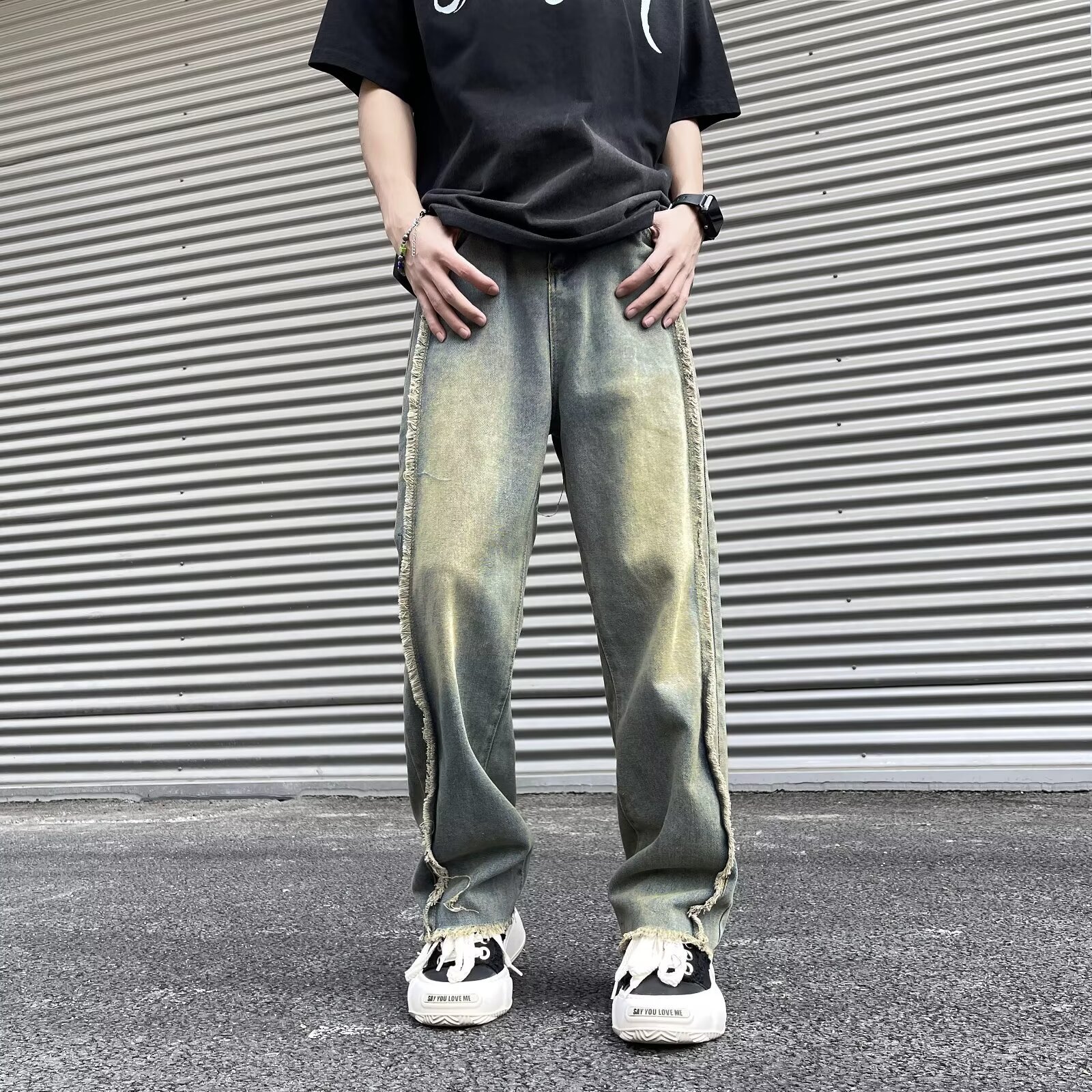 Ins High Street 세탁 빈티지 클레이 옐로우 청바지 남성용 러플 스티칭 디자인 센스 루즈 와이드 레그 바지