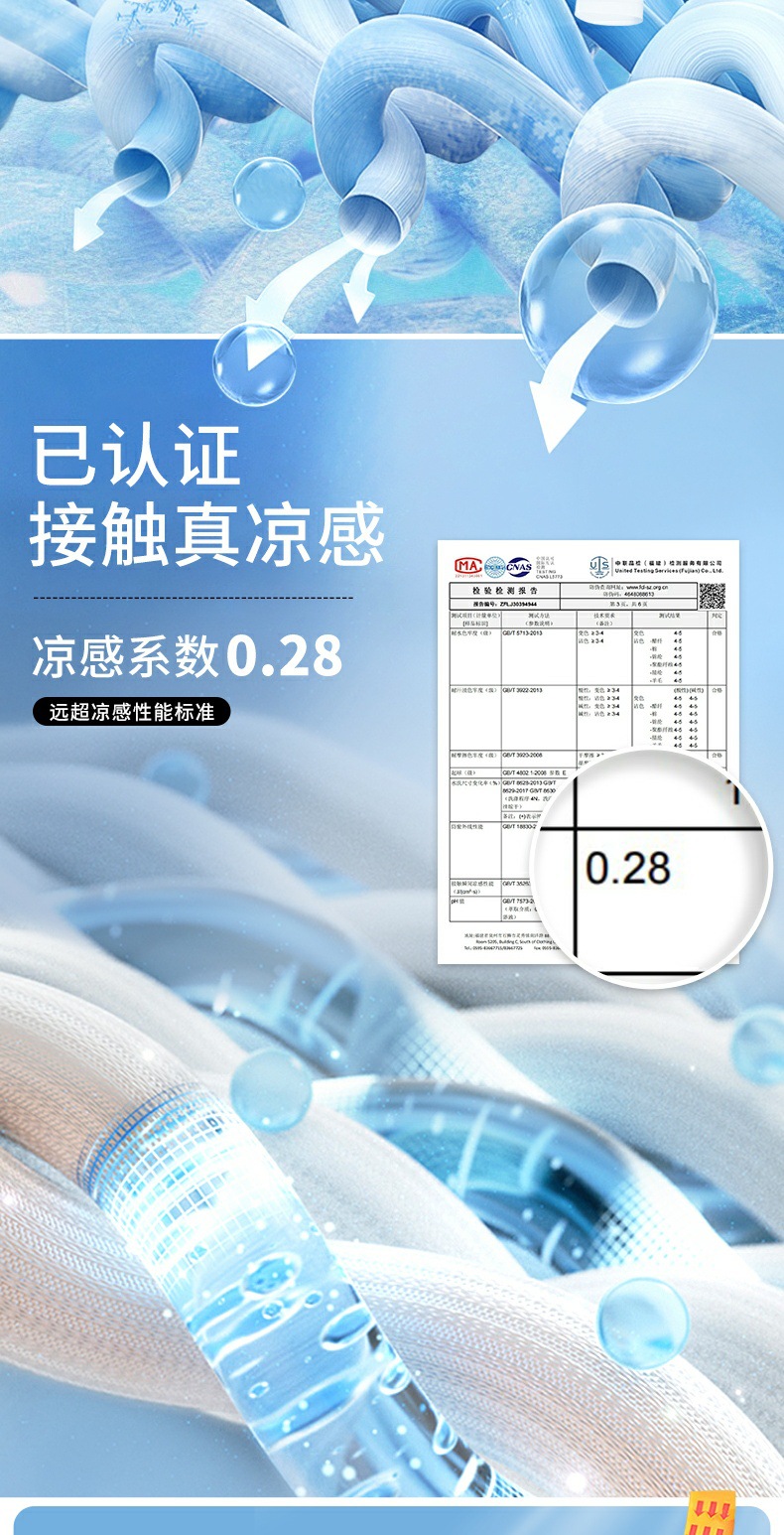 凉感属性面料,能将温度迅速扩散给身体降温,穿着尽享清爽舒适