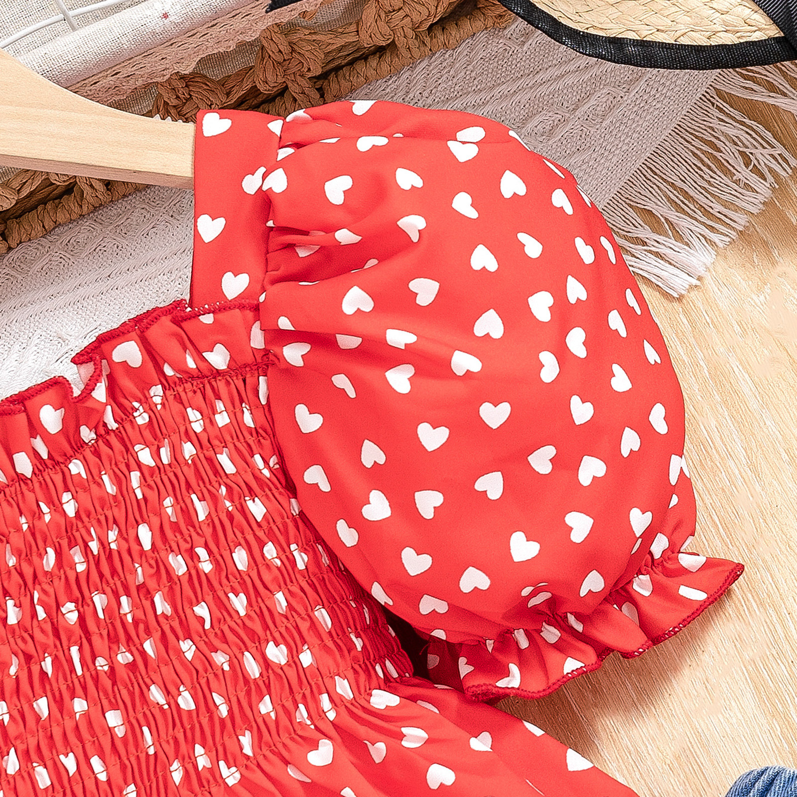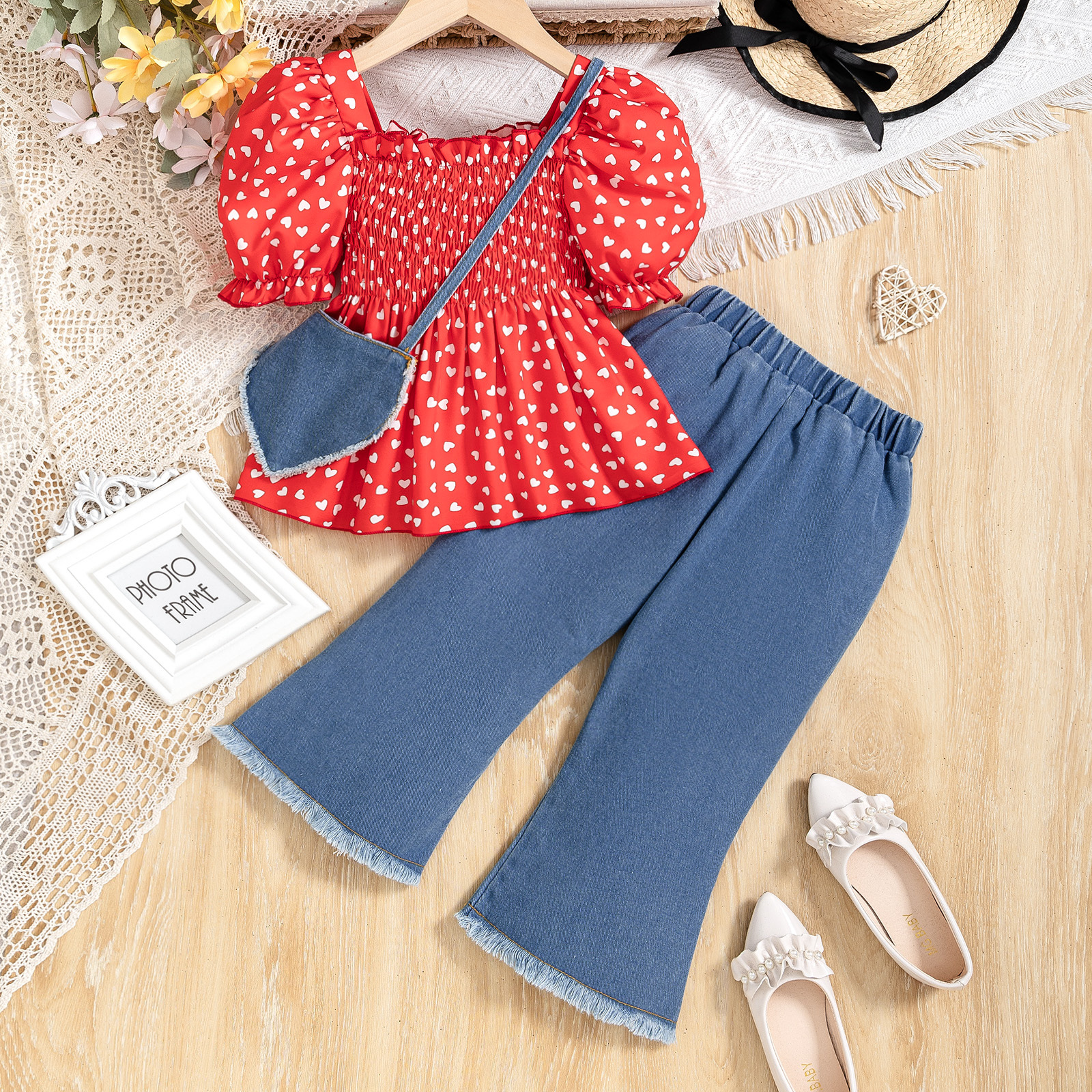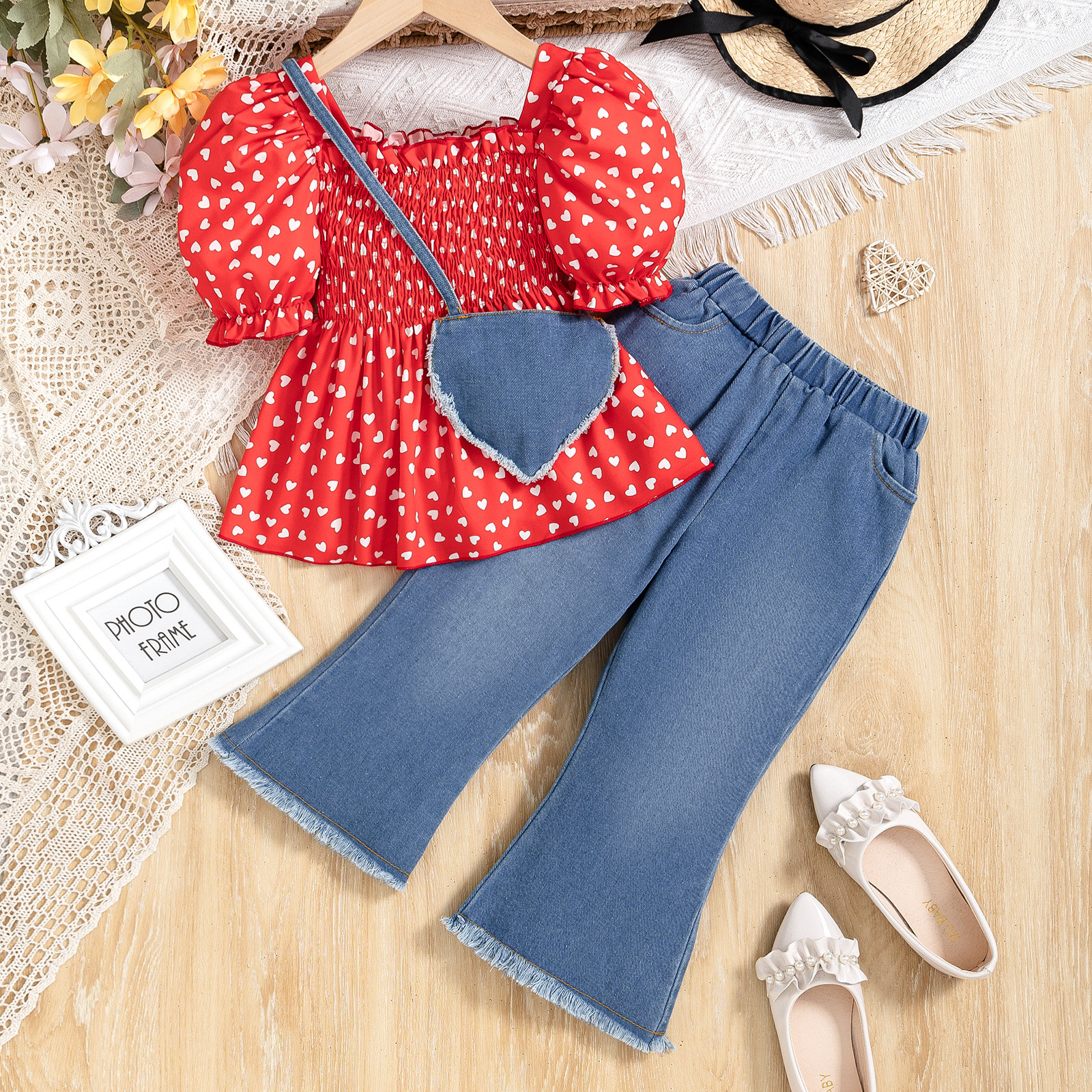 Baopin 아동복 국경 간 유럽과 미국 소녀 세트 사랑 거품 슬리브 재킷 마이크로 데님 바지 가방