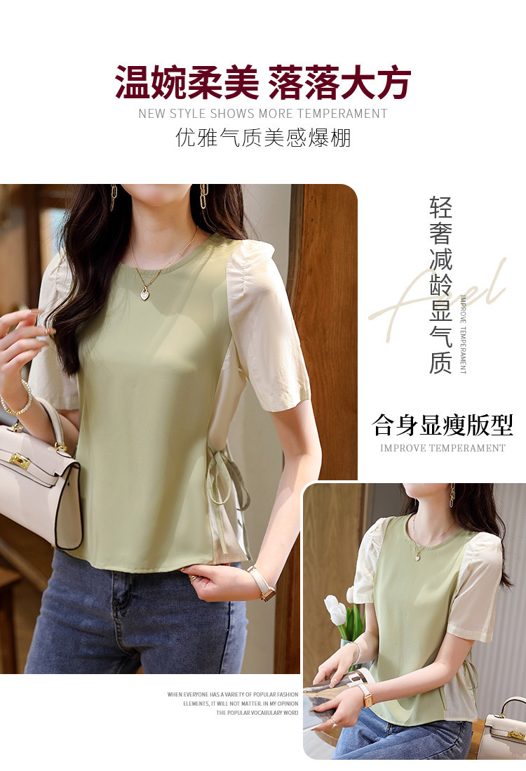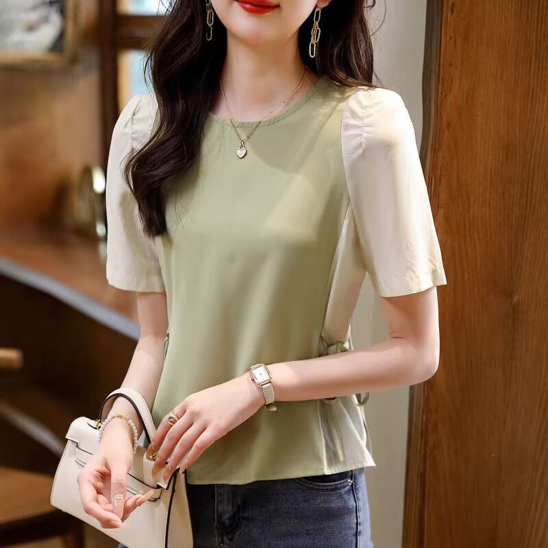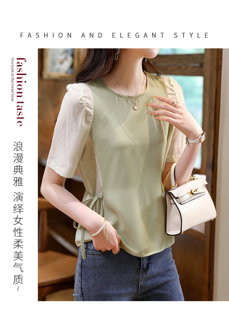 서양식 작은 셔츠 나이를 줄이는 반소매 쉬폰 셔츠 여성 여름 2024 새로운 스타일 우아한 타이트 허리 슬리밍 여름 여성 탑스토어 가기