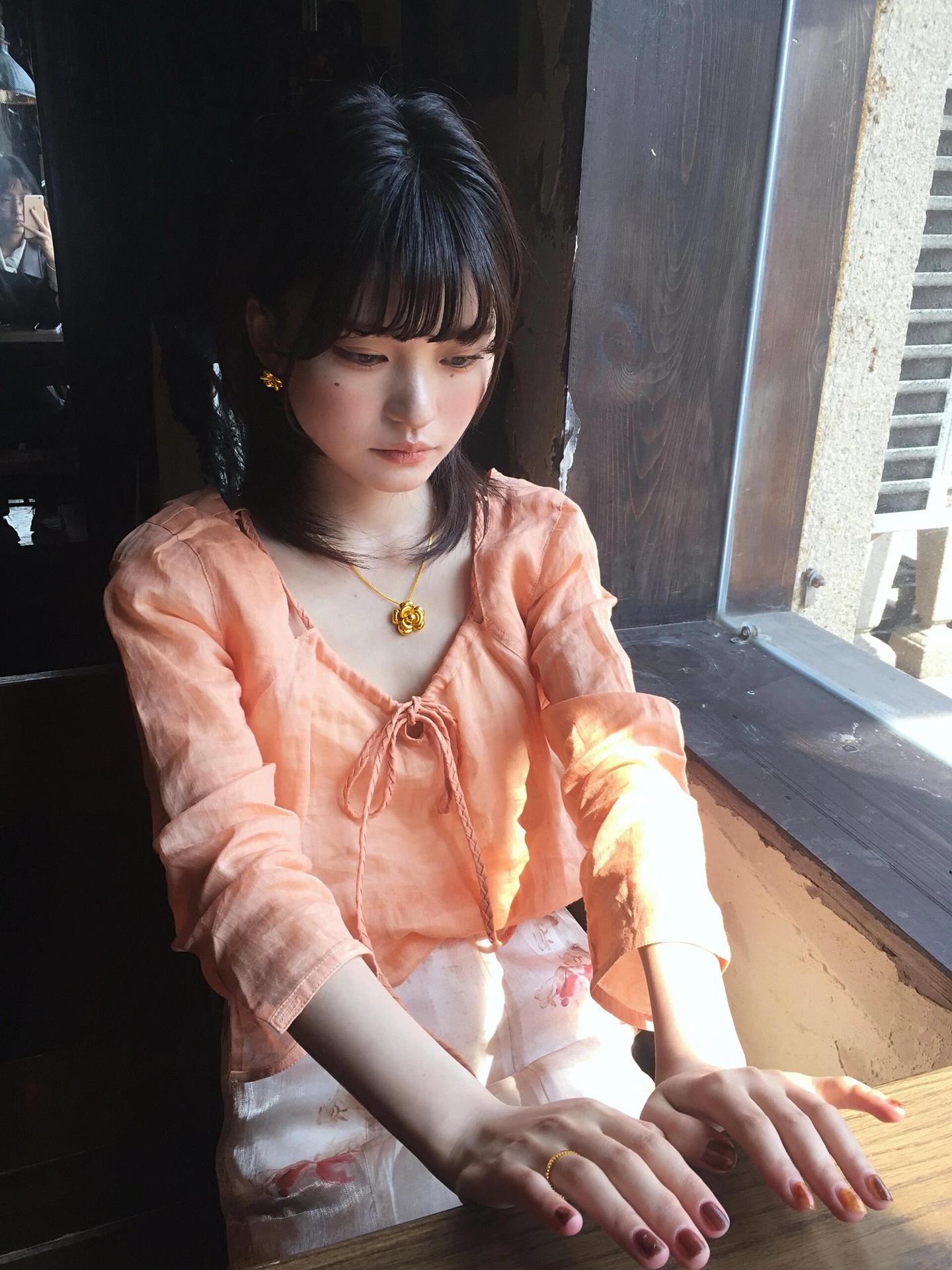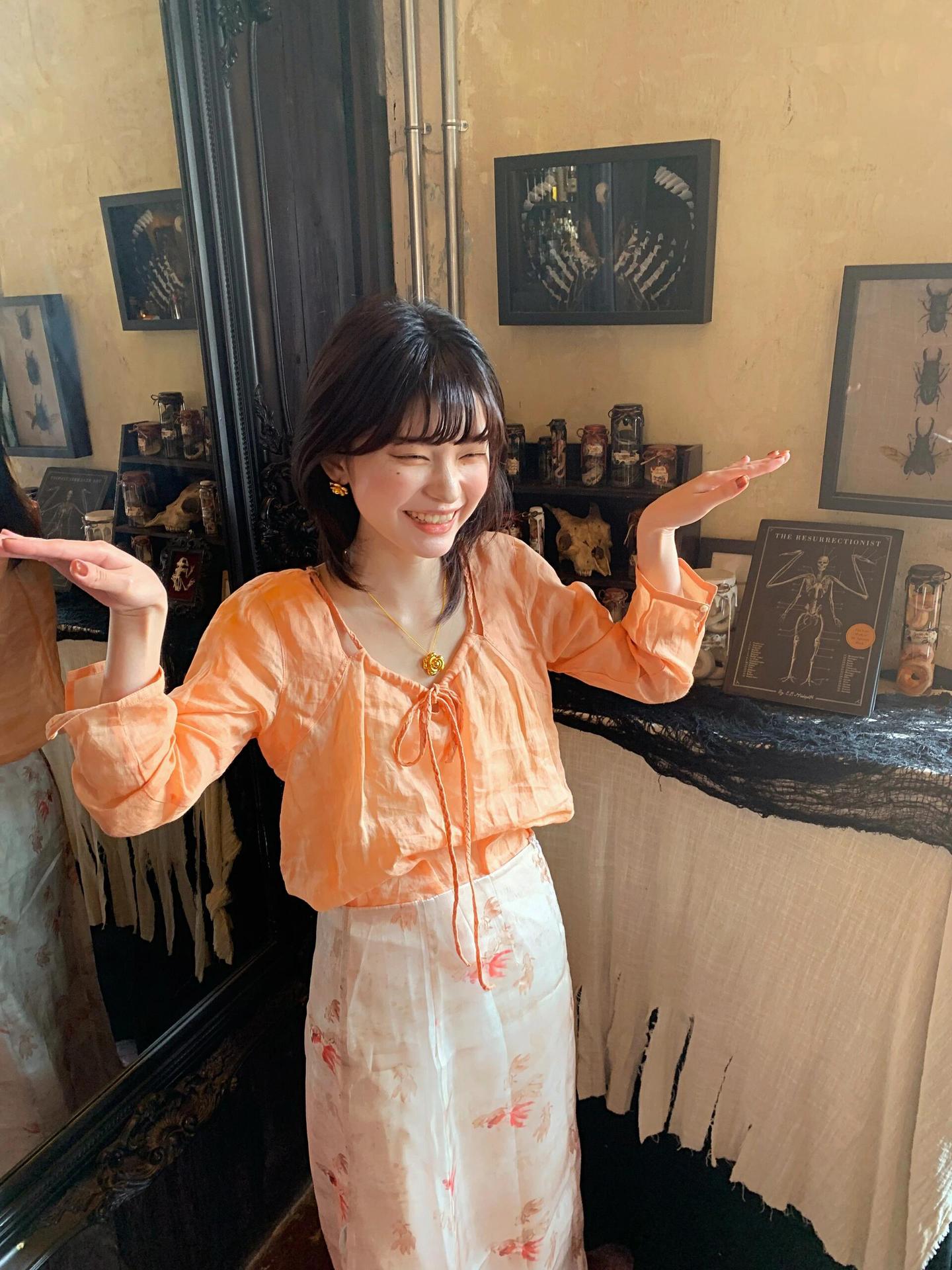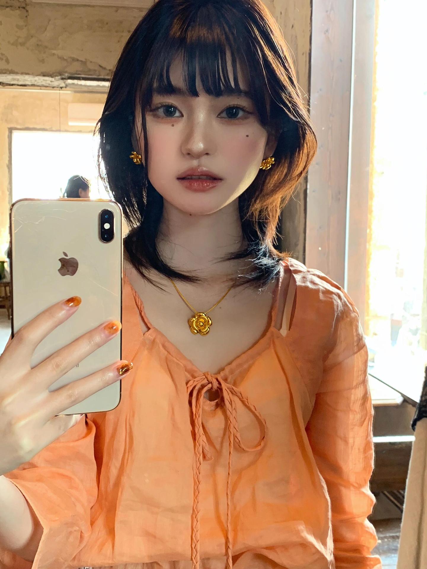 일본식 오렌지 V 넥 텐셀 선 스크린 인형 셔츠 최고 여성의 여름 도파민 얇은 디자인 틈새 셔츠스토어 가기