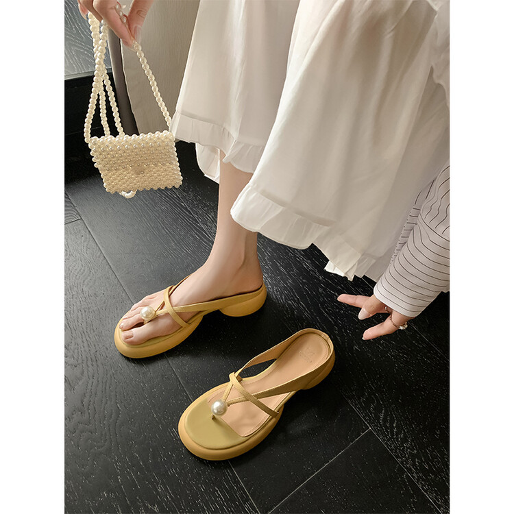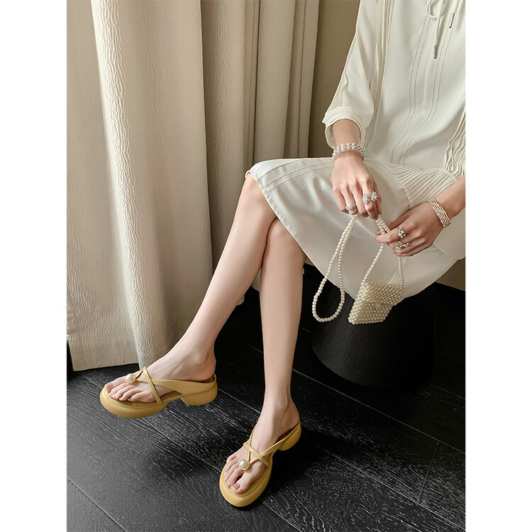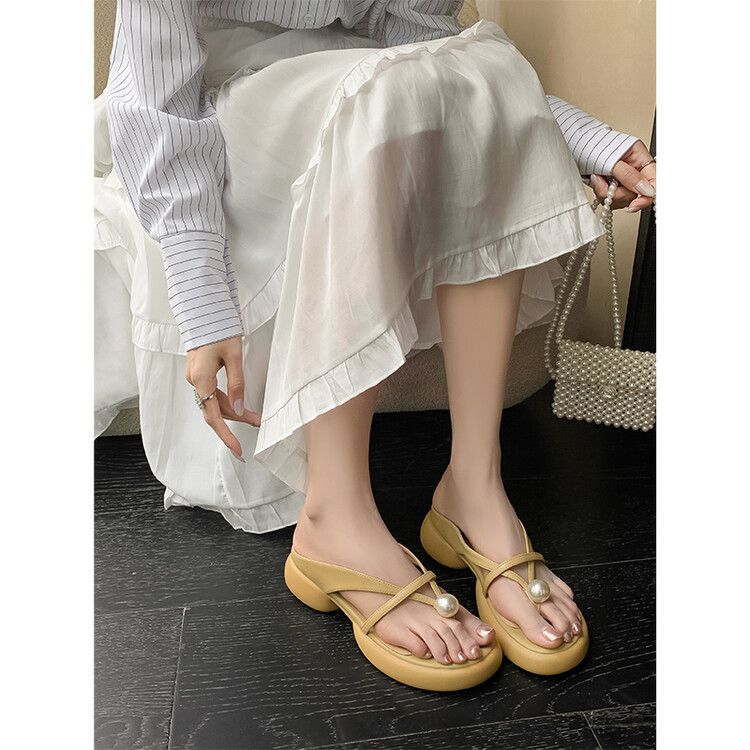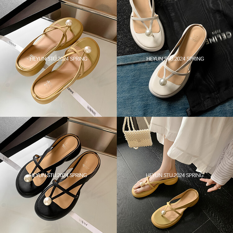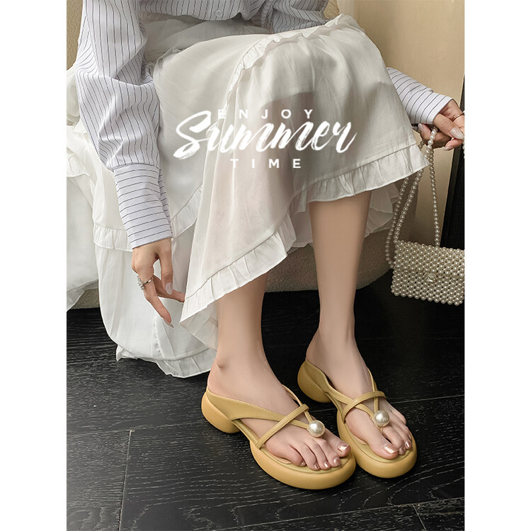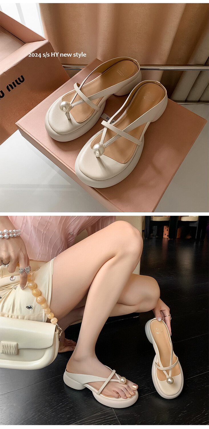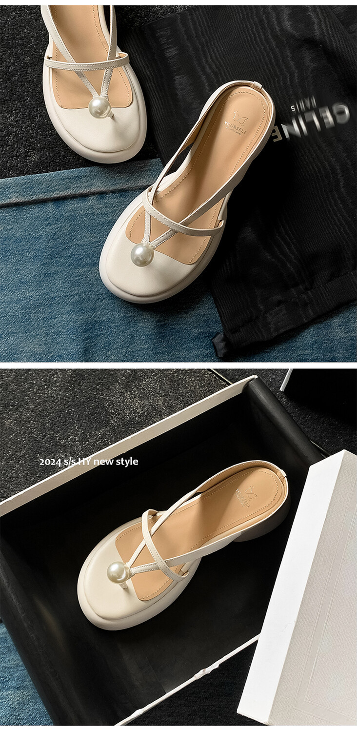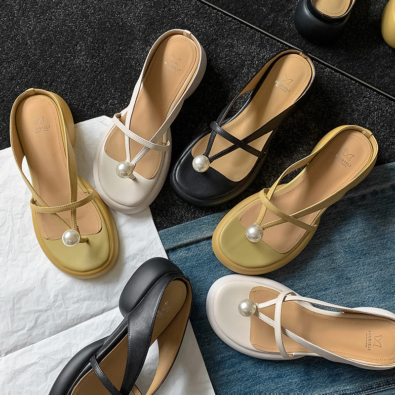 2024 새로운 빈티지 두꺼운 바닥 플립 플롭 여성 패션 요정 스타일 펄 클립 발가락 화이트 슬리퍼 여성의 여름 외복스토어 가기
