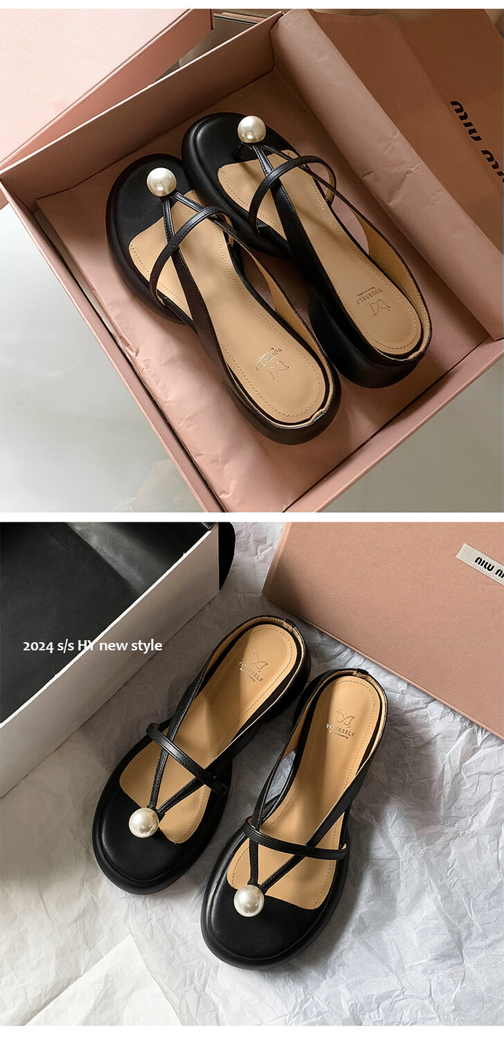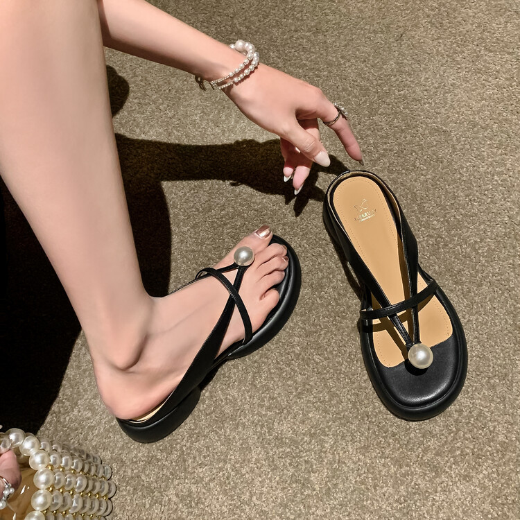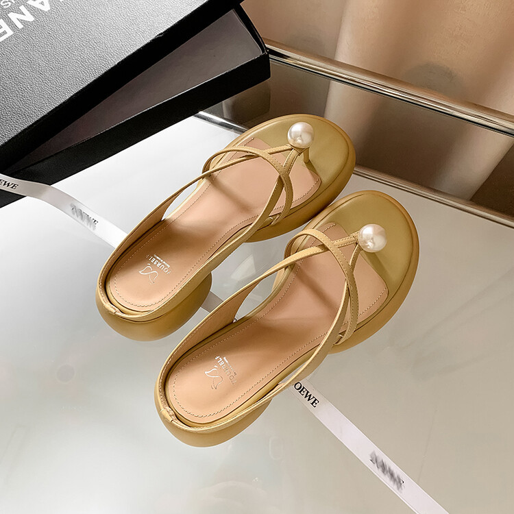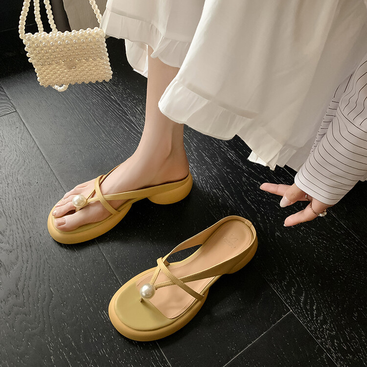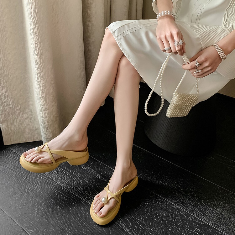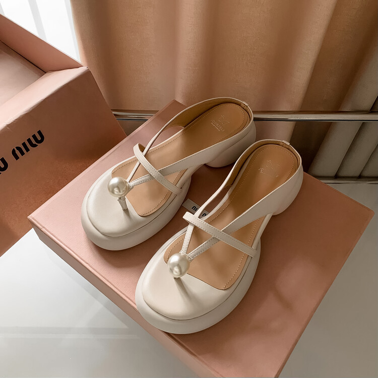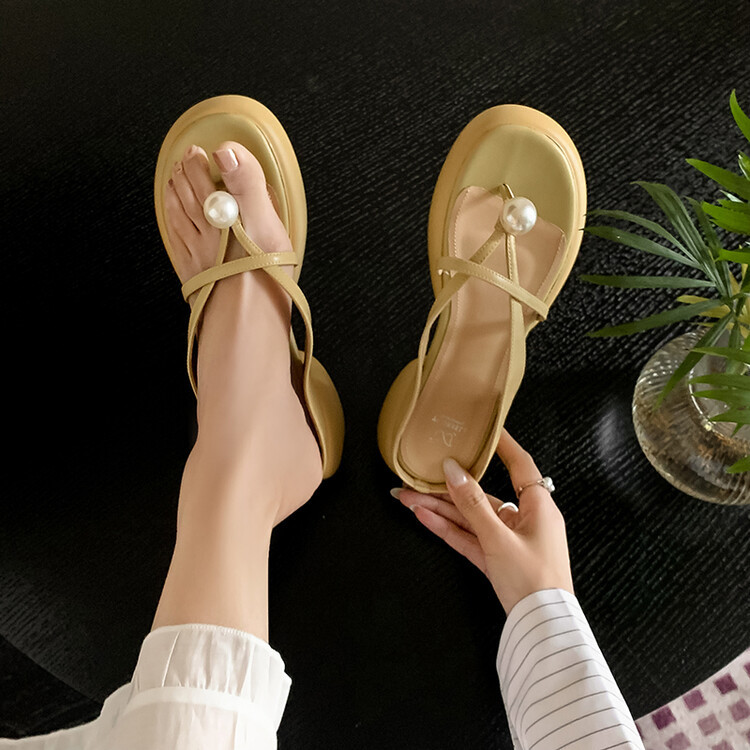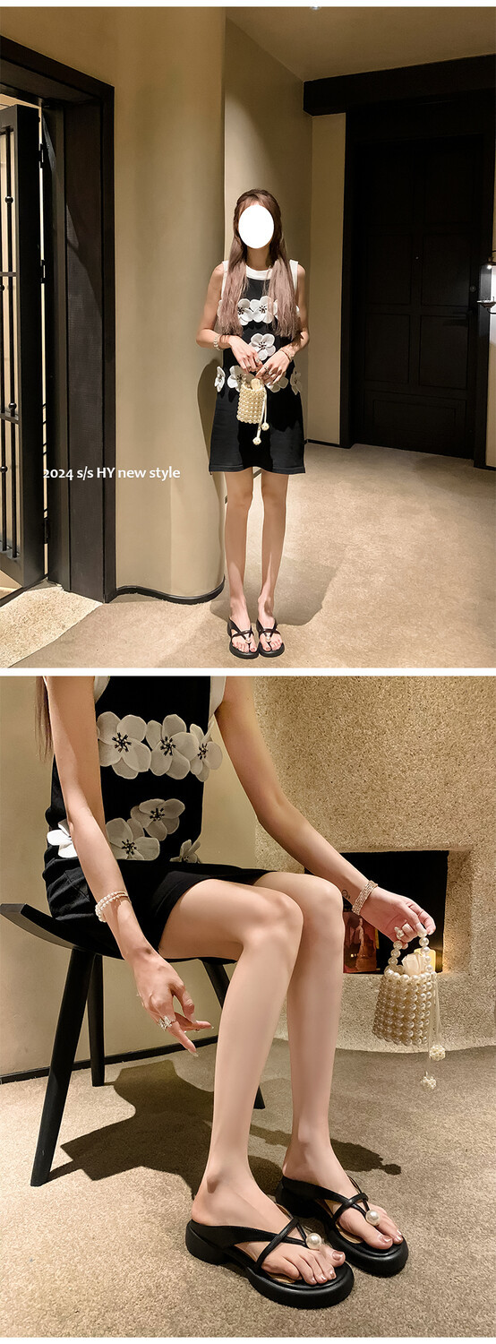 2024 새로운 빈티지 두꺼운 바닥 플립 플롭 여성 패션 요정 스타일 펄 클립 발가락 화이트 슬리퍼 여성의 여름 외복스토어 가기