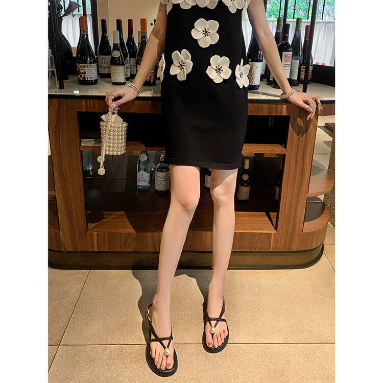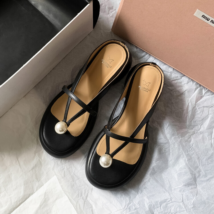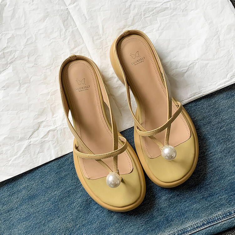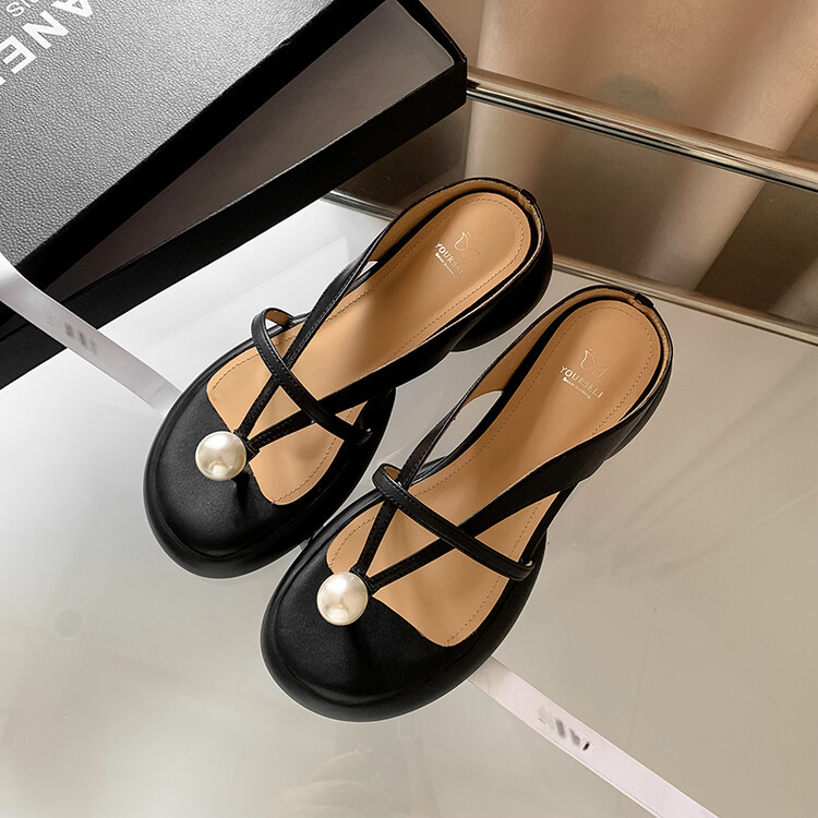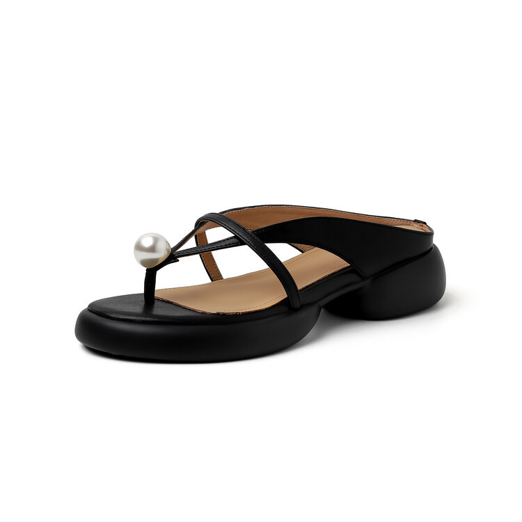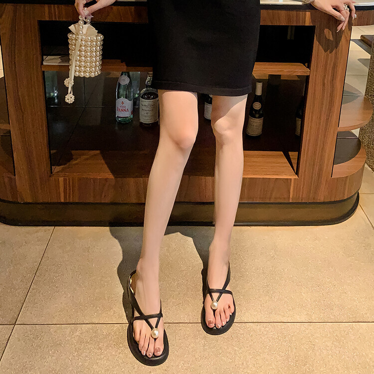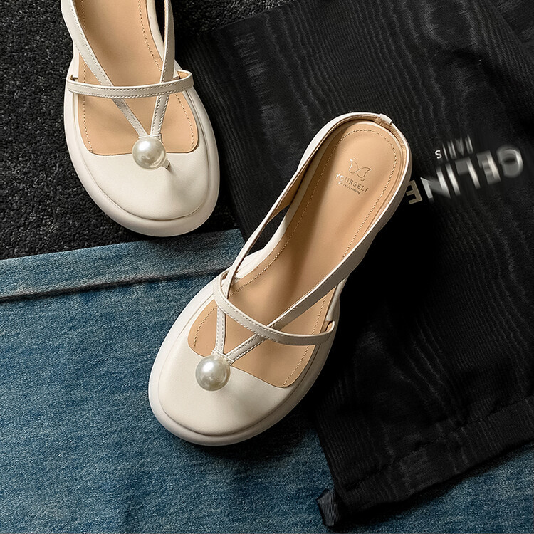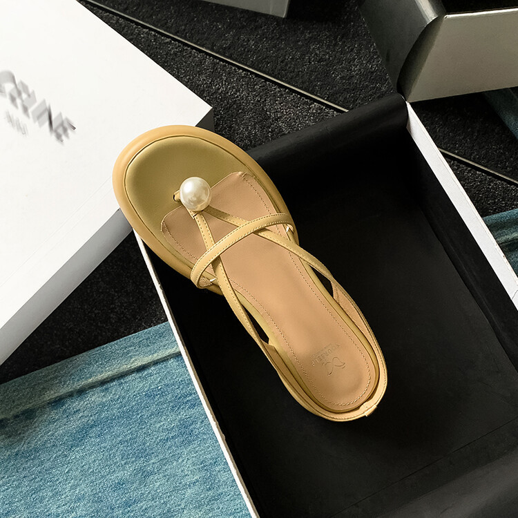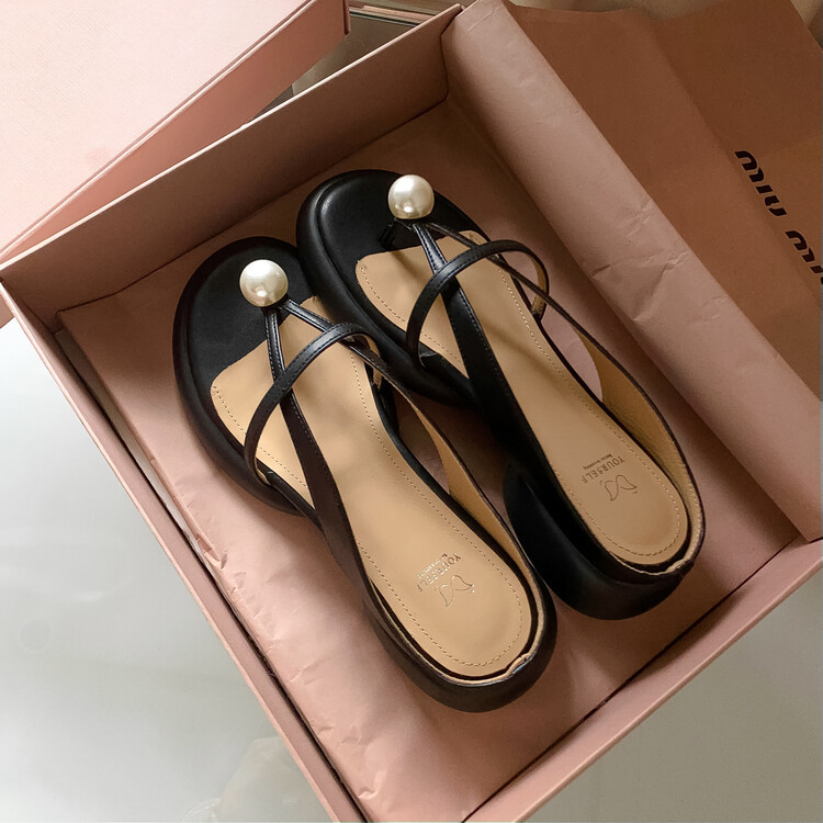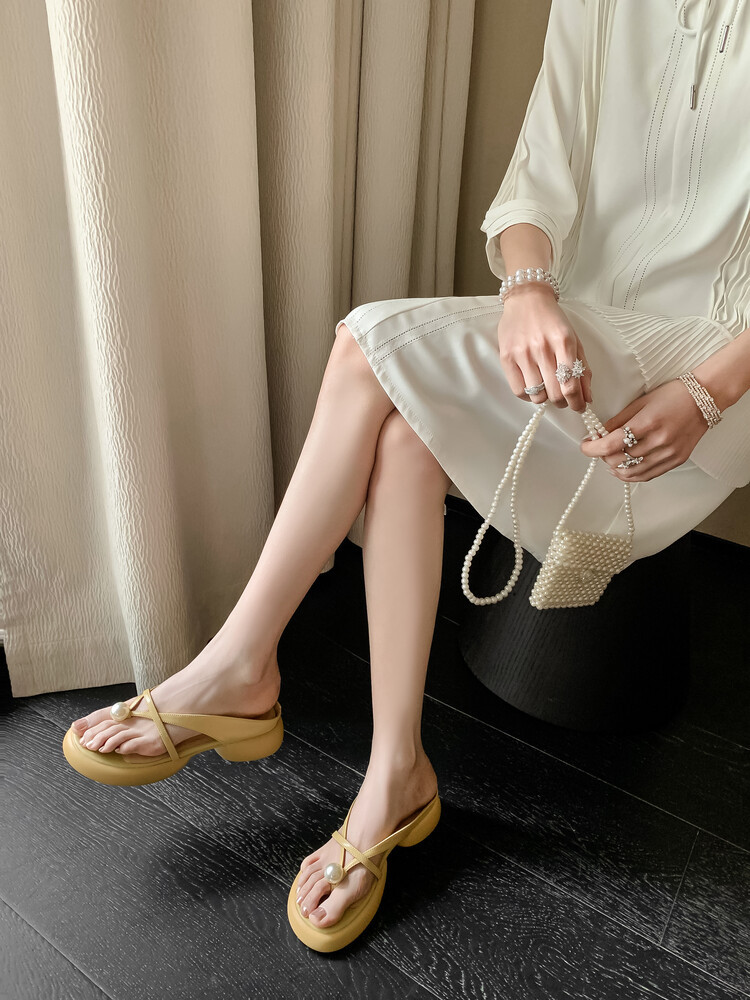 2024 새로운 빈티지 두꺼운 바닥 플립 플롭 여성 패션 요정 스타일 펄 클립 발가락 화이트 슬리퍼 여성의 여름 외복스토어 가기