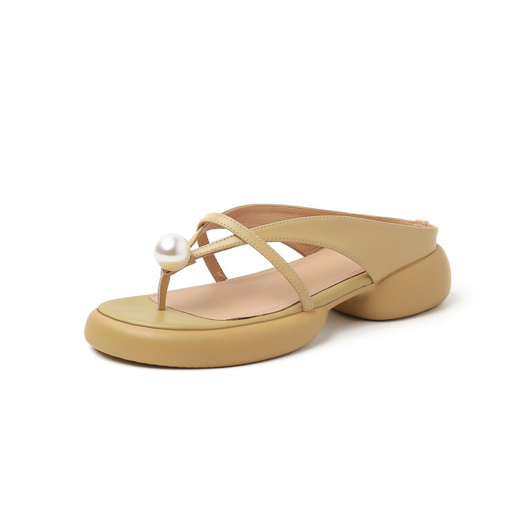 2024 새로운 빈티지 두꺼운 바닥 플립 플롭 여성 패션 요정 스타일 펄 클립 발가락 화이트 슬리퍼 여성의 여름 외복