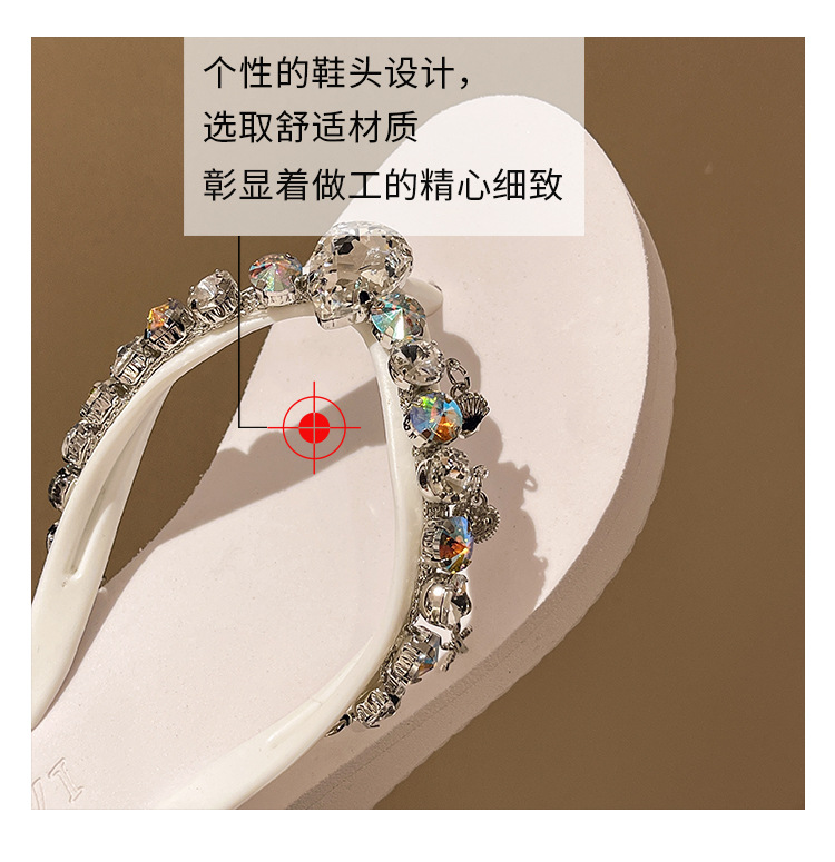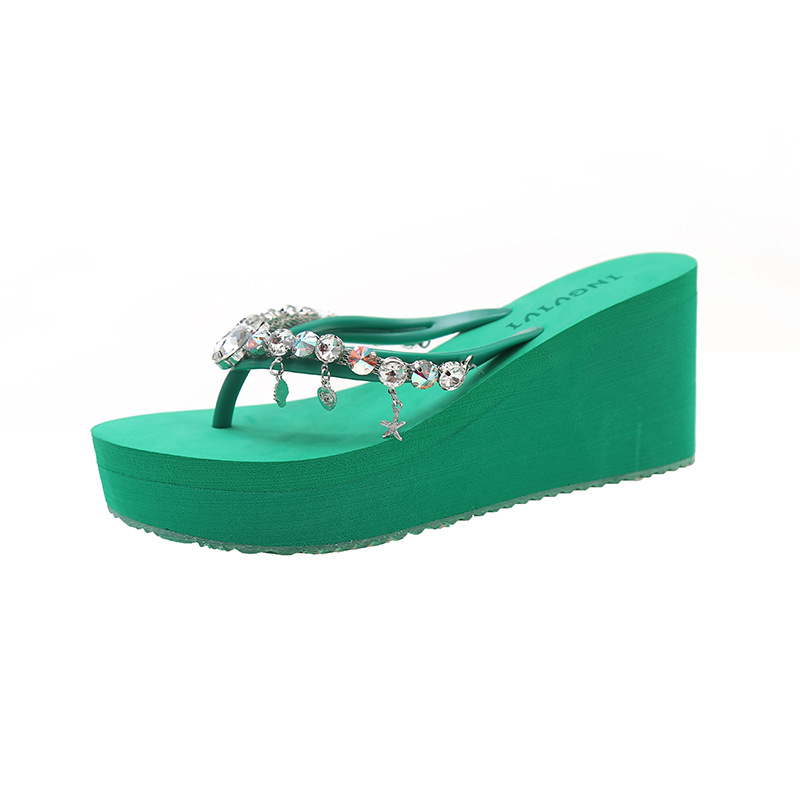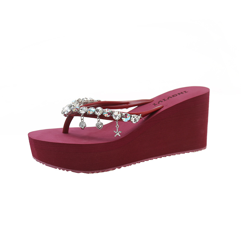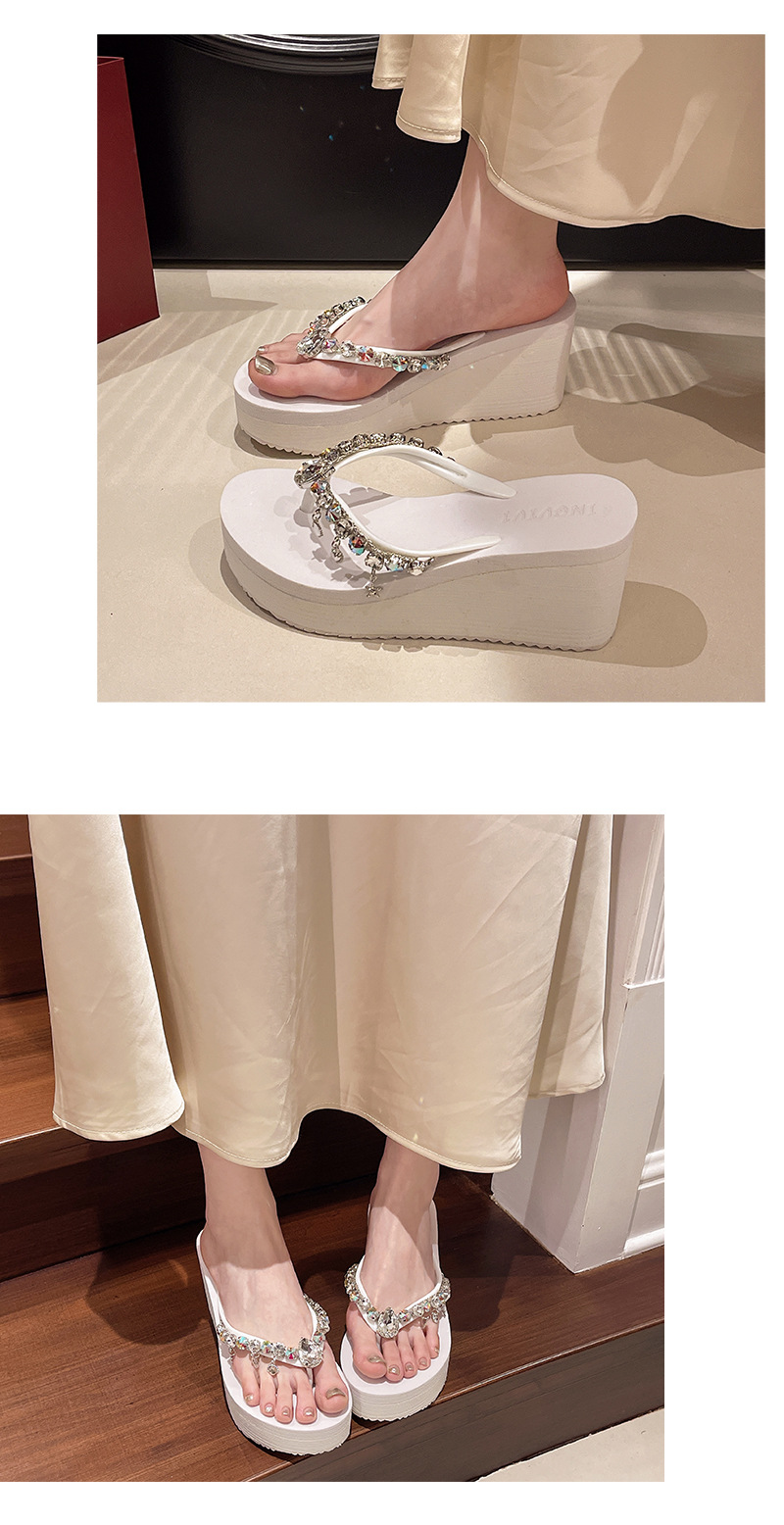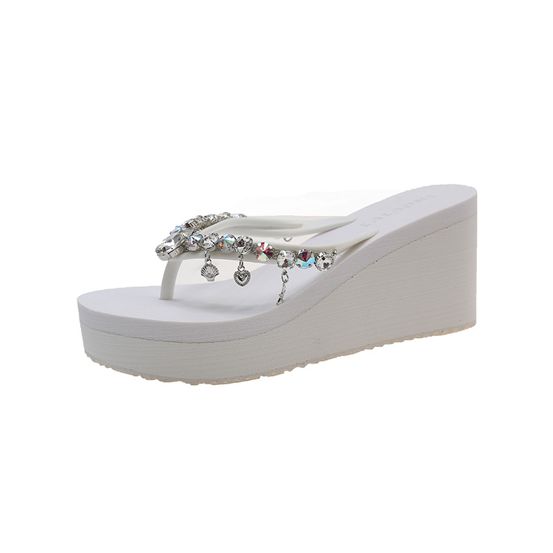 새로운 하이힐 플립 플롭 여성용 라인스톤 체인 펜던트 두꺼운 하단 패션 클립 발 슬리퍼 외부 착용 홀리데이 스타일 비치 슬리퍼