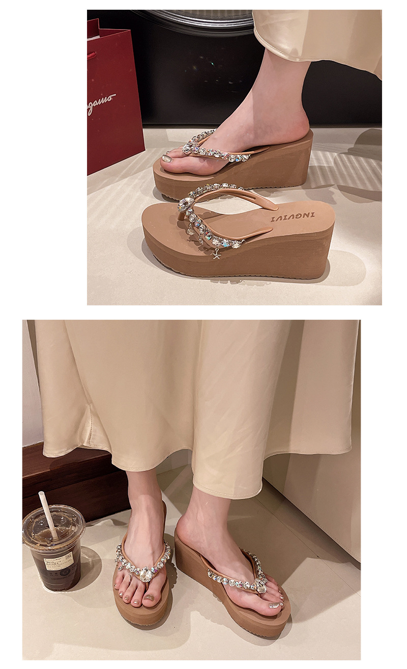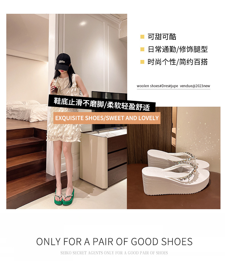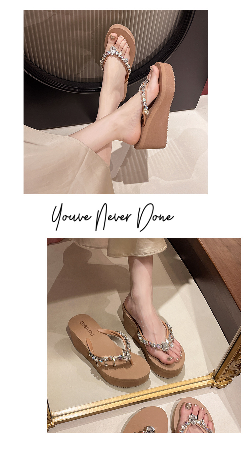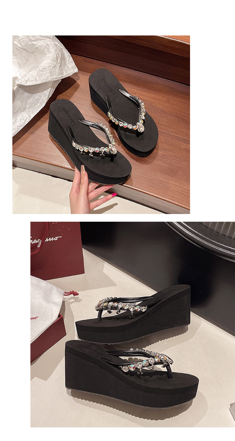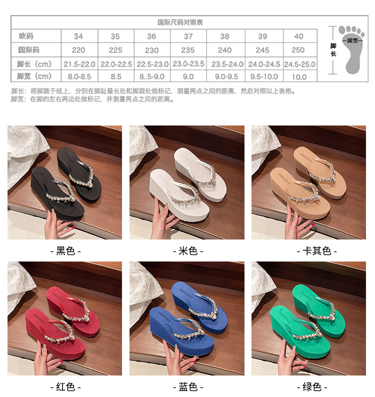 새로운 하이힐 플립 플롭 여성용 라인스톤 체인 펜던트 두꺼운 하단 패션 클립 발 슬리퍼 외부 착용 홀리데이 스타일 비치 슬리퍼스토어 가기