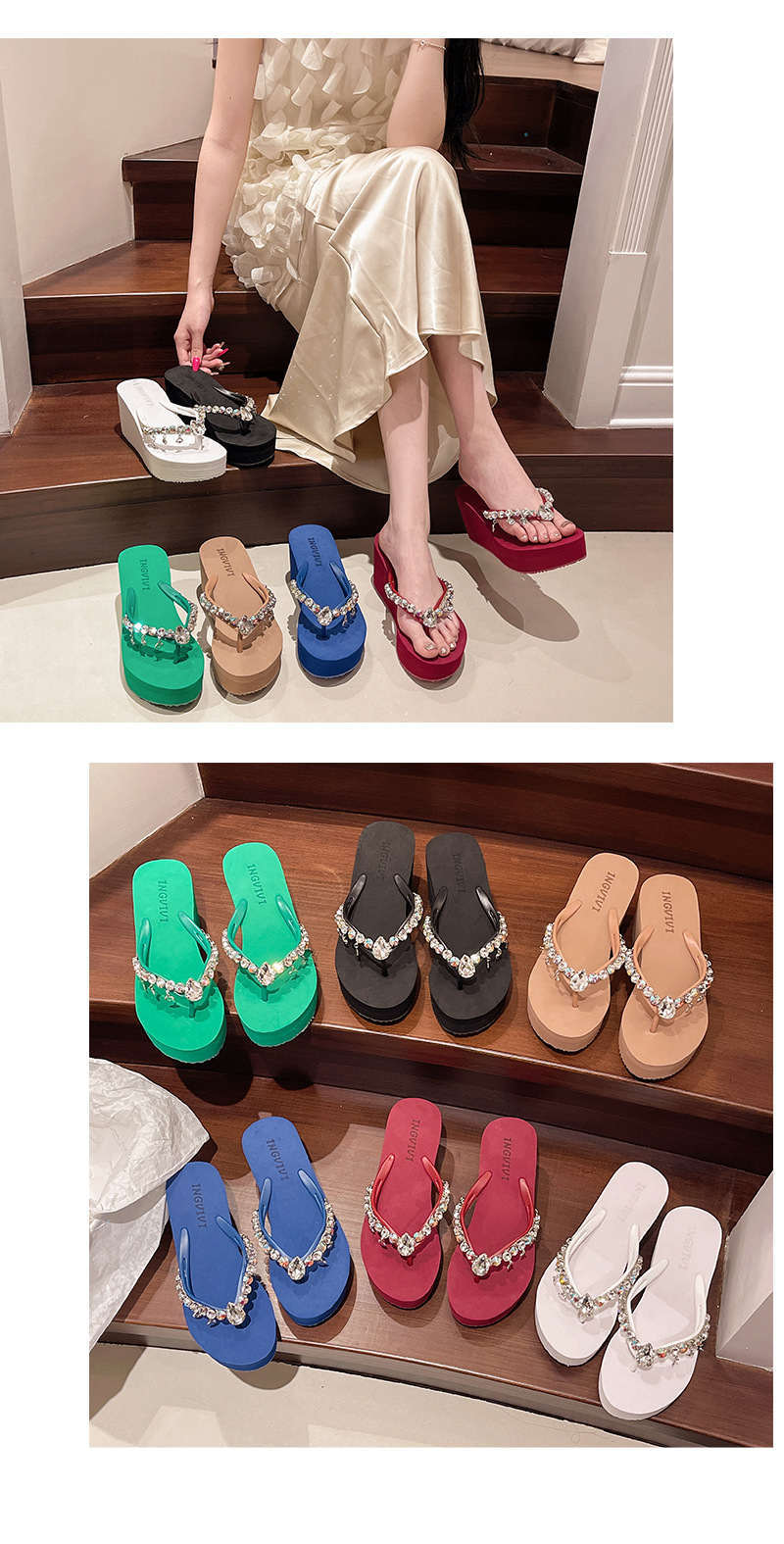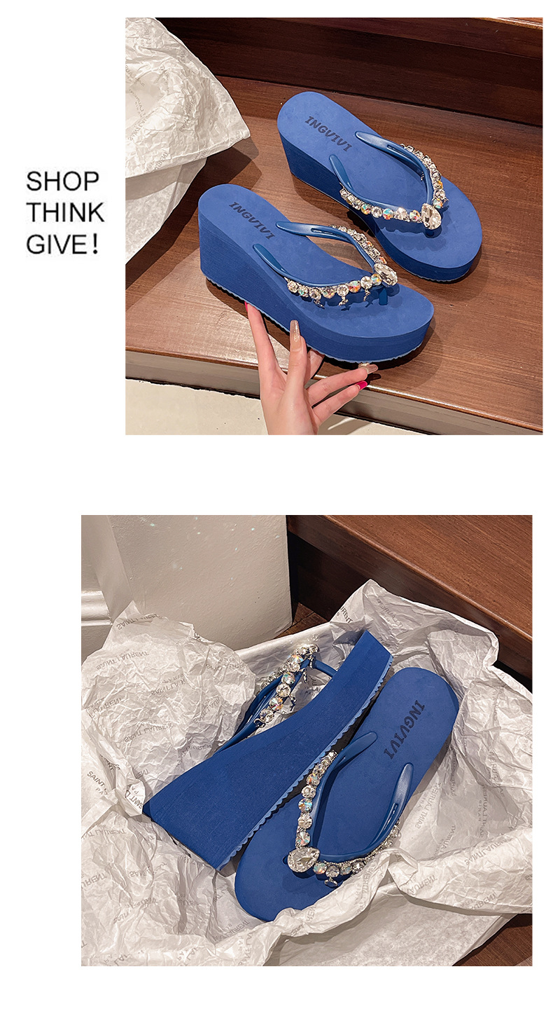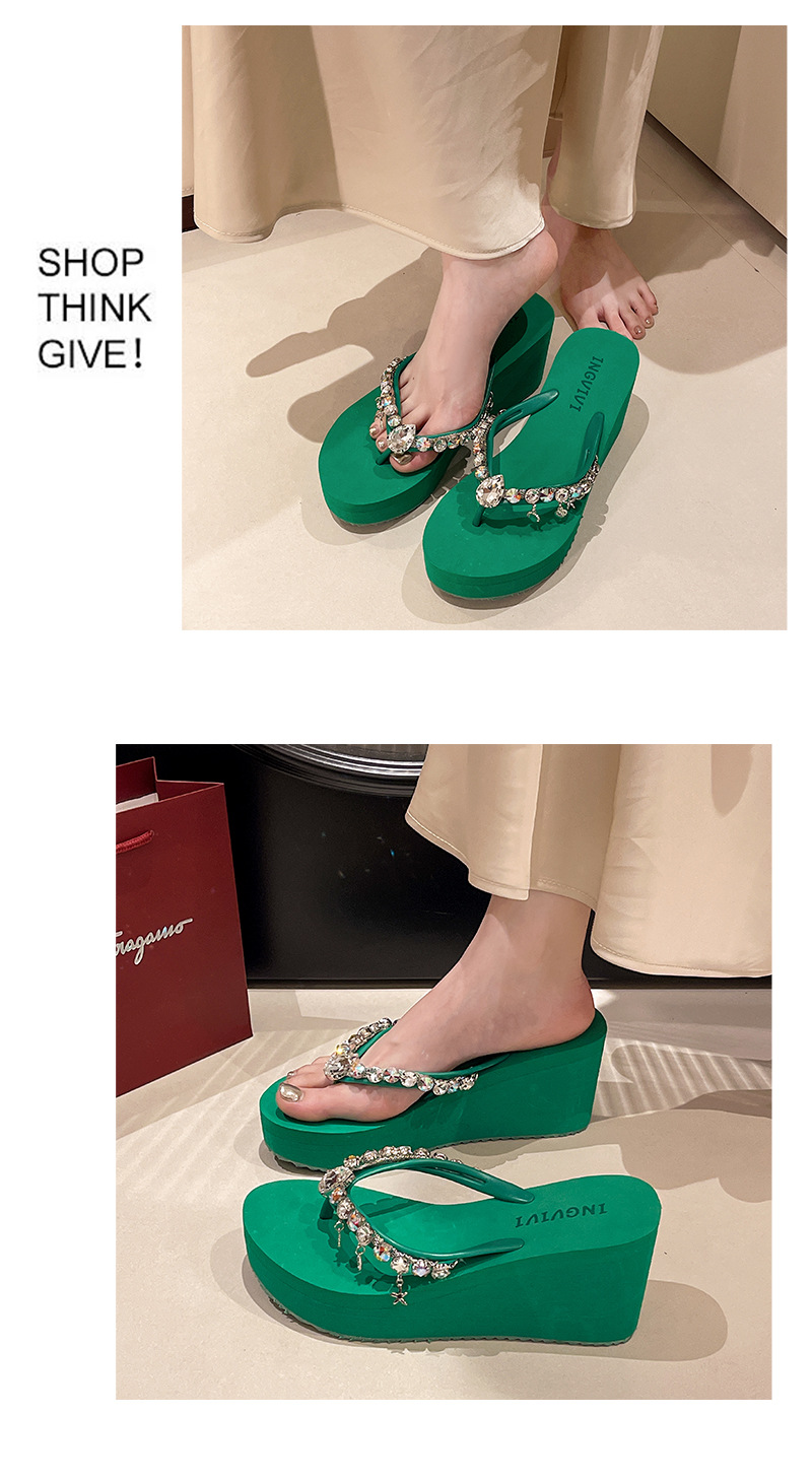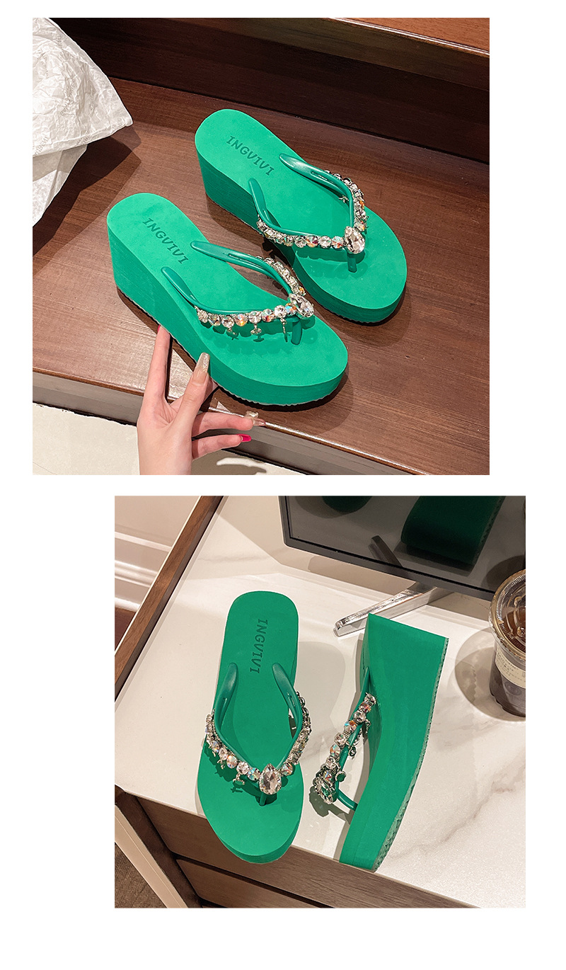 새로운 하이힐 플립 플롭 여성용 라인스톤 체인 펜던트 두꺼운 하단 패션 클립 발 슬리퍼 외부 착용 홀리데이 스타일 비치 슬리퍼스토어 가기