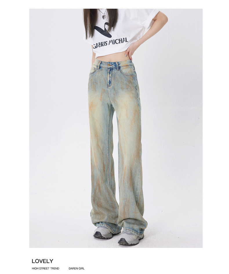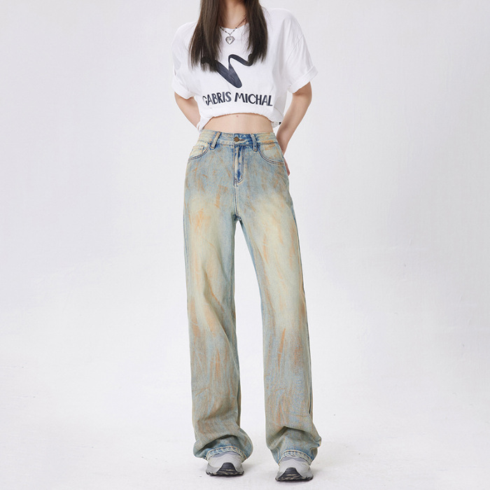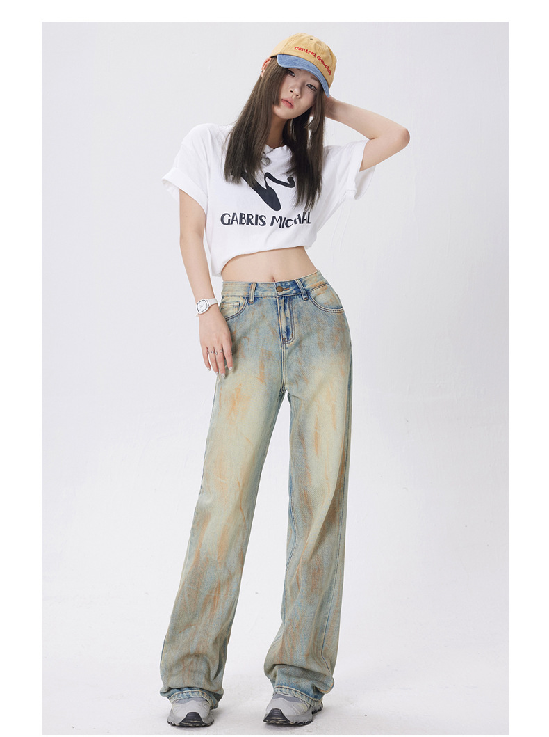 빈티지 높은 허리 스트레이트 청바지 여성의 2024 여름 새로운 느슨한 슬리밍 독특한 더러운 바지 넓은 다리 바지