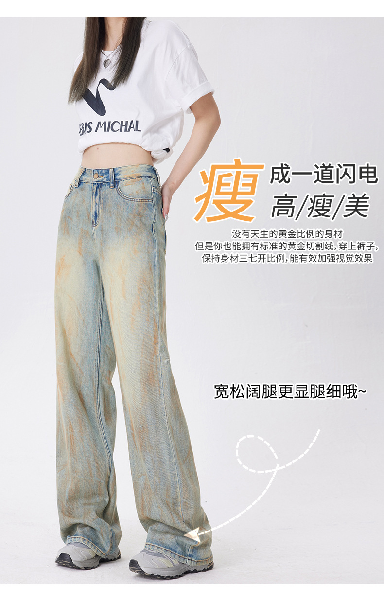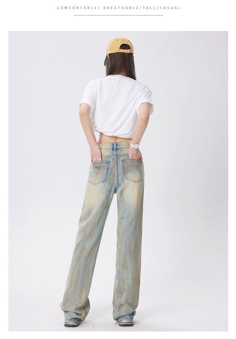 빈티지 높은 허리 스트레이트 청바지 여성의 2024 여름 새로운 느슨한 슬리밍 독특한 더러운 바지 넓은 다리 바지스토어 가기