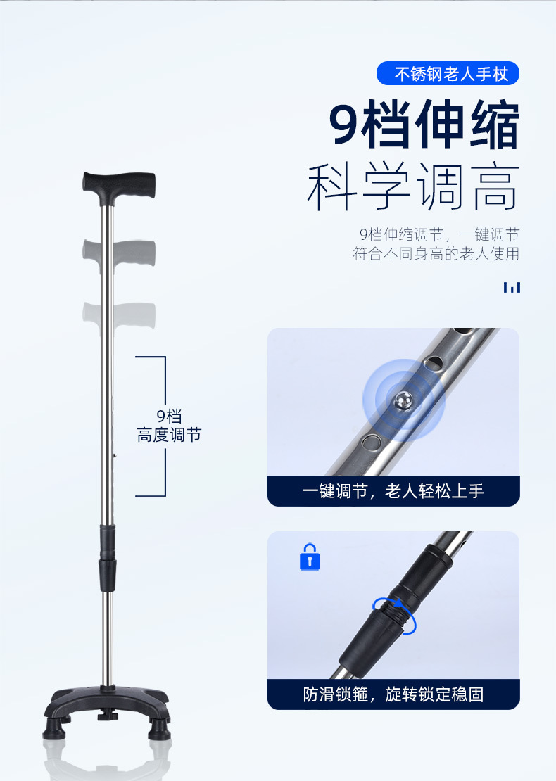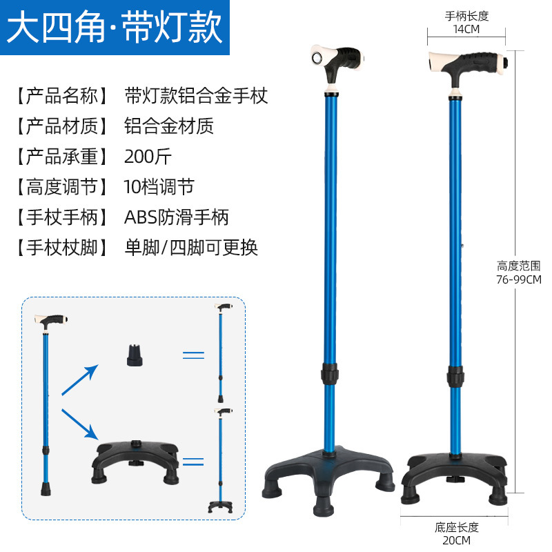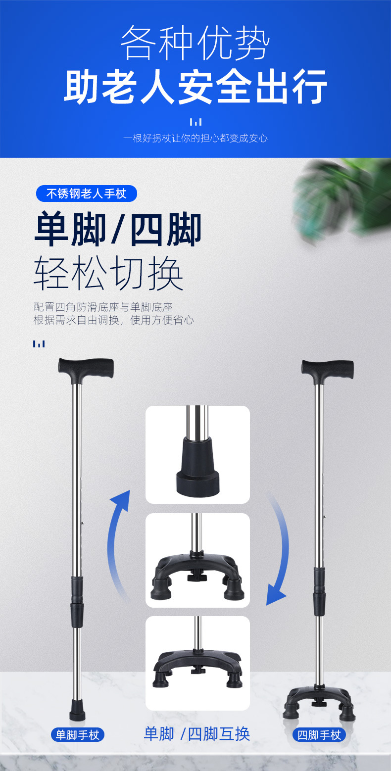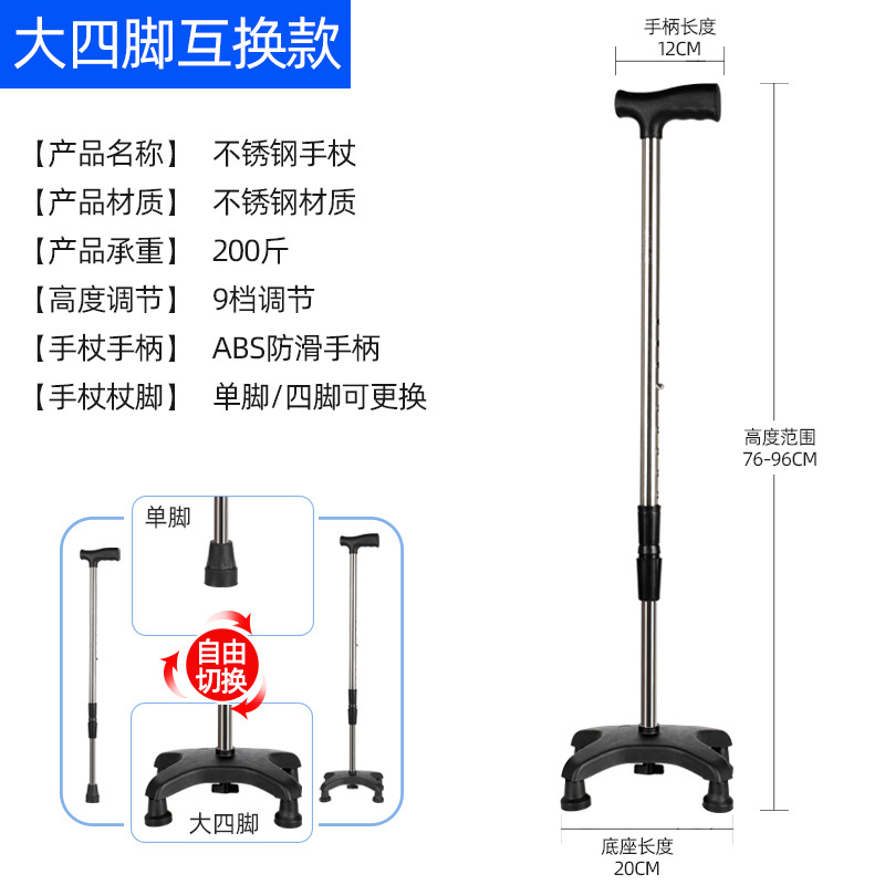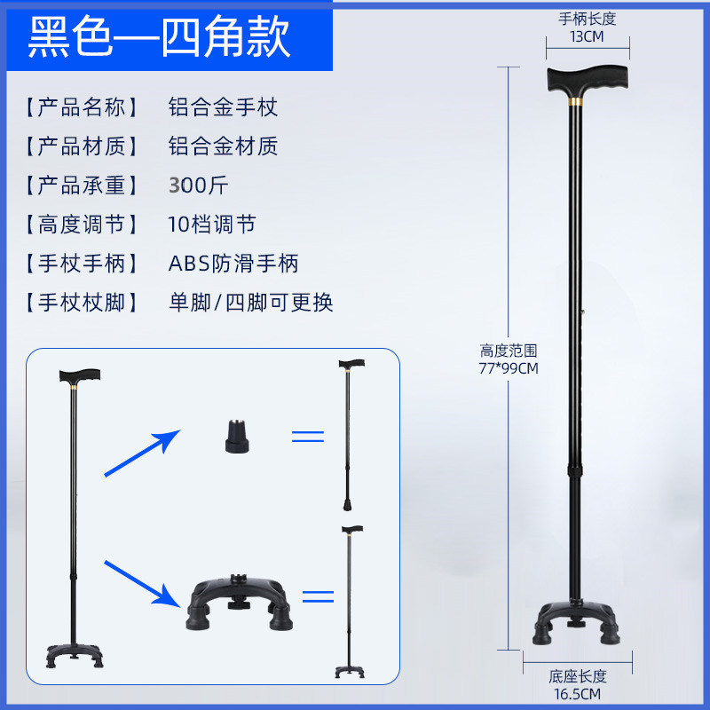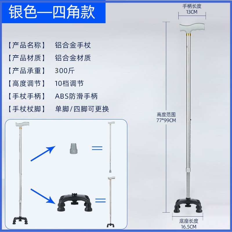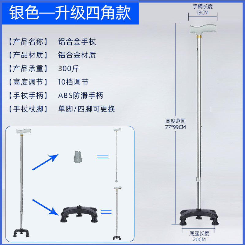 1 피트 조절 워킹 노인 트레킹을위한 스테인레스 스틸 4 코너 목발 조정 가능한 알루미늄 합금 지팡이
