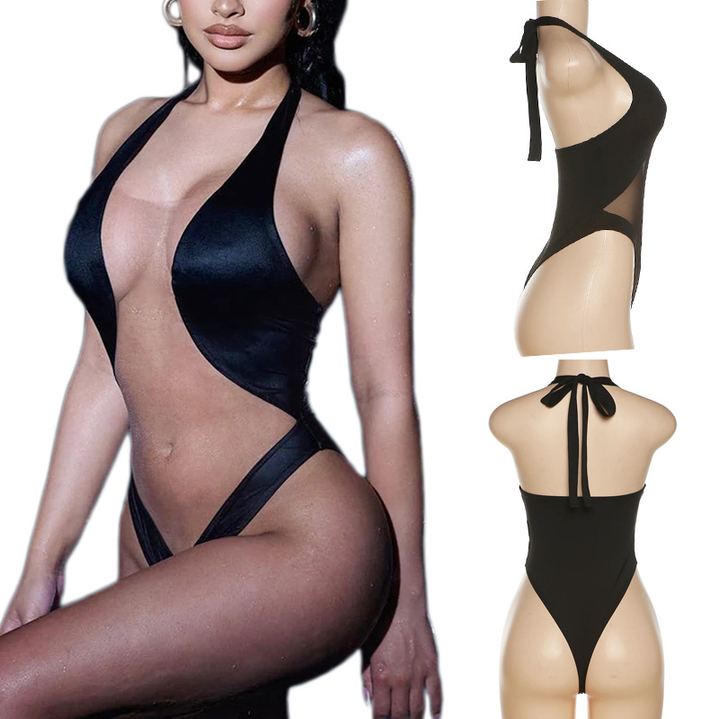 여름 현금 여성용 중공 점프 수트 스트레치 메쉬 스티칭 점프 수트 아마존 넥 백리스 수영복