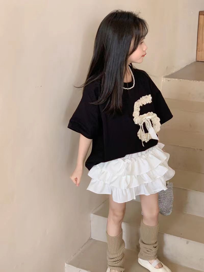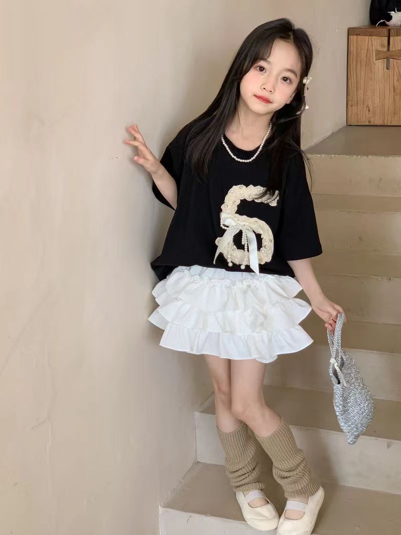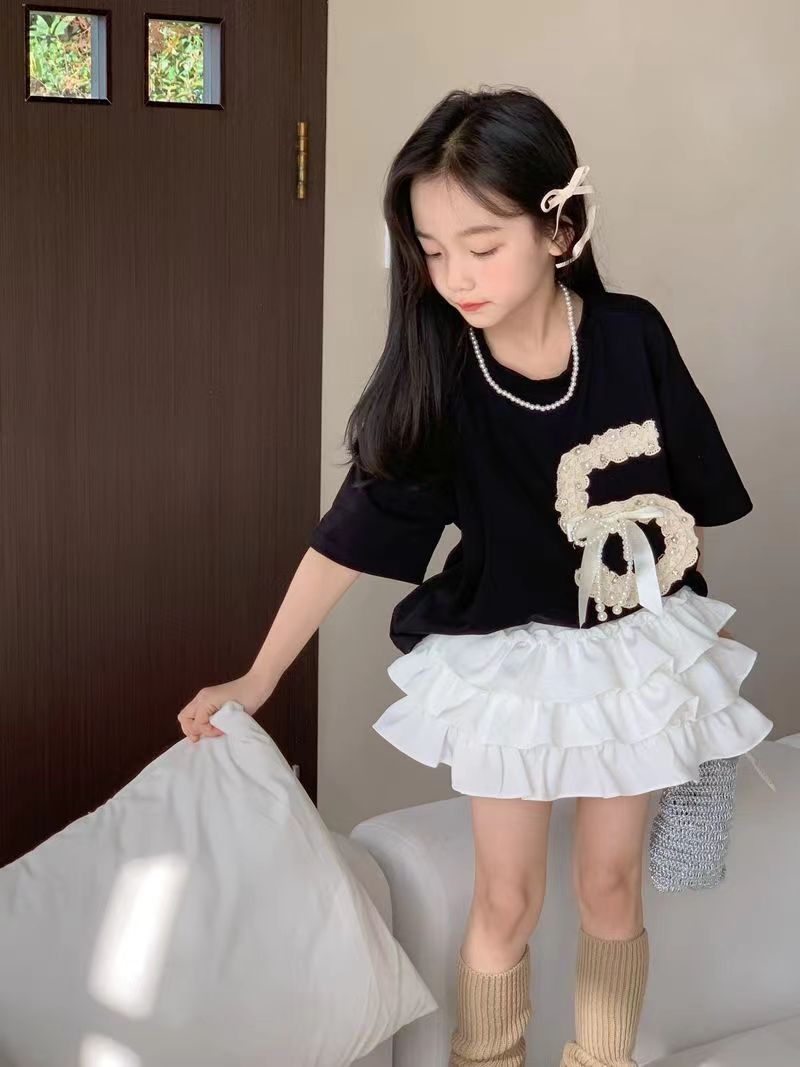 여자 여름 세트 2024 새로운 한국 스타일 큰 어린이 중공업 짧은 소매 어린이 케이크 스커트 투피스 패션