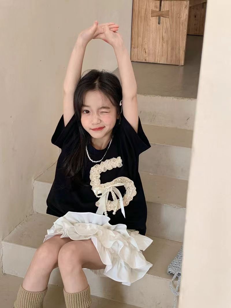 여자 여름 세트 2024 새로운 한국 스타일 큰 어린이 중공업 짧은 소매 어린이 케이크 스커트 투피스 패션스토어 가기