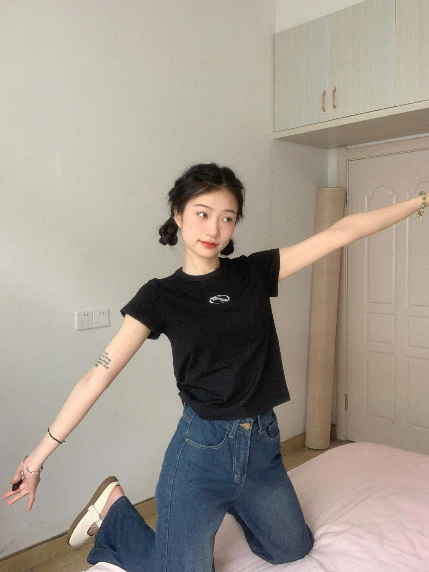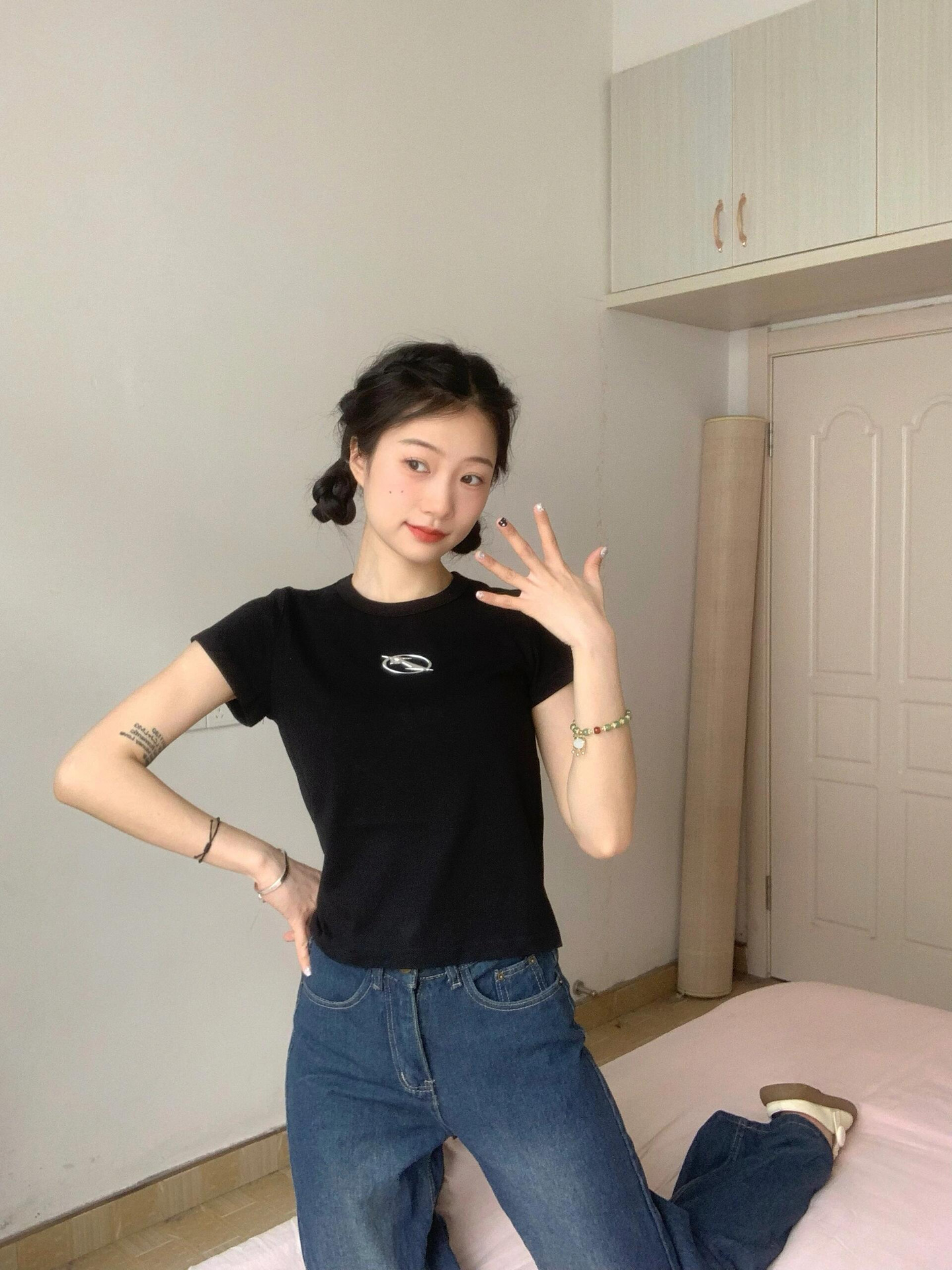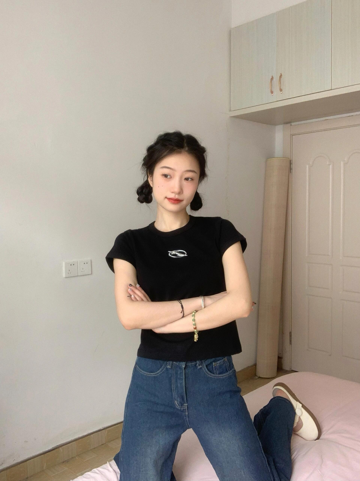 [3 차원 액체 금속 40 95% 면 + 5% 스판덱스] 뜨거운 소녀 슬림 슬림 슬림 어깨 반팔 티셔츠 여성 블랙스토어 가기