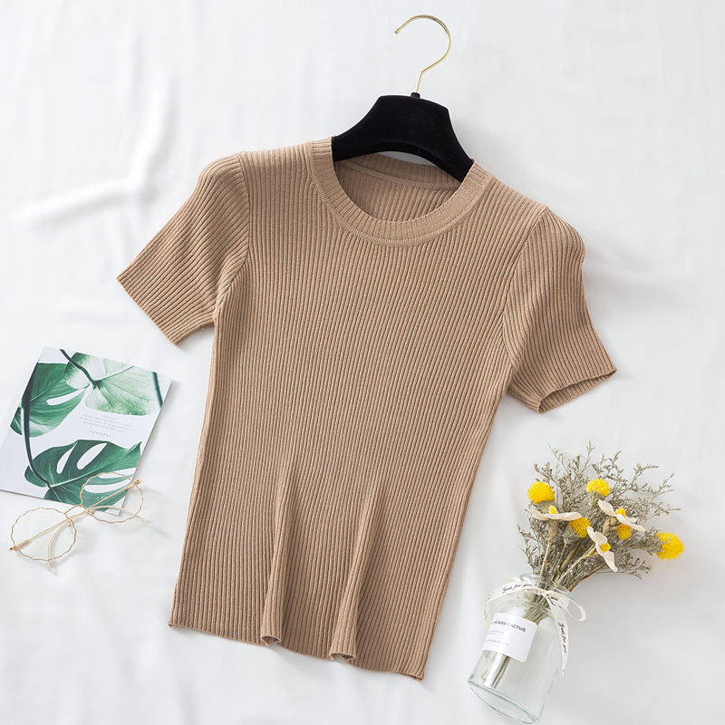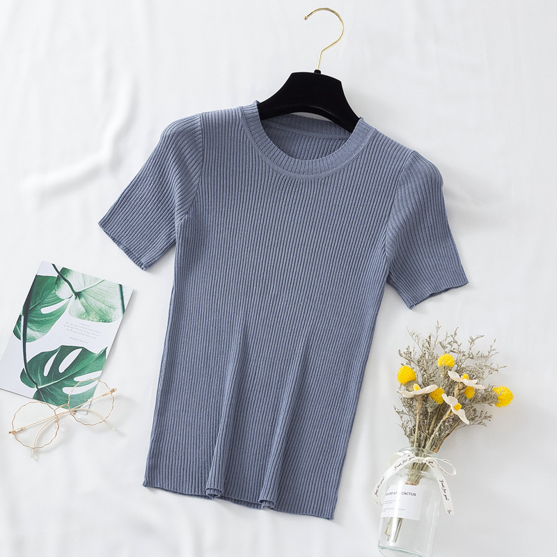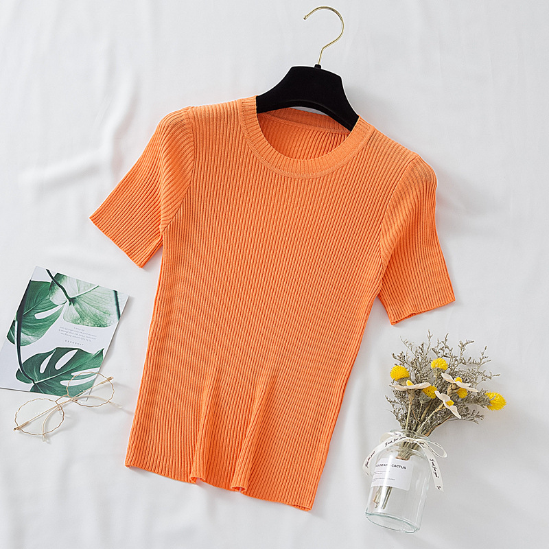 2024 Xia Xin Dopamine Crewneck 슬림베이스 반팔 티셔츠 여성용 탑 타이트핏 아이스 실크 니트 씬스토어 가기