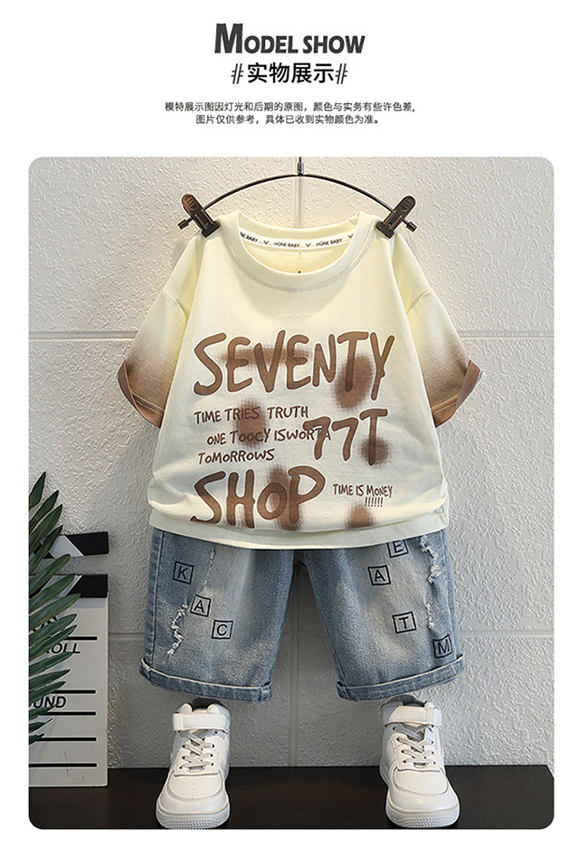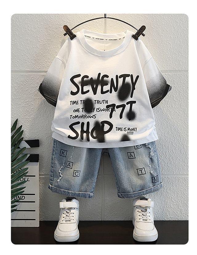 소년 여름 캐주얼 세트 2024 새로운 소년 아기 반팔 편지 티셔츠 어린이 여름 투피스 유행 세트스토어 가기