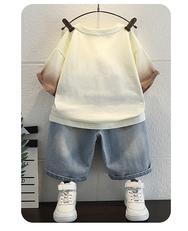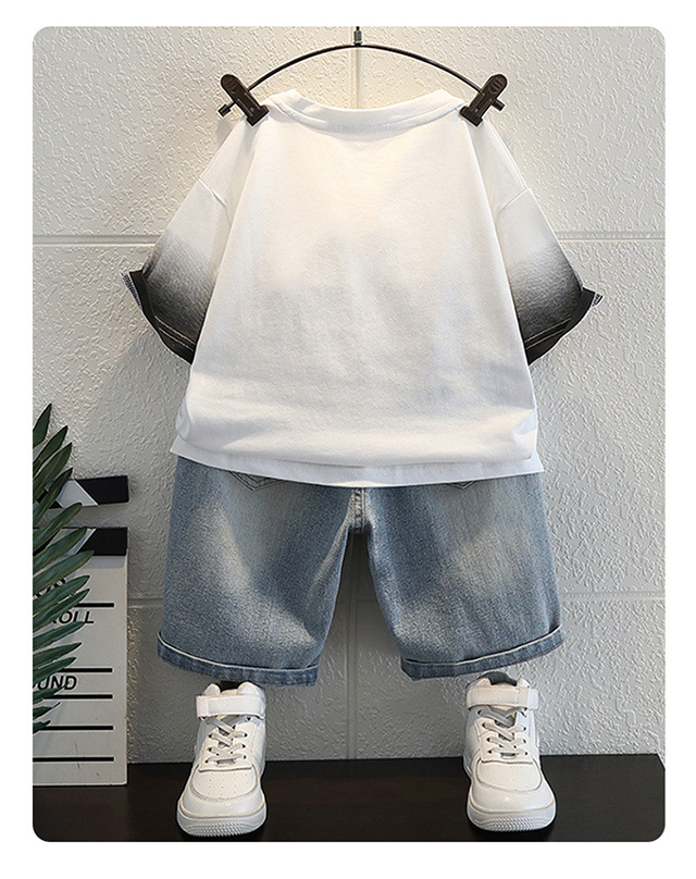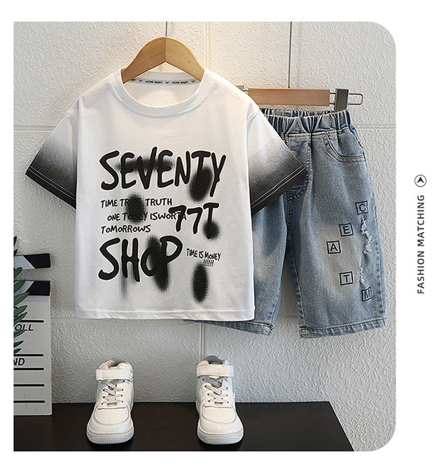 소년 여름 캐주얼 세트 2024 새로운 소년 아기 반팔 편지 티셔츠 어린이 여름 투피스 유행 세트
