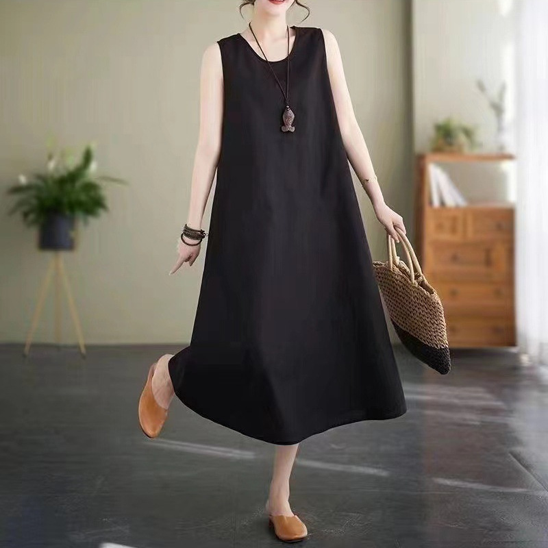 어머니의 둥근 목 민소매 흔적 원피스 여름 한국 스타일 플러스 사이즈 여성 단색 원피스 게으른 스타일 원피스 여성스토어 가기