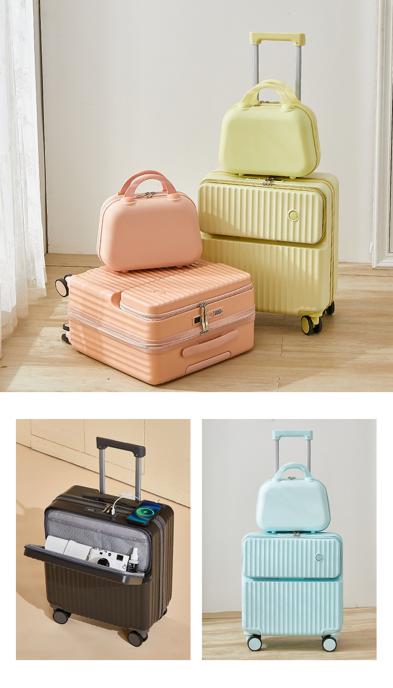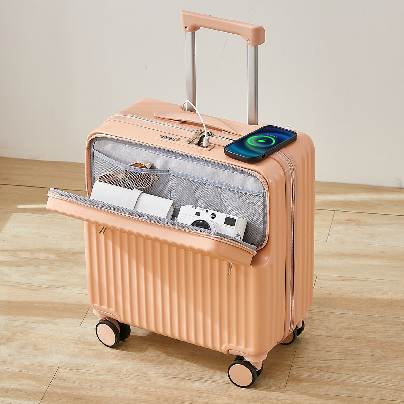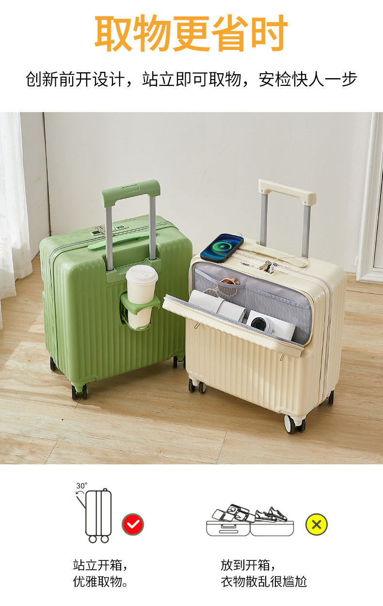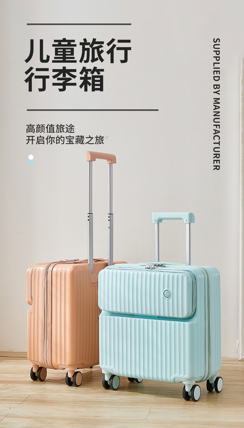 전면 개방 수하물 케이스 18 인치 다기능 탑승 트롤리 케이스 USB 인터페이스 어린이 앉아 여행 케이스