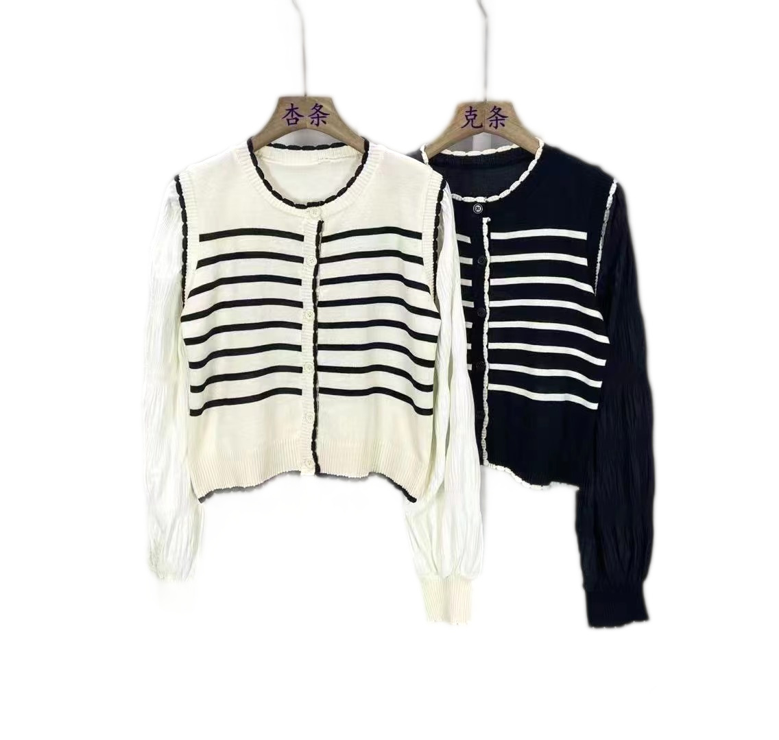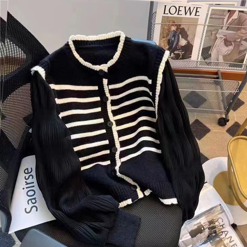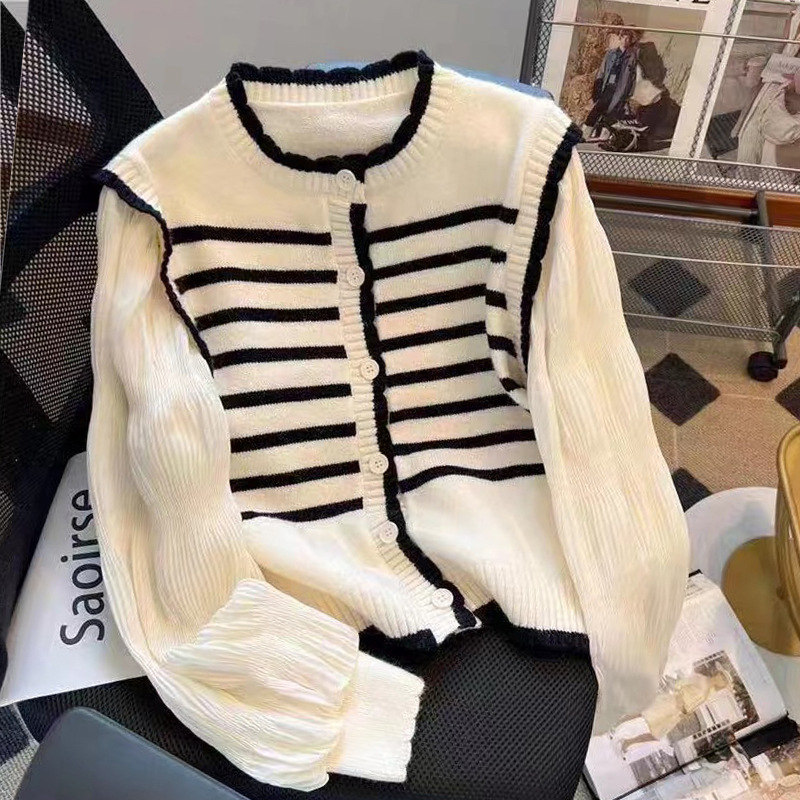 초봄 신상 한국 스타일 라운드넥 스트라이프 니트 스웨터 여성용 배색 주름 퍼프 소매 가디건 탑스토어 가기