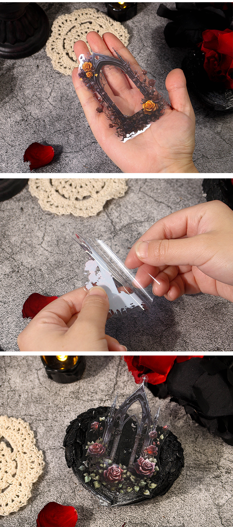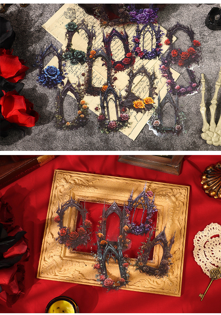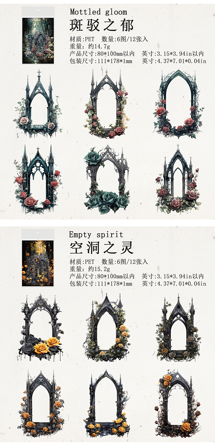 국경 고대 숲 첨탑 창 프레임 시리즈 복고풍 고딕 스타일 PET 손 계정 스티커 손 계정 꽃 소재 4
