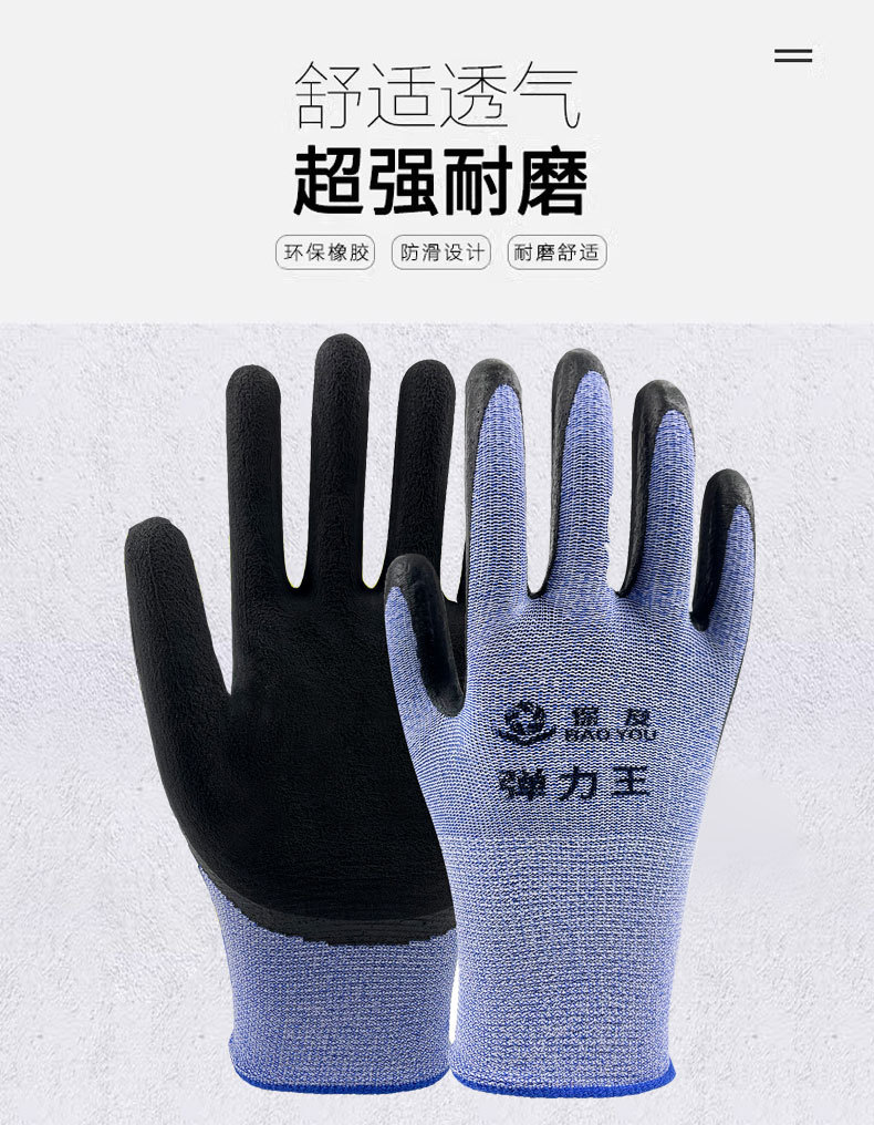 Baoyou 담근 블루 원사 블랙 고무 내마모성 통기성 고 탄성 라텍스 폼 미끄럼 방지 처리 노동 보호 노동 보호 장갑스토어 가기