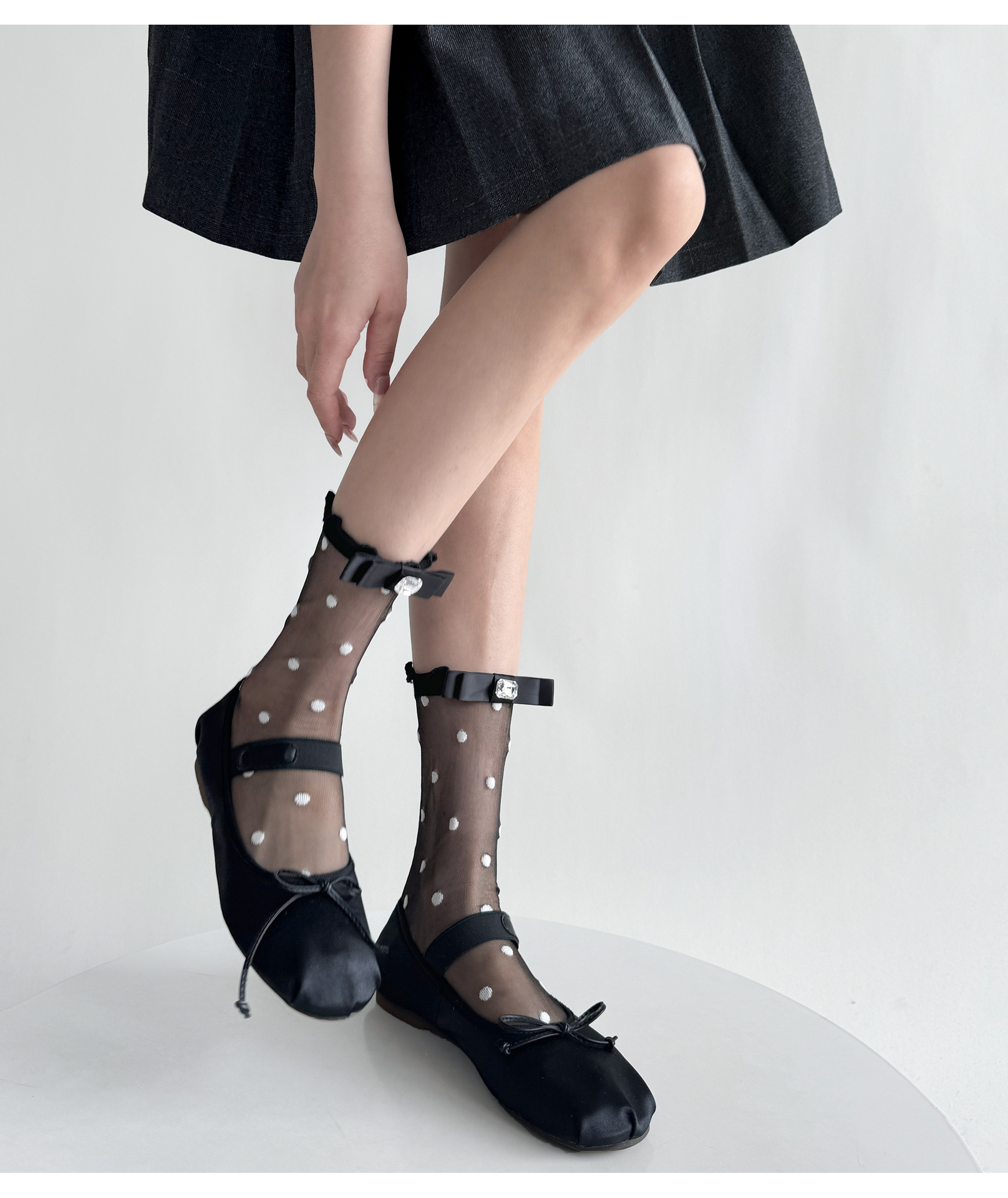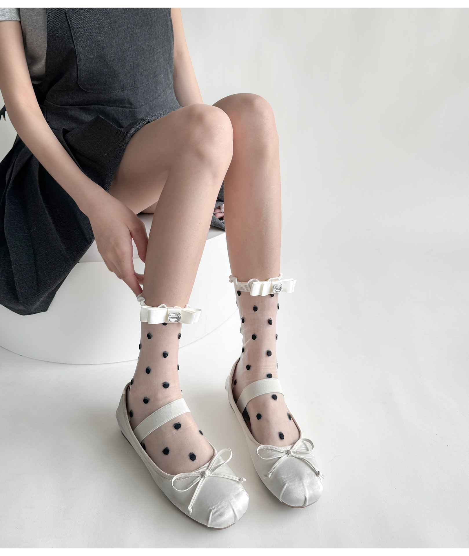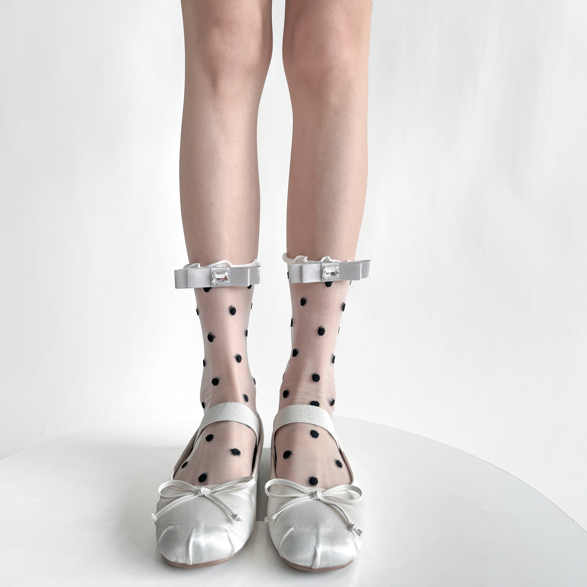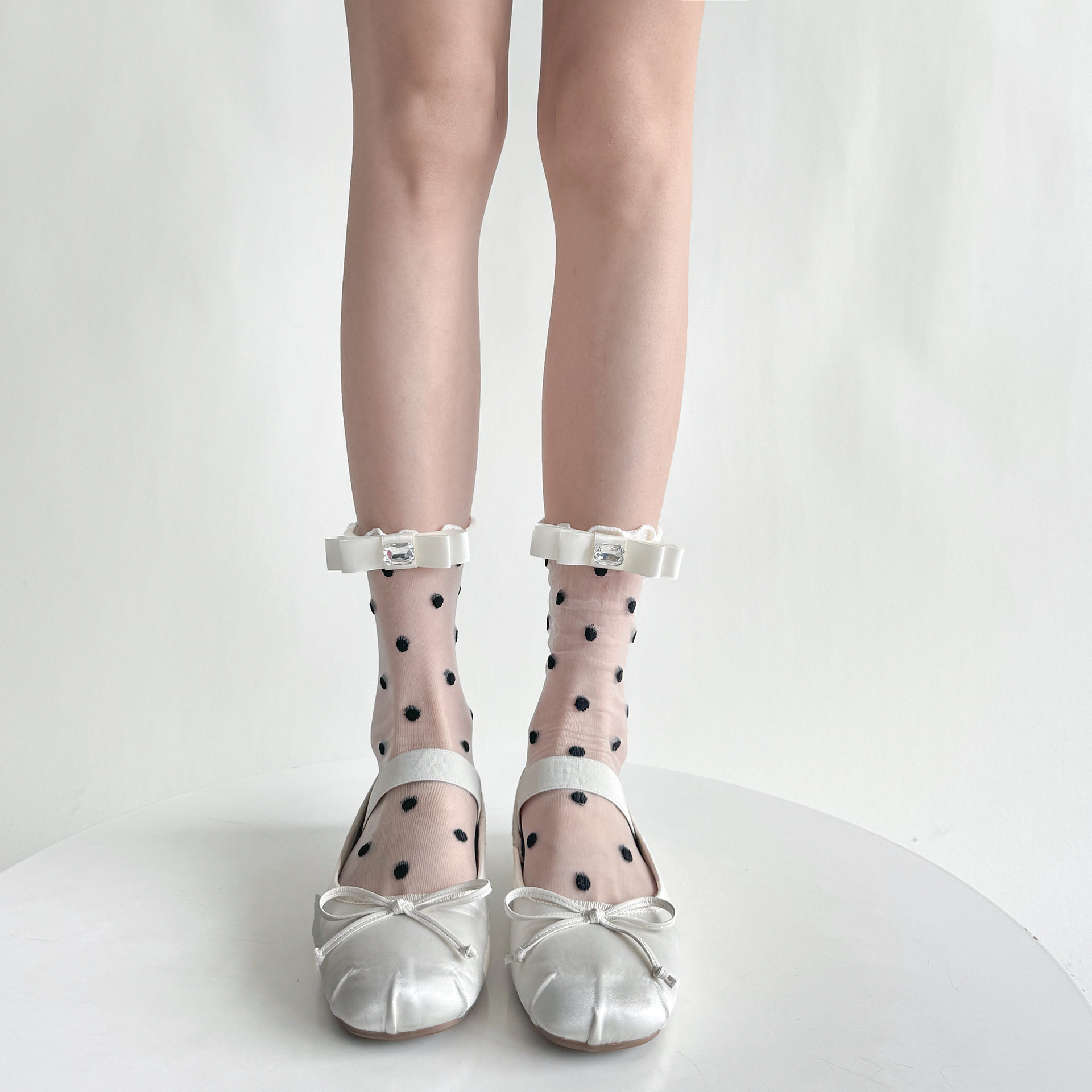 봄과 여름 매우 얇은 고기 파 스팟 스타킹 달콤한 소녀 흑백 물방울 무늬 활 다이아몬드 유리 실크 튜브 스타킹