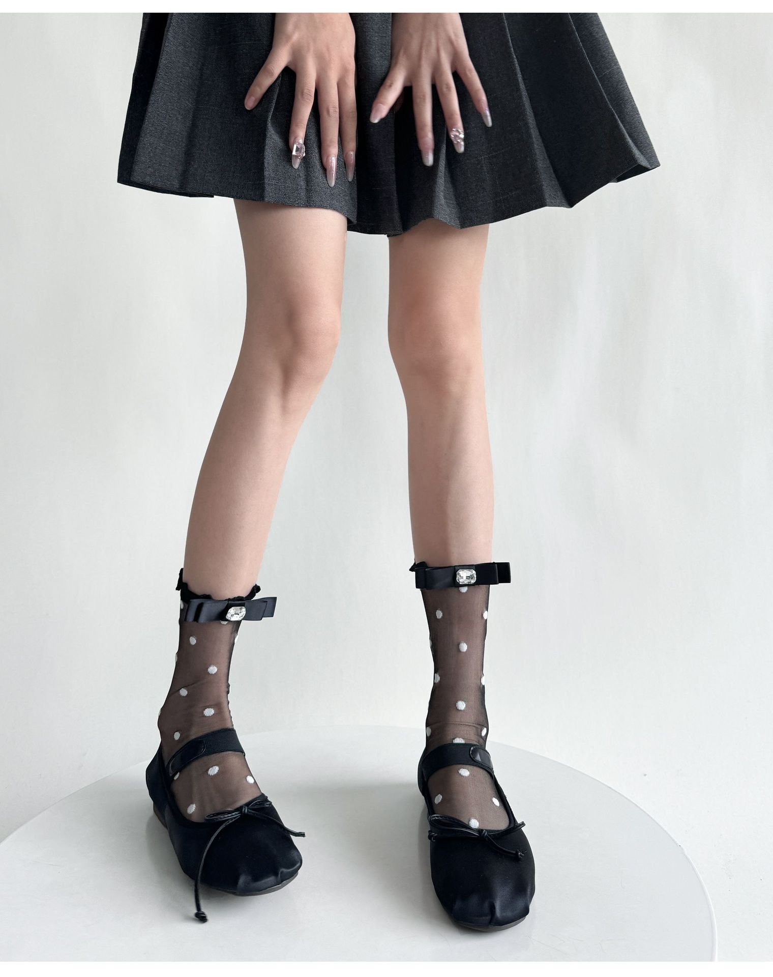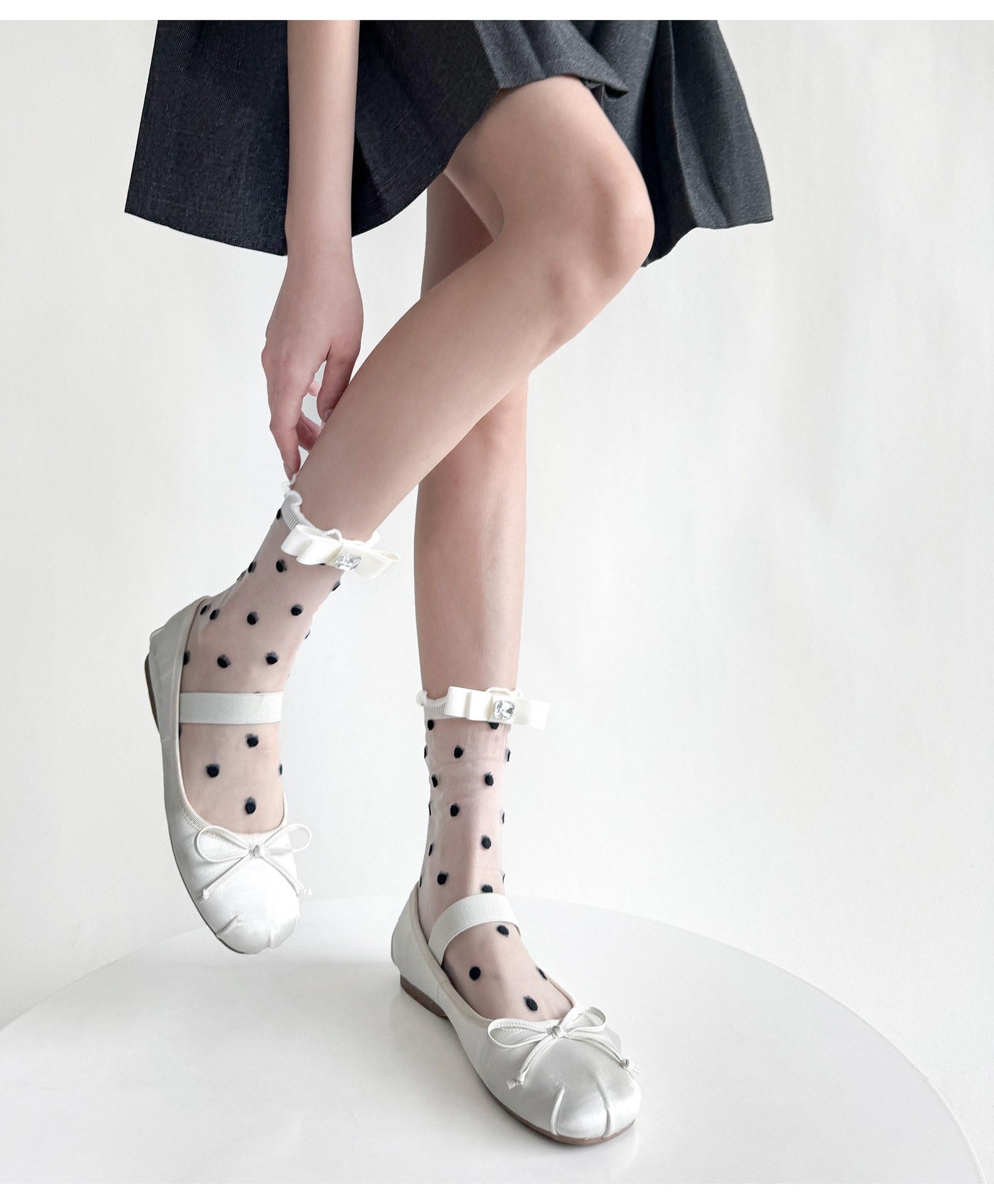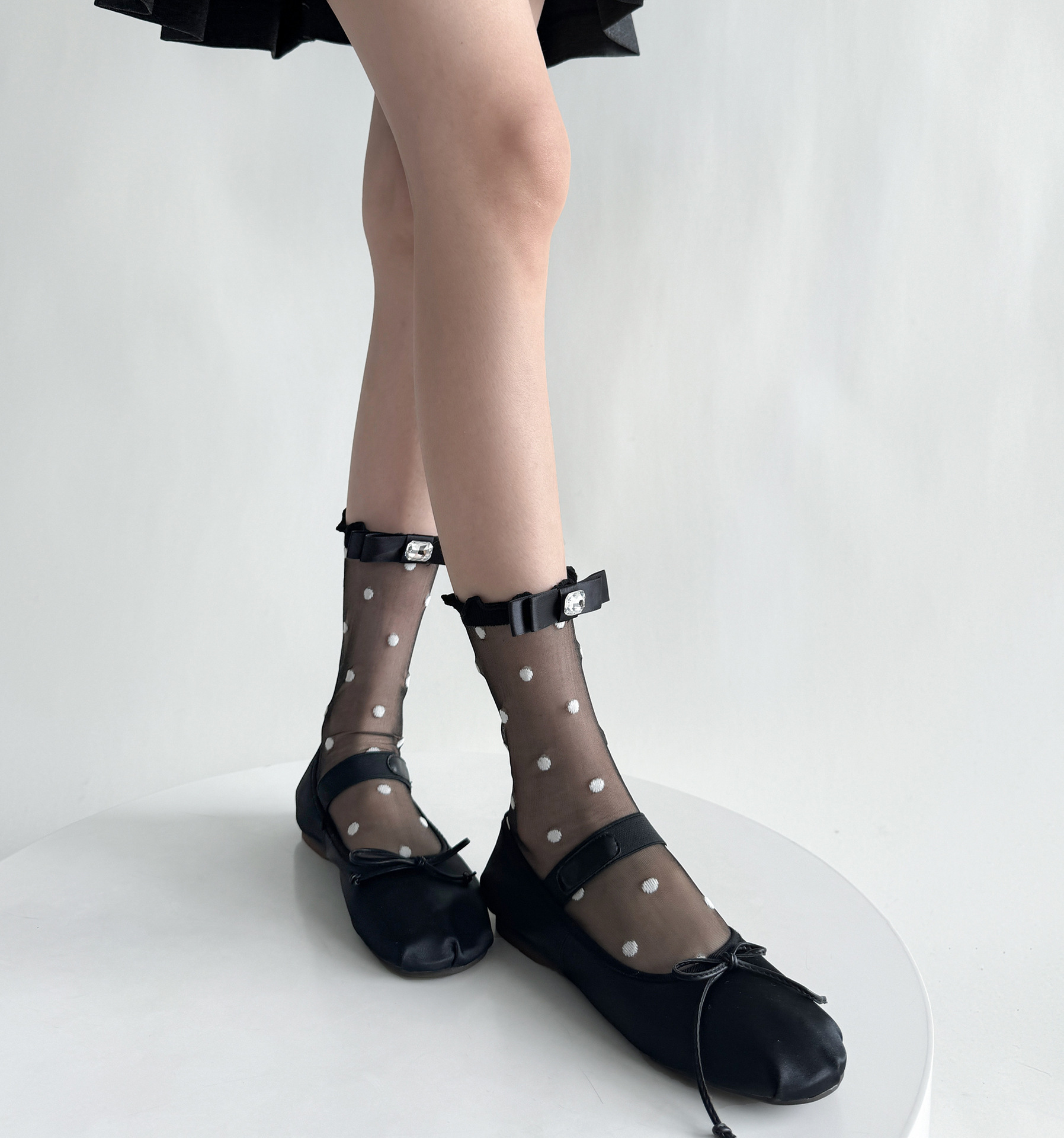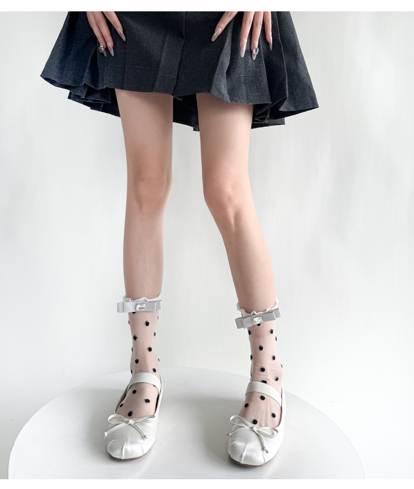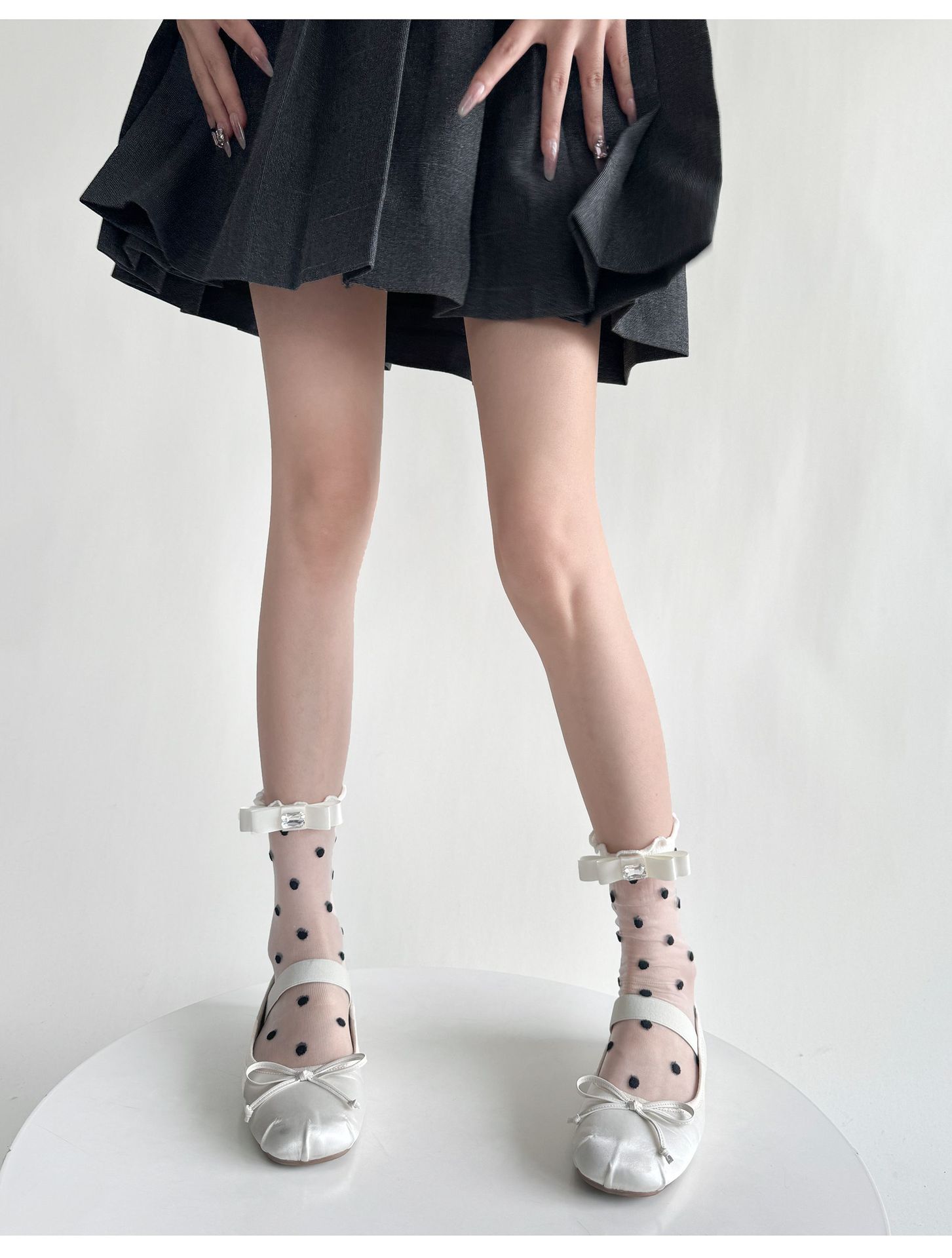봄과 여름 매우 얇은 고기 파 스팟 스타킹 달콤한 소녀 흑백 물방울 무늬 활 다이아몬드 유리 실크 튜브 스타킹