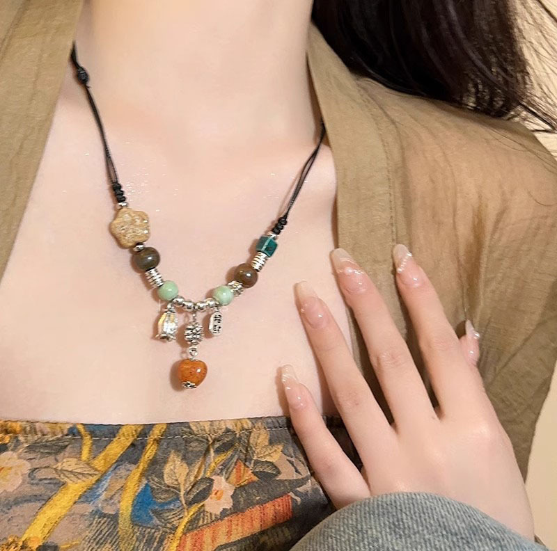새로운 중국 골동품 컬러 세라믹 구슬 목걸이 여성용 복고풍 짠 로프 목걸이 국가 스타일 선 한후 쇄골 체인스토어 가기