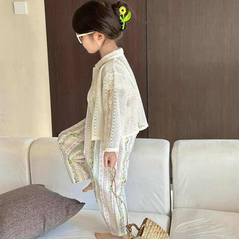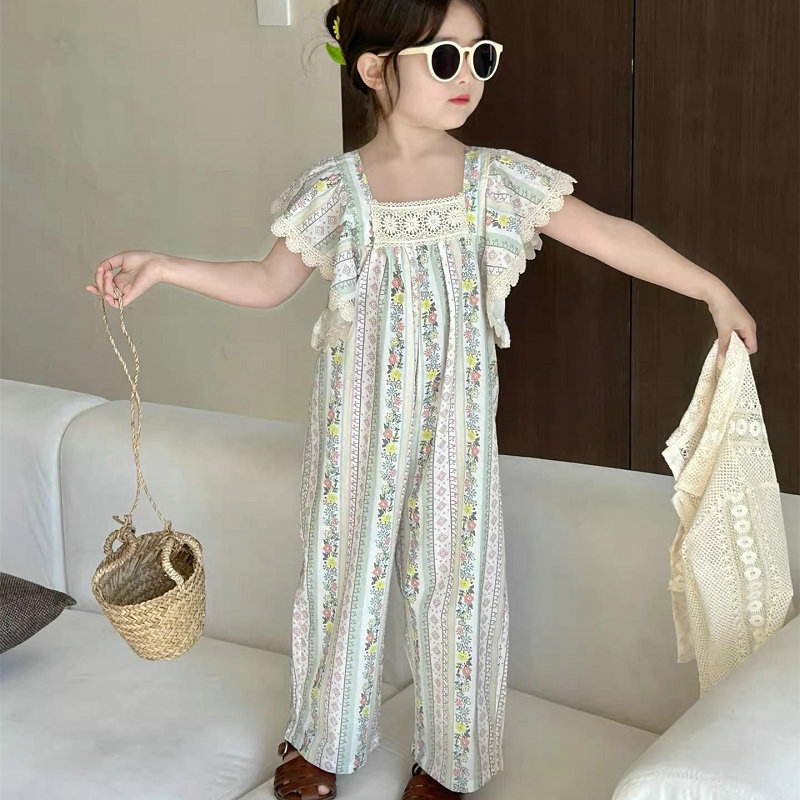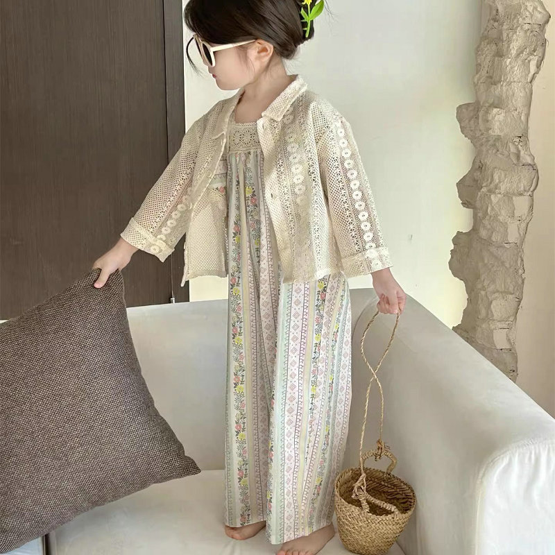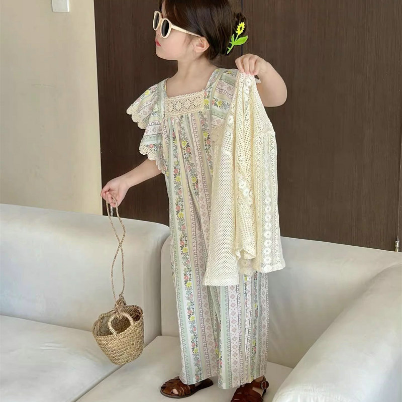 아동복 여아 세트, 빈티지 메쉬 재킷과 꽃무늬 점프수트, 2025 여름 신상품, 수출용스토어 가기