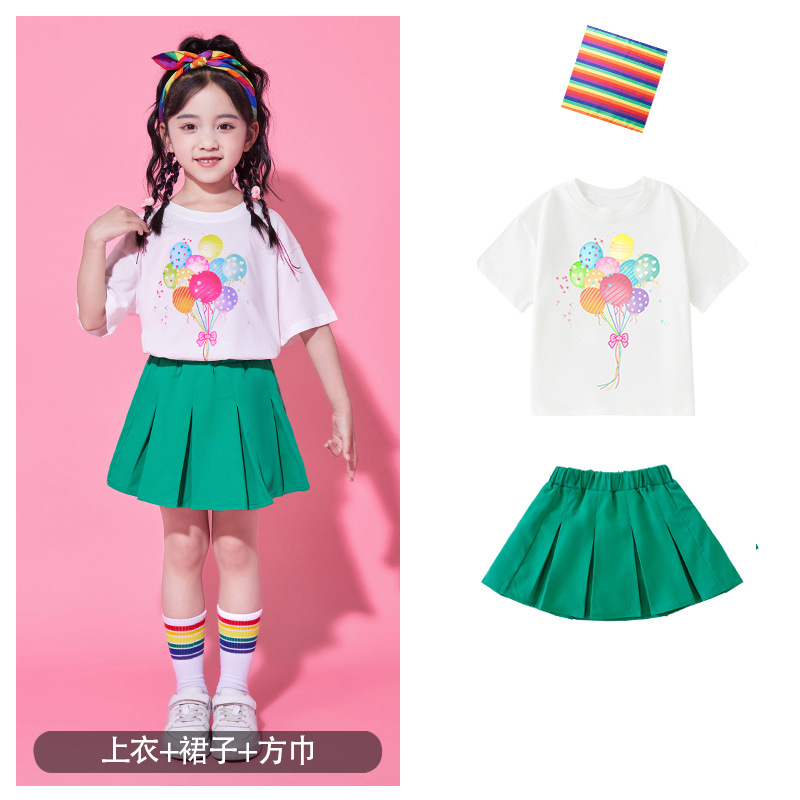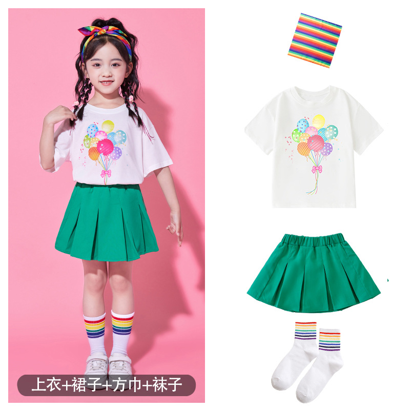 • 763 컬러풀 벌룬 화이트 반팔 + 702 그린 스커트 + 레인보우 스퀘어 스카프 + 레인보우 양말