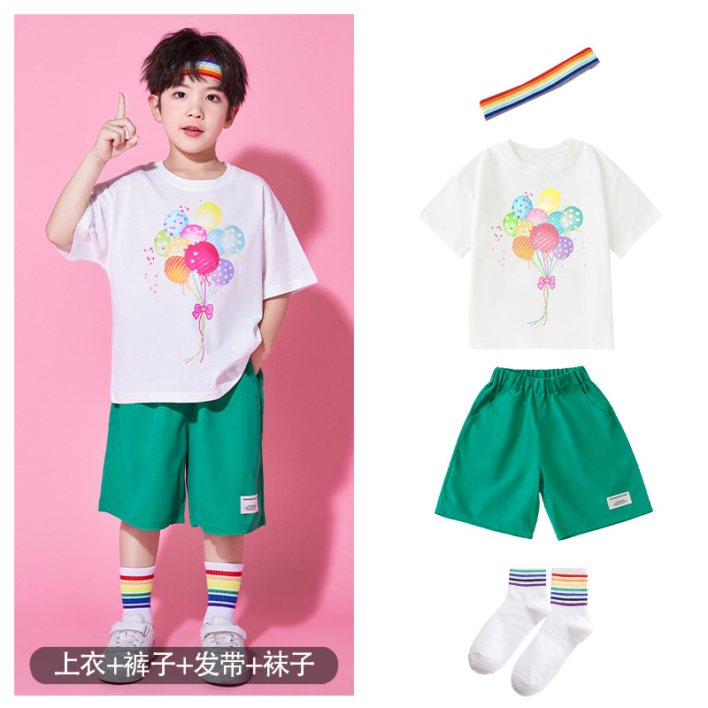• 763 컬러 벌룬 화이트 반팔 + 701 그린 반바지 + 레인보우 머리띠 + 레인보우 양말