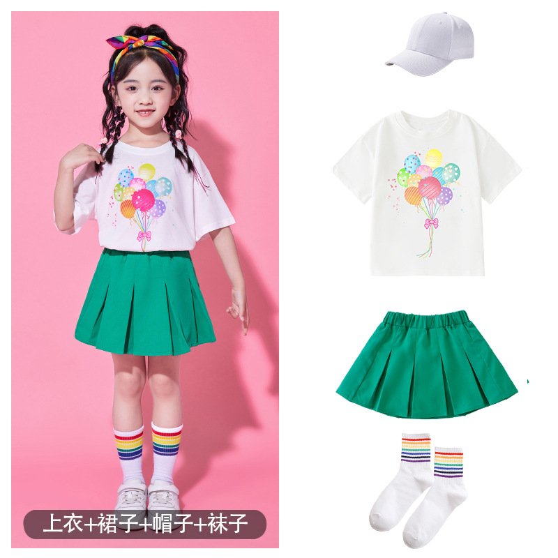 • 763 컬러풀 벌룬 화이트 반팔 + 702 그린 스커트 + 퓨어 화이트 야구 모자 + 레인보우 양말