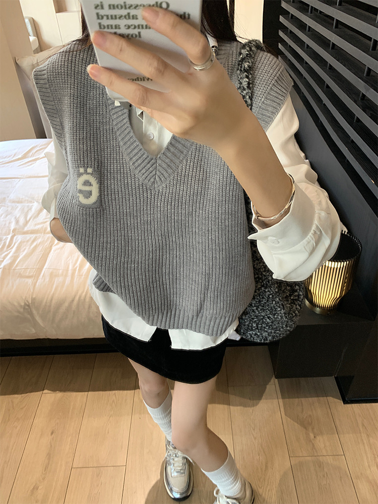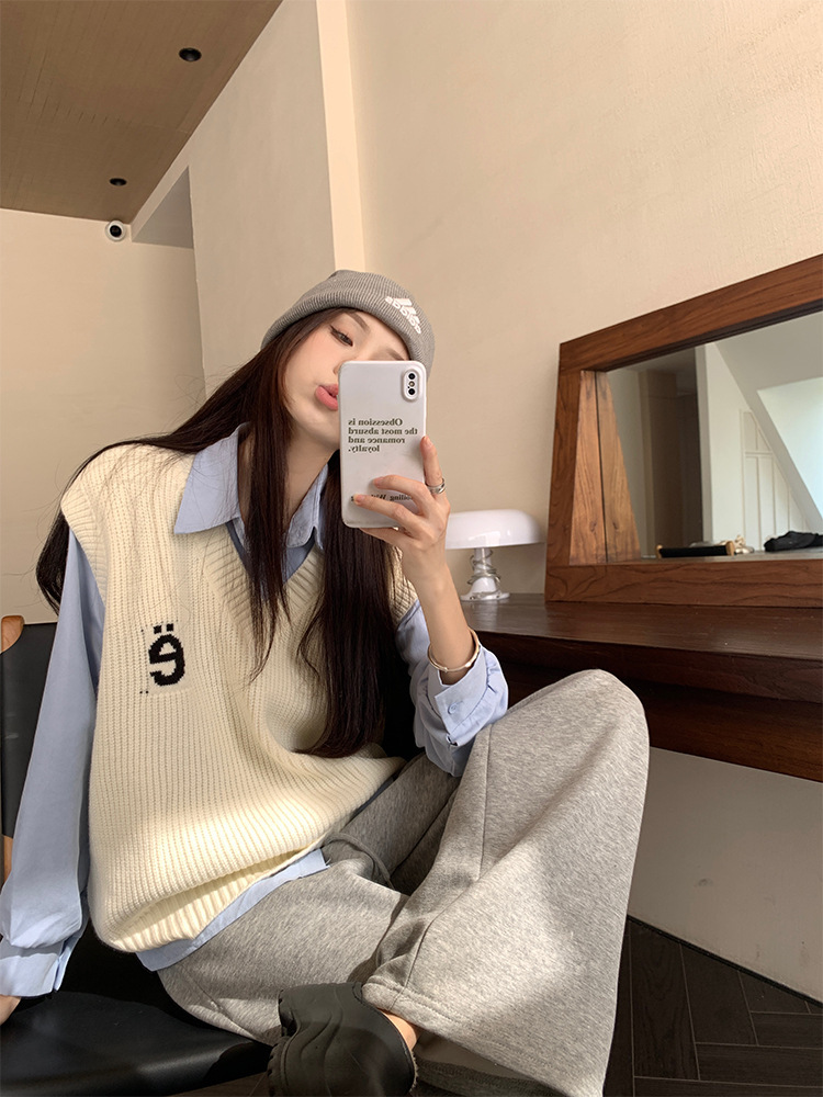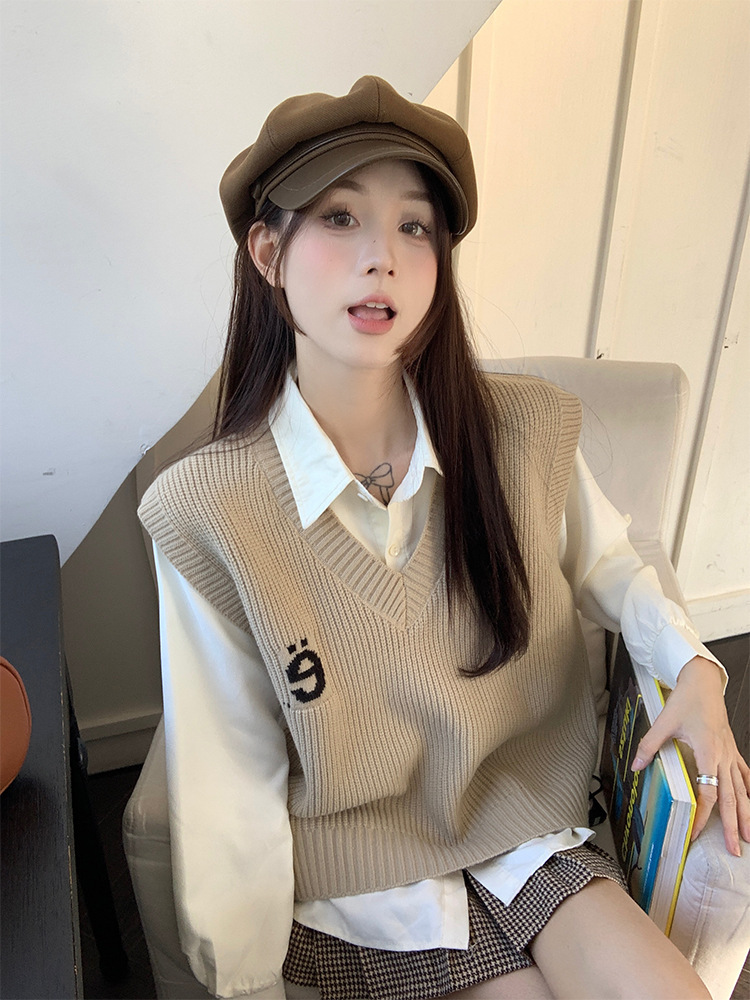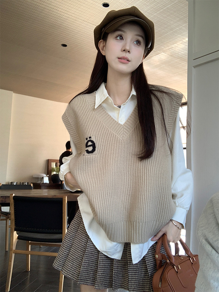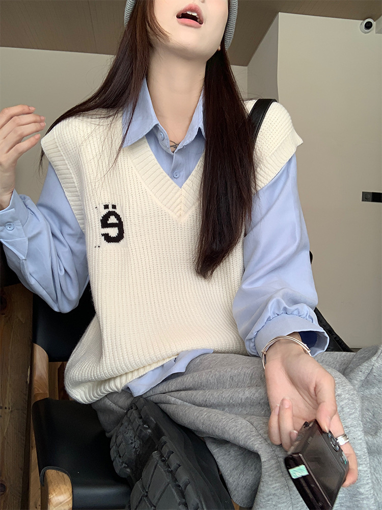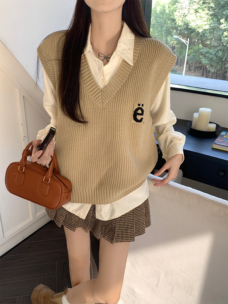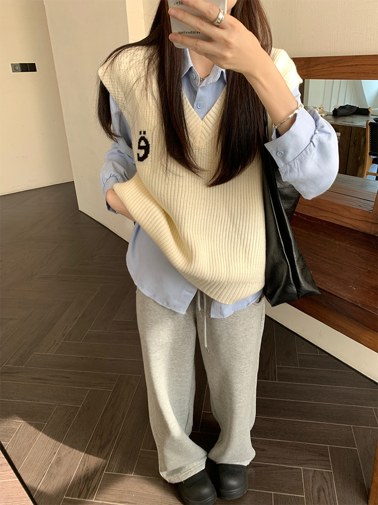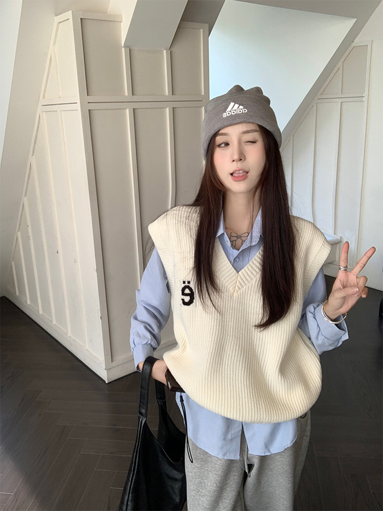 알파벳 자카드 V넥 민소매 니트 조끼 여성 봄 한국식 칼리지 스타일 웨이스트 밴드 쌓인 외부 조끼